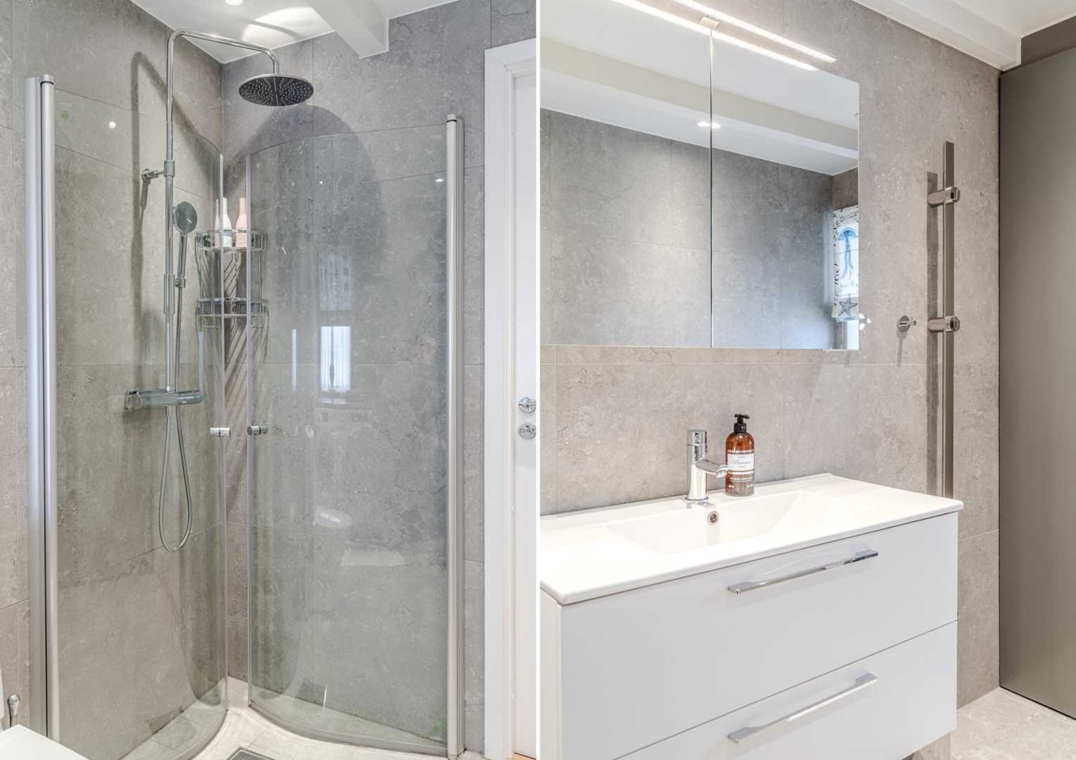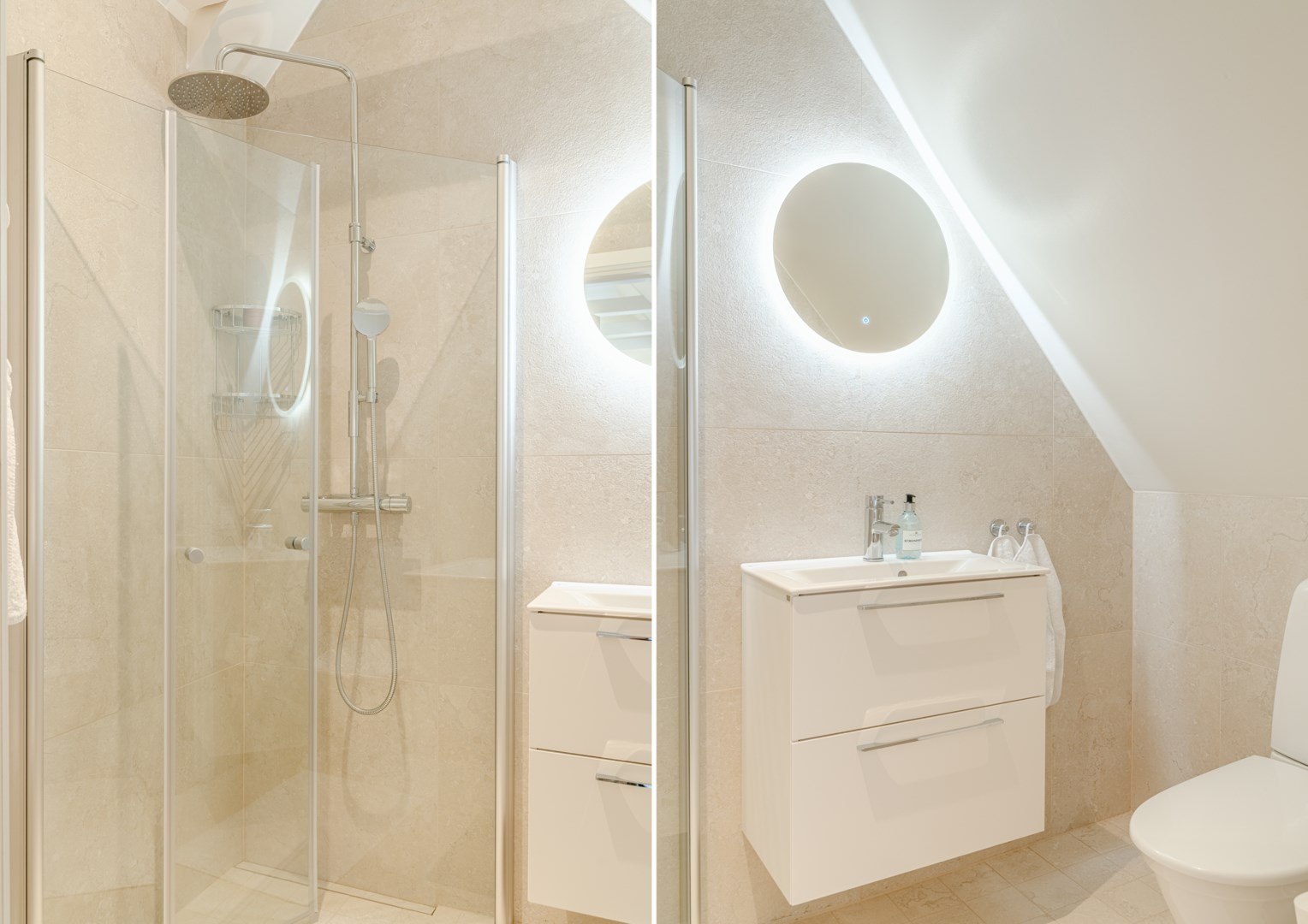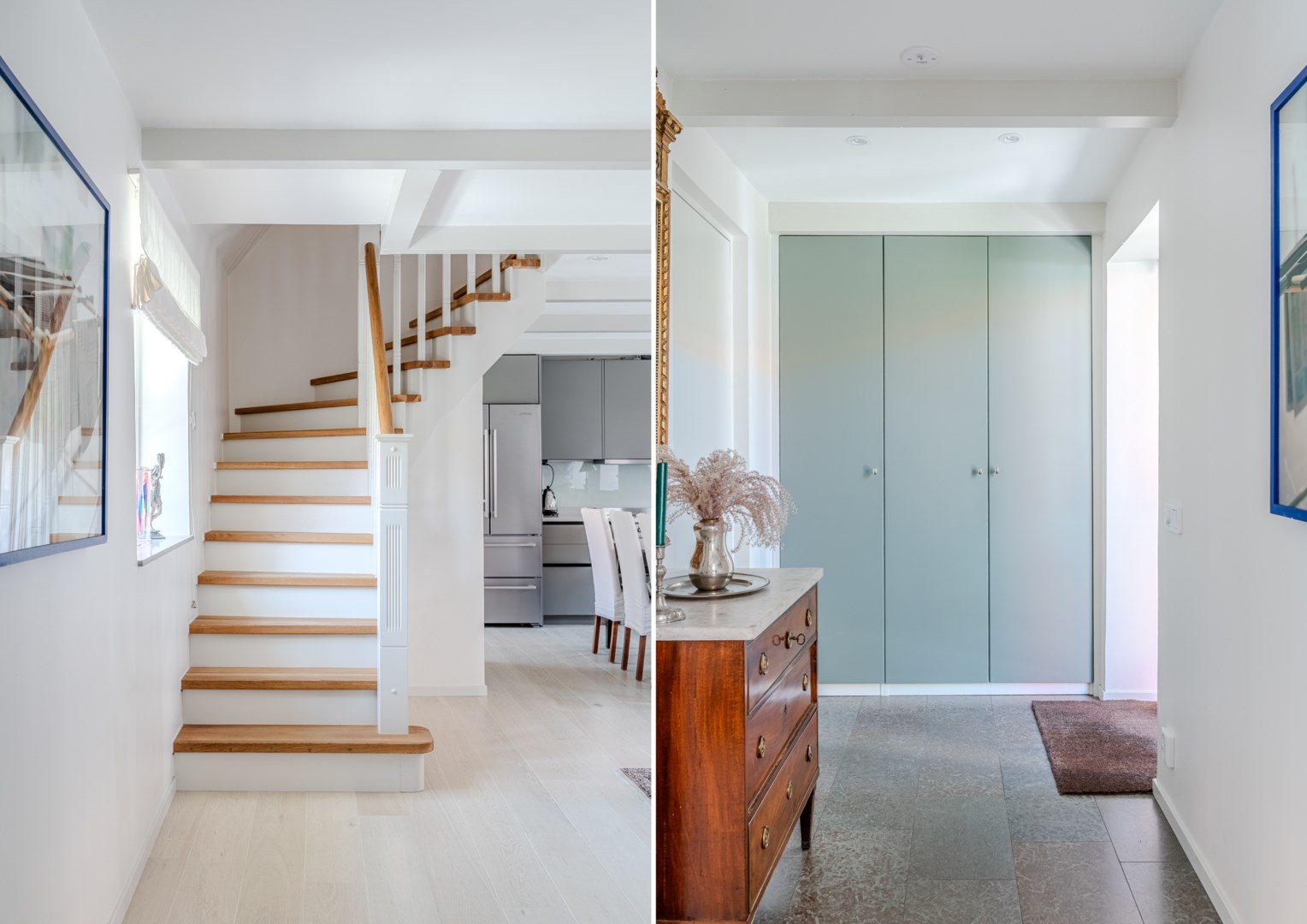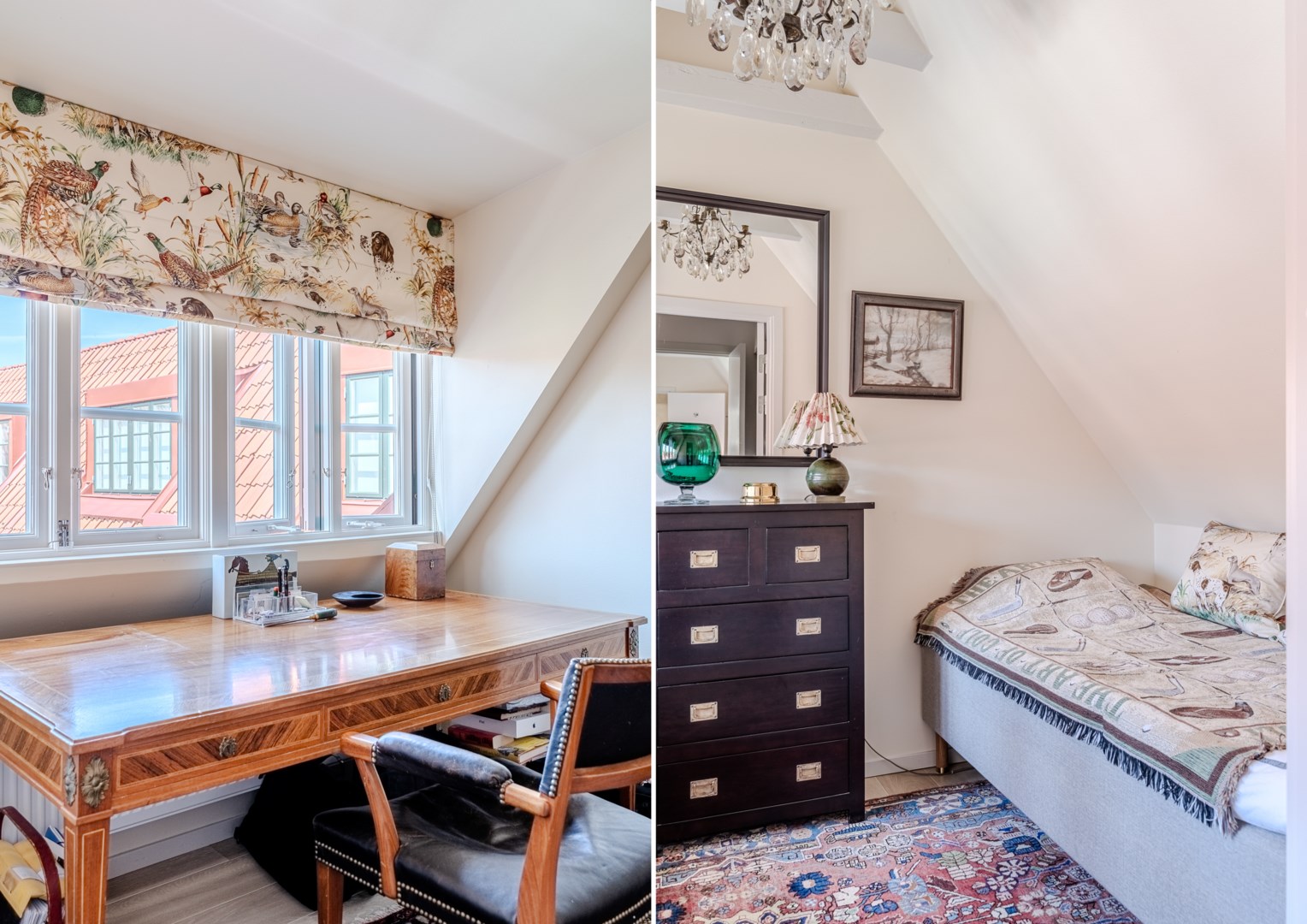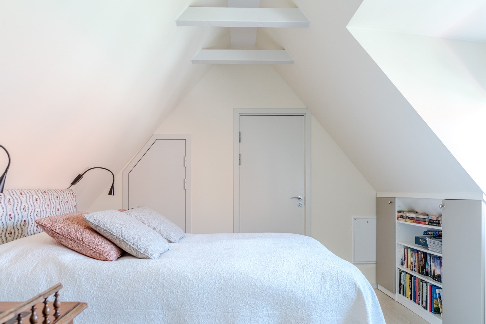 En trappa upp återfinns hall med garderob och master bedroom till höger. Härifrån ges en fin vy över gården och rummet rymmer såväl dubbelsäng som läshörna och skrivbord. I direkt anslutning ligger välplanerad wc/dusch och klädkammare. På motsatta sidan ligger ännu ett sovrum och även detta har fin gårdsvy.