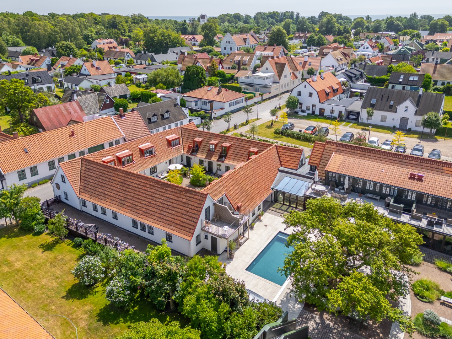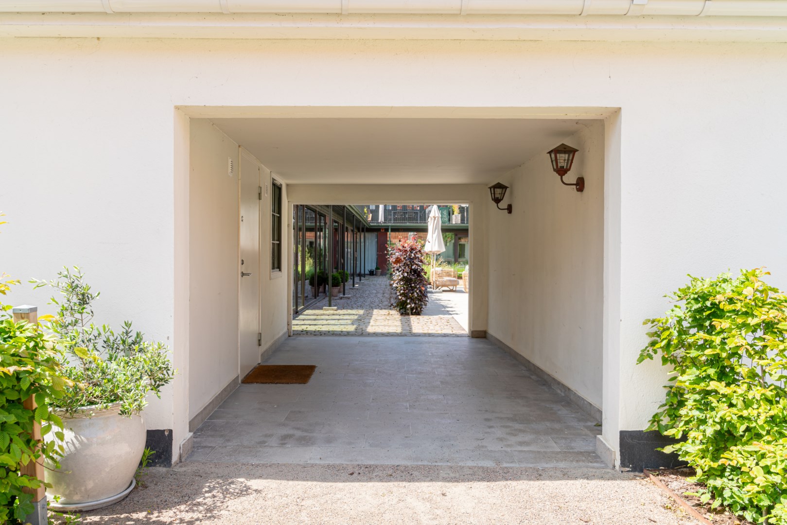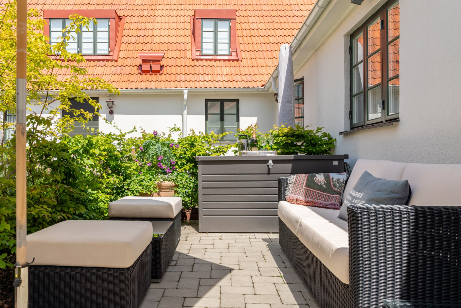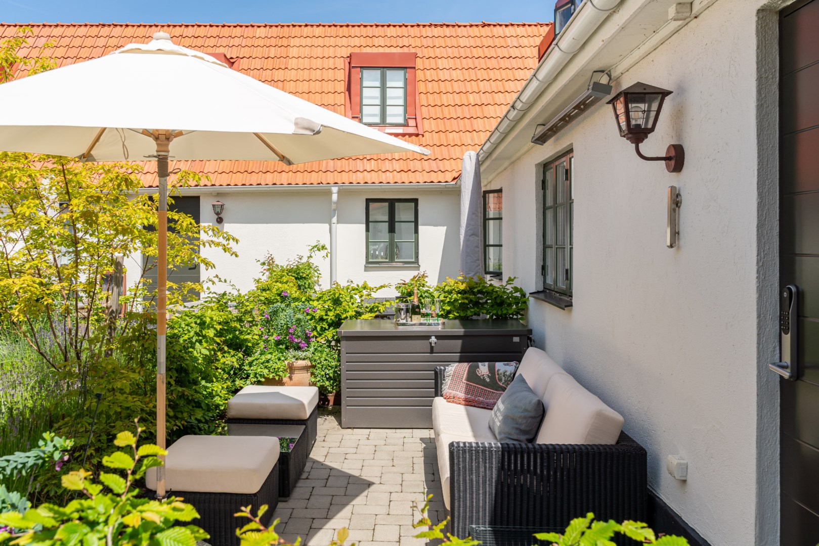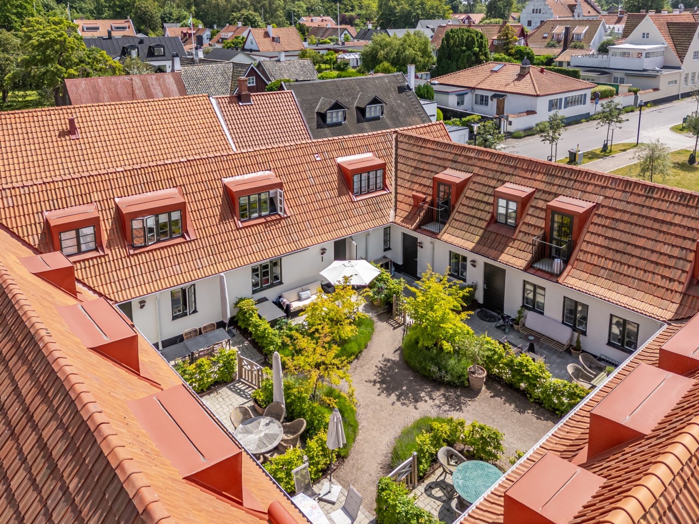 Mitt bland de äldre gatorna i Falsterbos stadkärna ligger BRF Norregård vid Gröna Torg. Genom inbjudande entré, inklädd i koppar, välkomnas man in till innergårdarna med härlig grönska, pool och väldesignade sittgrupper. Den aktuella lägenheten har ett lugnt läge på innergården med anor från 1700-talet. En tydlig känsla av gatuhus med egen uteplats i väster och direkt entré från utemiljön. Markuteplatsen rymmer bl. a. loungegrupp och utgör en utmärkt förlängning av bostaden. Hallen har garderober för klädavhängning och öppnar upp mot allrum och kök i öppen planlösning. Köket är L-format och har utrustats med större spis från Smeg och en väldesignad kyl/frys från samma leverantör. Genomgående ytor med ljusinsläpp från både öster och väster. Det finns en platsbyggd, liten soffa vid ett av fönstren och generös matplats. I rummets förlängning följer sittgrupp i allrumsdelen. Entréplanet har också badrum med dusch och tvättmöjlighet.