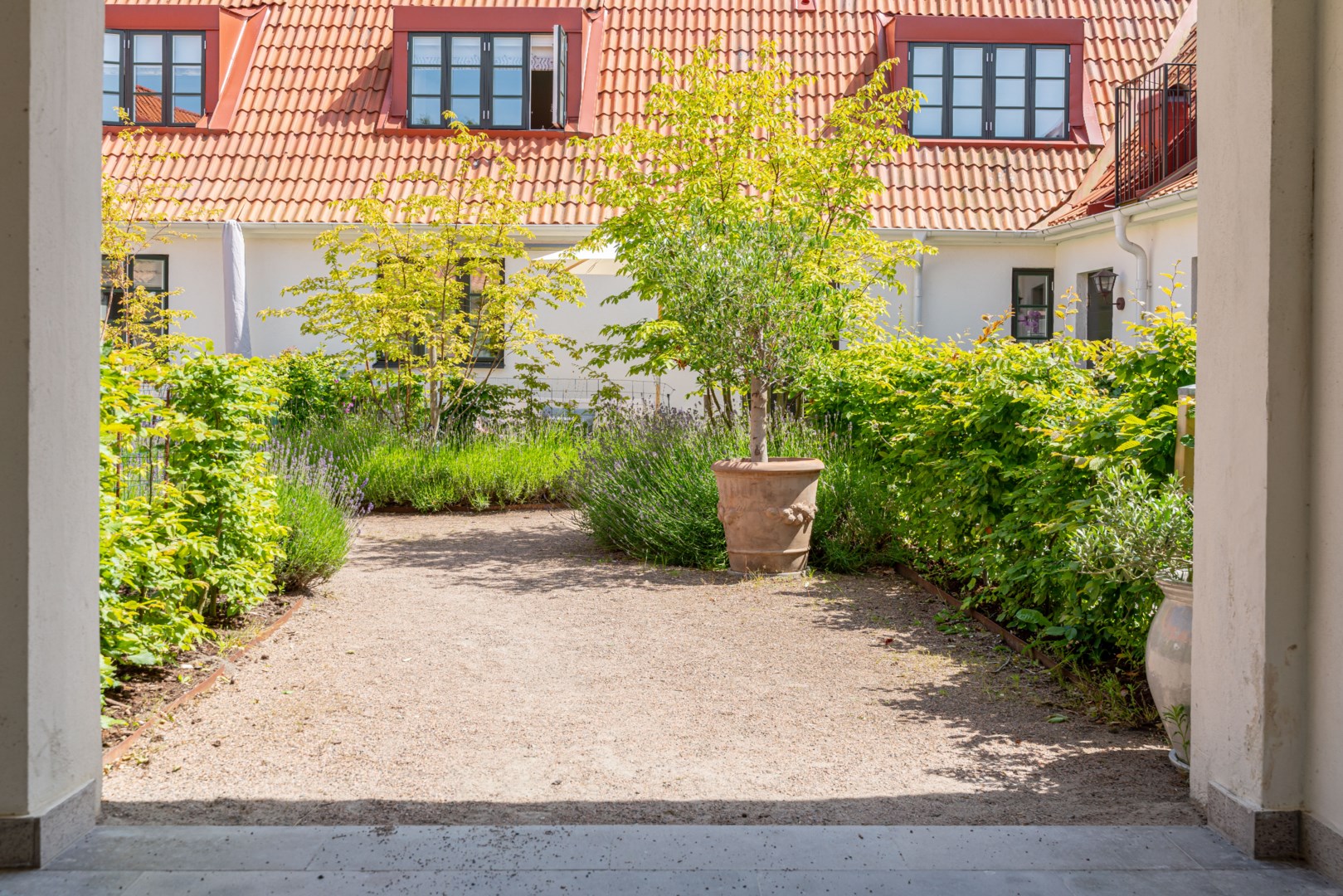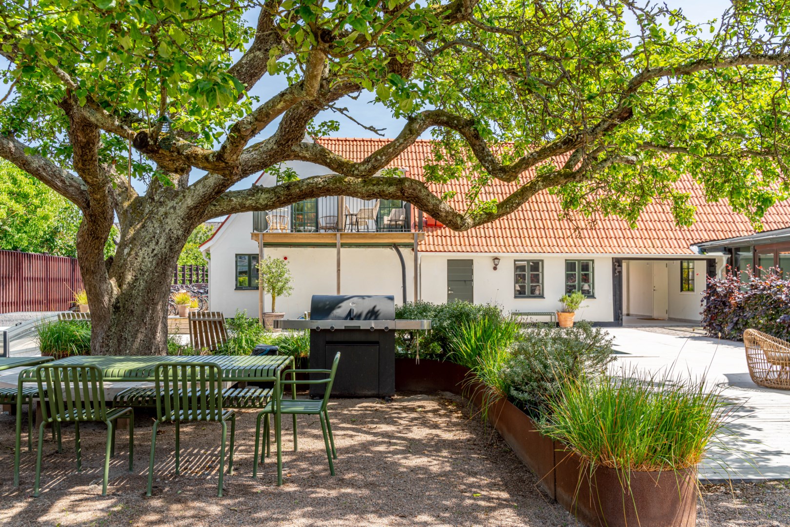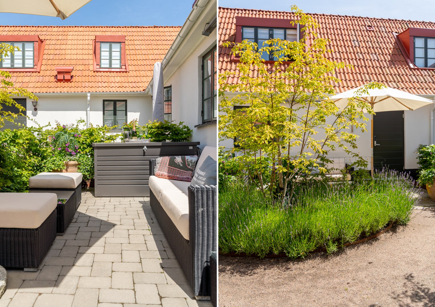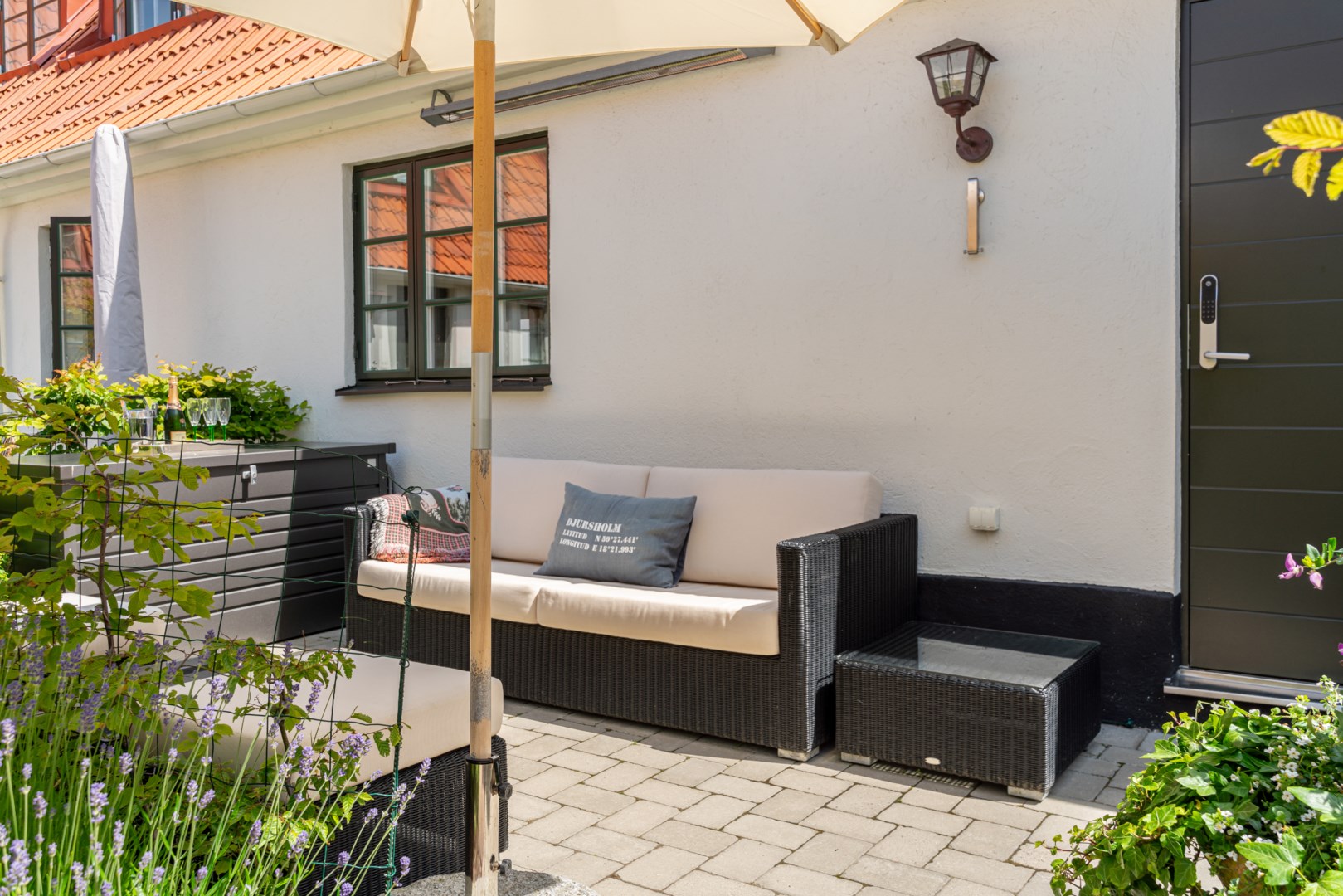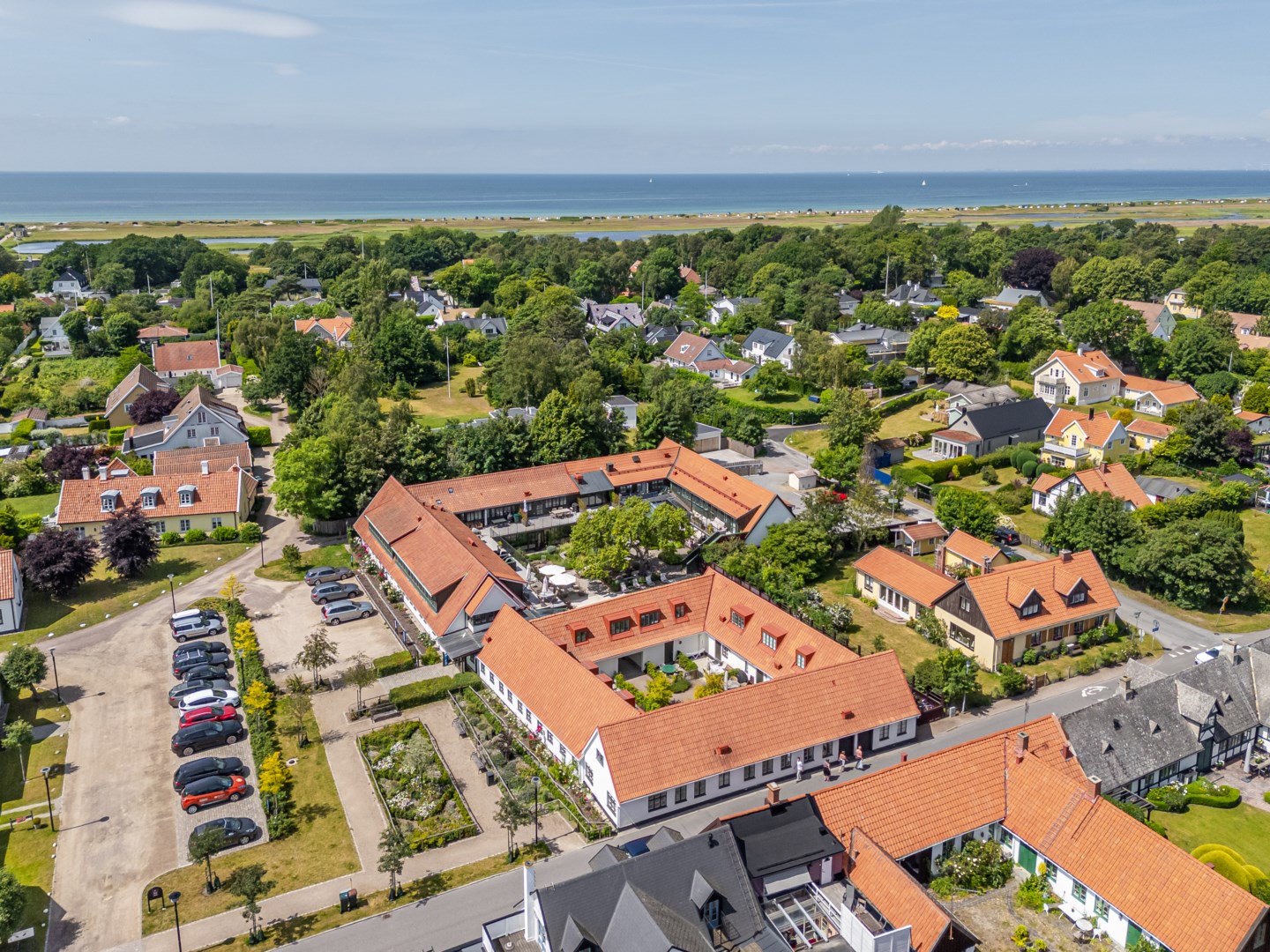 Mitt bland de äldre gatorna i Falsterbos stadkärna ligger BRF Norregård vid Gröna Torg. Genom inbjudande entré, inklädd i koppar, välkomnas man in till innergårdarna med härlig grönska, pool och väldesignade sittgrupper. Den aktuella lägenheten har ett lugnt läge på innergården med anor från 1700-talet. En tydlig känsla av gatuhus med egen uteplats i väster och direkt entré från utemiljön. Markuteplatsen rymmer bl. a. loungegrupp och utgör en utmärkt förlängning av bostaden. Hallen har garderober för klädavhängning och öppnar upp mot allrum och kök i öppen planlösning. Köket är L-format och har utrustats med större spis från Smeg och en väldesignad kyl/frys från samma leverantör. Genomgående ytor med ljusinsläpp från både öster och väster. Det finns en platsbyggd, liten soffa vid ett av fönstren och generös matplats. I rummets förlängning följer sittgrupp i allrumsdelen. Entréplanet har också badrum med dusch och tvättmöjlighet.