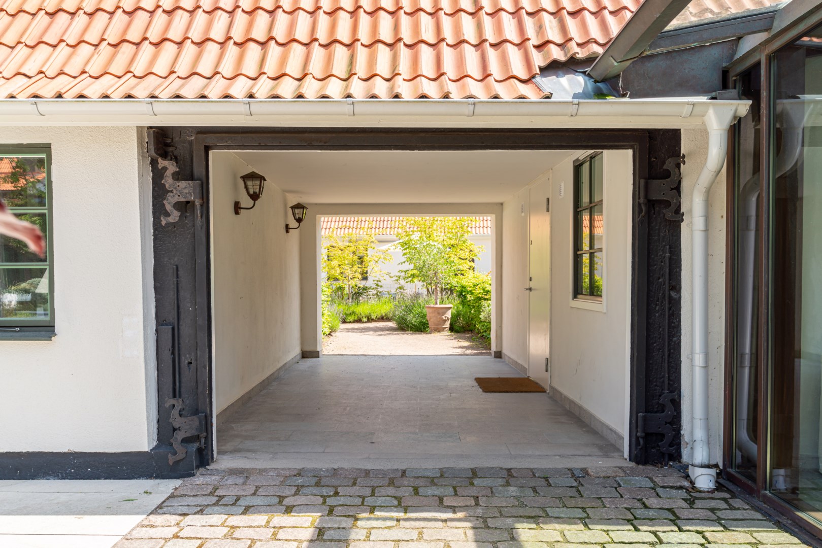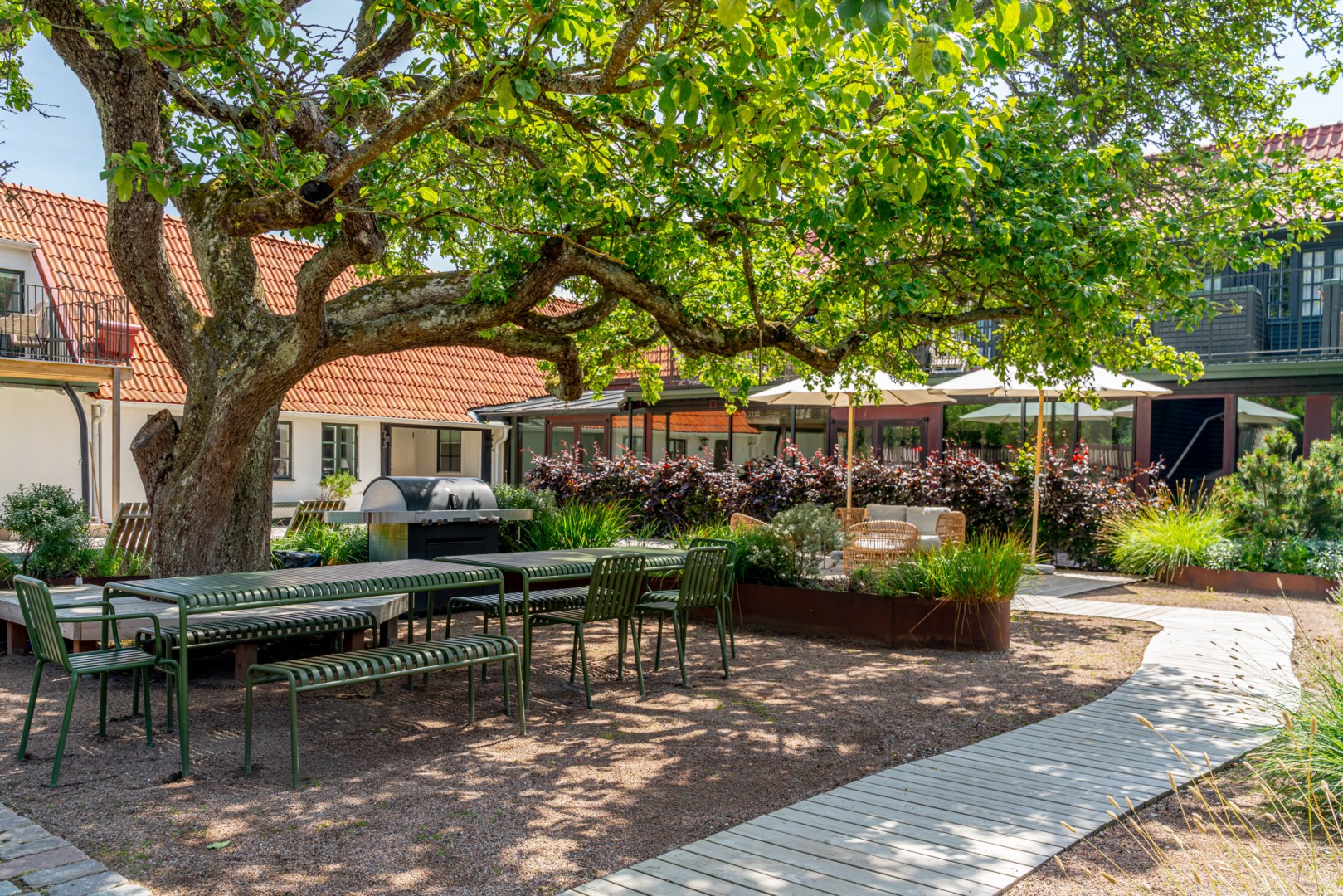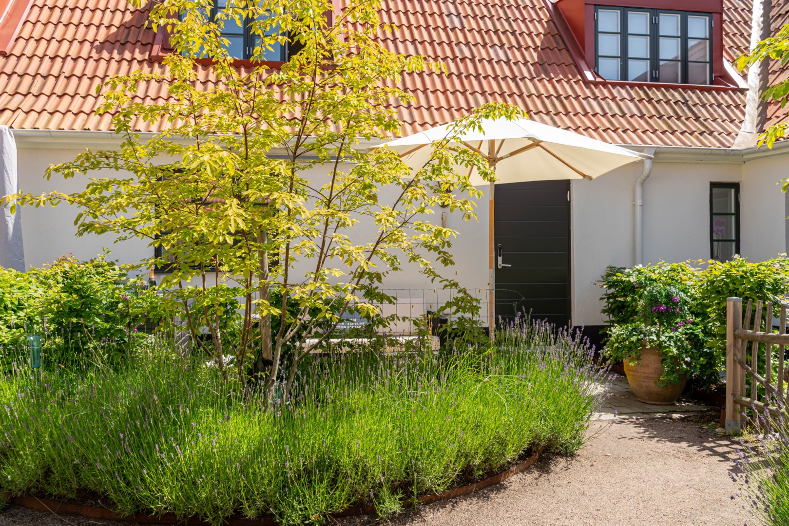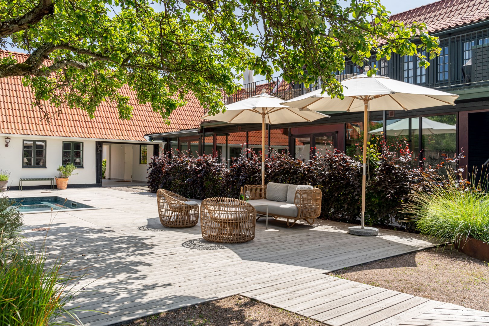 Mitt bland de äldre gatorna i Falsterbos stadkärna ligger BRF Norregård vid Gröna Torg. Genom inbjudande entré, inklädd i koppar, välkomnas man in till innergårdarna med härlig grönska, pool och väldesignade sittgrupper. Den aktuella lägenheten har ett lugnt läge på innergården med anor från 1700-talet. En tydlig känsla av gatuhus med egen uteplats i väster och direkt entré från utemiljön. Markuteplatsen rymmer bl. a. loungegrupp och utgör en utmärkt förlängning av bostaden. Hallen har garderober för klädavhängning och öppnar upp mot allrum och kök i öppen planlösning. Köket är L-format och har utrustats med större spis från Smeg och en väldesignad kyl/frys från samma leverantör. Genomgående ytor med ljusinsläpp från både öster och väster. Det finns en platsbyggd, liten soffa vid ett av fönstren och generös matplats. I rummets förlängning följer sittgrupp i allrumsdelen. Entréplanet har också badrum med dusch och tvättmöjlighet.