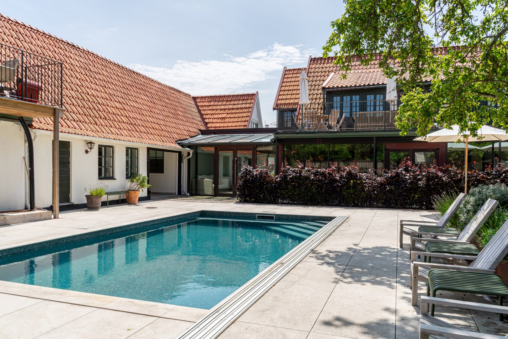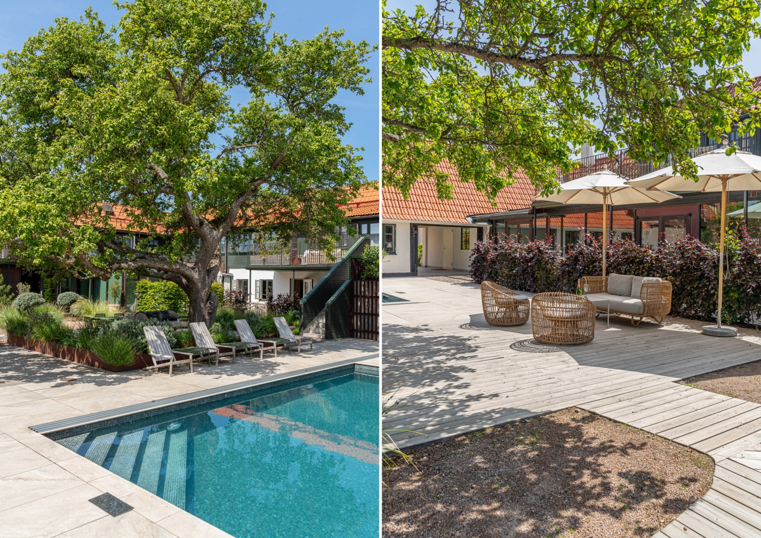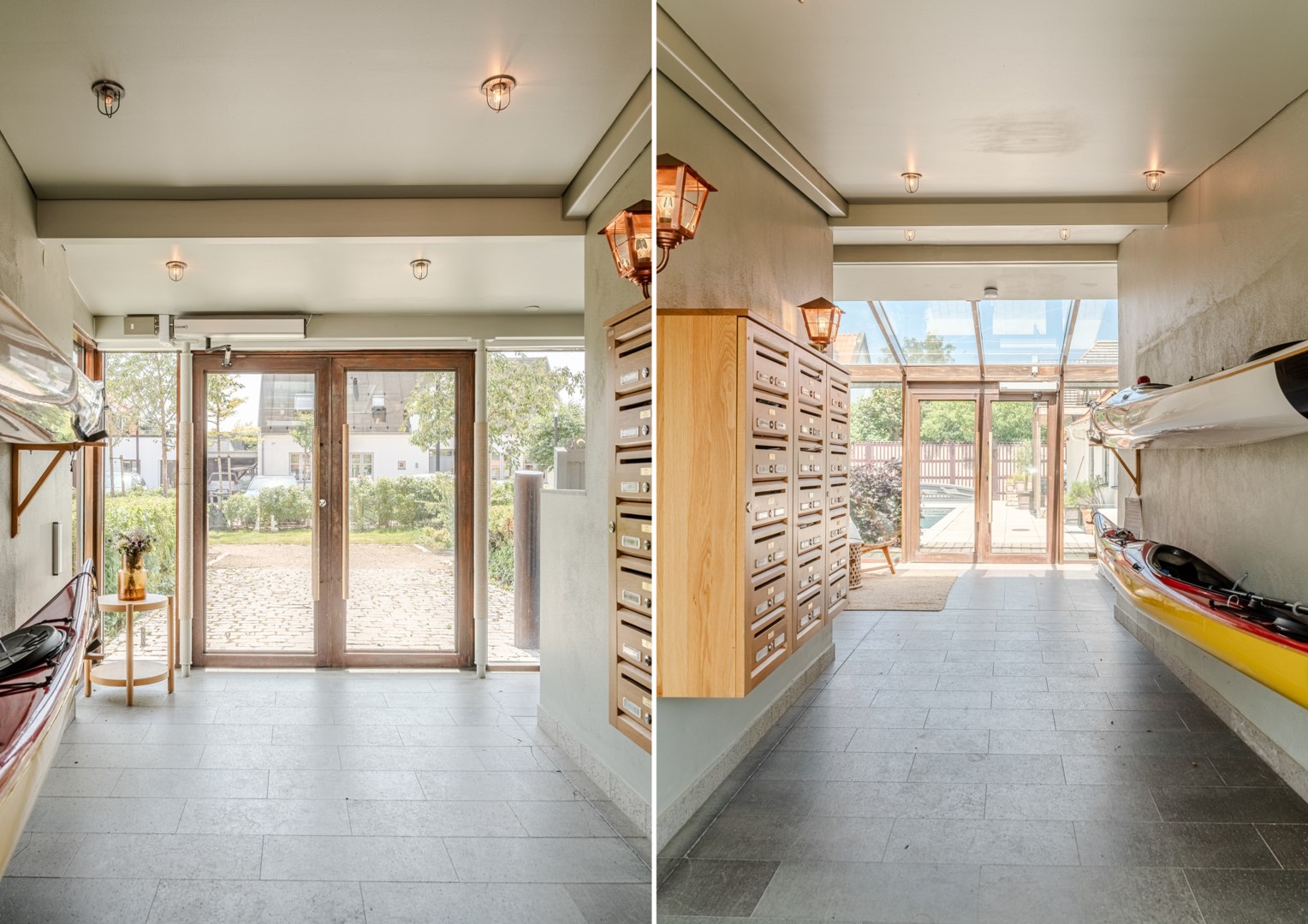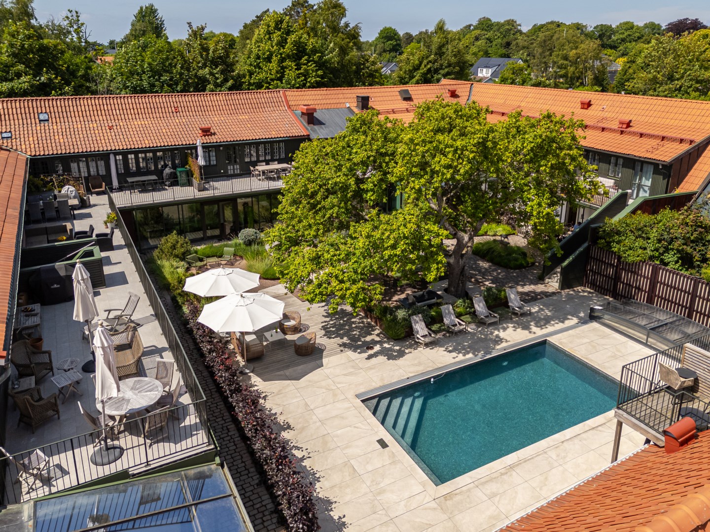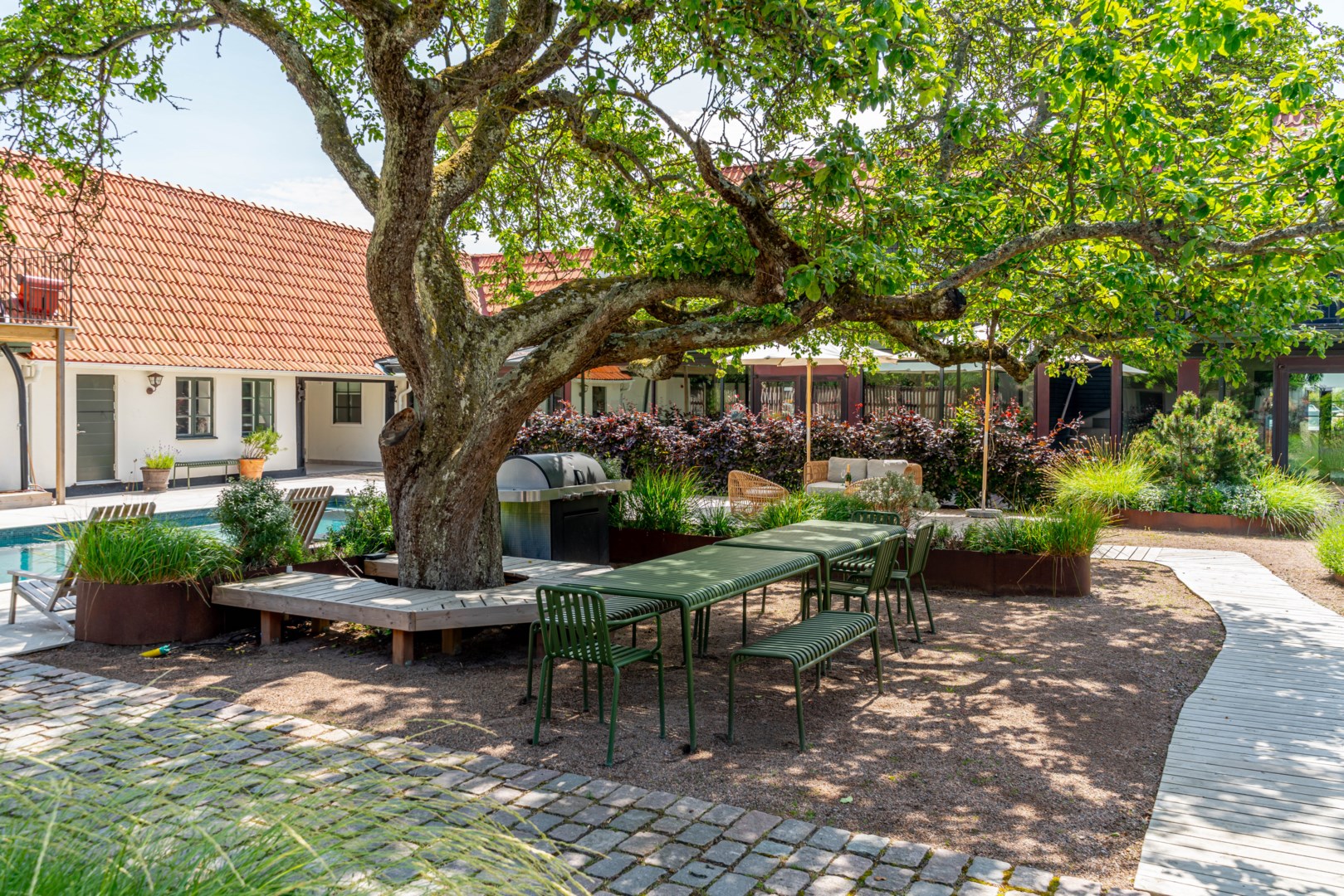 Mitt bland de äldre gatorna i Falsterbos stadkärna ligger BRF Norregård vid Gröna Torg. Genom inbjudande entré, inklädd i koppar, välkomnas man in till innergårdarna med härlig grönska, pool och väldesignade sittgrupper. Den aktuella lägenheten har ett lugnt läge på innergården med anor från 1700-talet. En tydlig känsla av gatuhus med egen uteplats i väster och direkt entré från utemiljön. Markuteplatsen rymmer bl. a. loungegrupp och utgör en utmärkt förlängning av bostaden. Hallen har garderober för klädavhängning och öppnar upp mot allrum och kök i öppen planlösning. Köket är L-format och har utrustats med större spis från Smeg och en väldesignad kyl/frys från samma leverantör. Genomgående ytor med ljusinsläpp från både öster och väster. Det finns en platsbyggd, liten soffa vid ett av fönstren och generös matplats. I rummets förlängning följer sittgrupp i allrumsdelen. Entréplanet har också badrum med dusch och tvättmöjlighet.