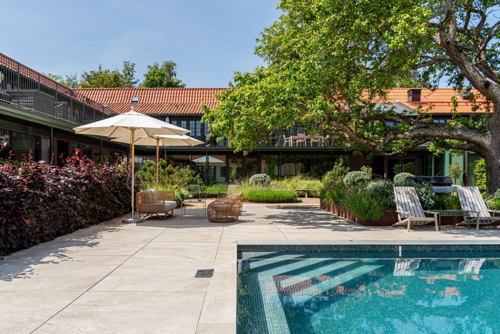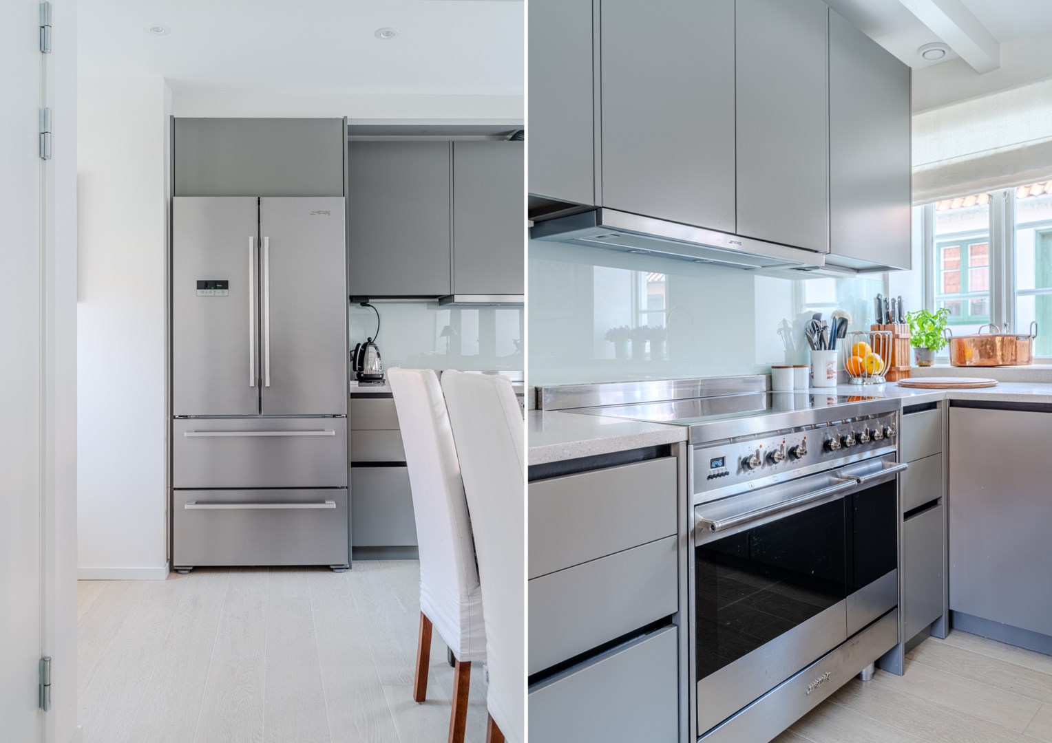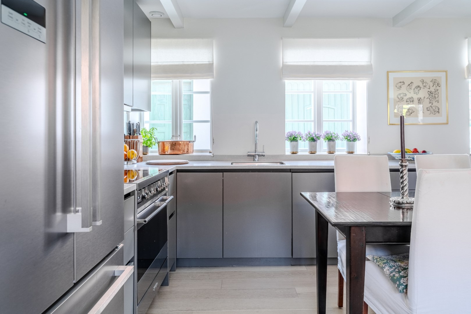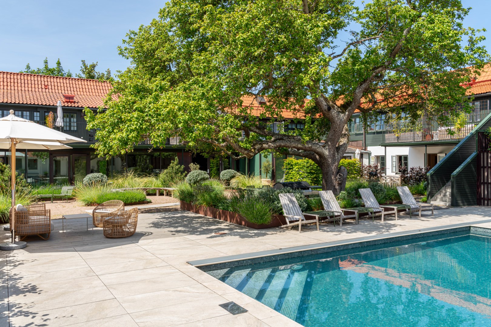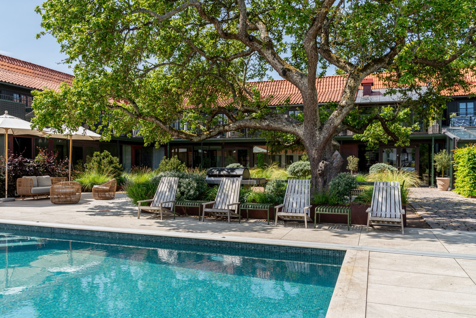 Mitt bland de äldre gatorna i Falsterbos stadkärna ligger BRF Norregård vid Gröna Torg. Genom inbjudande entré, inklädd i koppar, välkomnas man in till innergårdarna med härlig grönska, pool och väldesignade sittgrupper. Den aktuella lägenheten har ett lugnt läge på innergården med anor från 1700-talet. En tydlig känsla av gatuhus med egen uteplats i väster och direkt entré från utemiljön. Markuteplatsen rymmer bl. a. loungegrupp och utgör en utmärkt förlängning av bostaden. Hallen har garderober för klädavhängning och öppnar upp mot allrum och kök i öppen planlösning. Köket är L-format och har utrustats med större spis från Smeg och en väldesignad kyl/frys från samma leverantör. Genomgående ytor med ljusinsläpp från både öster och väster. Det finns en platsbyggd, liten soffa vid ett av fönstren och generös matplats. I rummets förlängning följer sittgrupp i allrumsdelen. Entréplanet har också badrum med dusch och tvättmöjlighet.