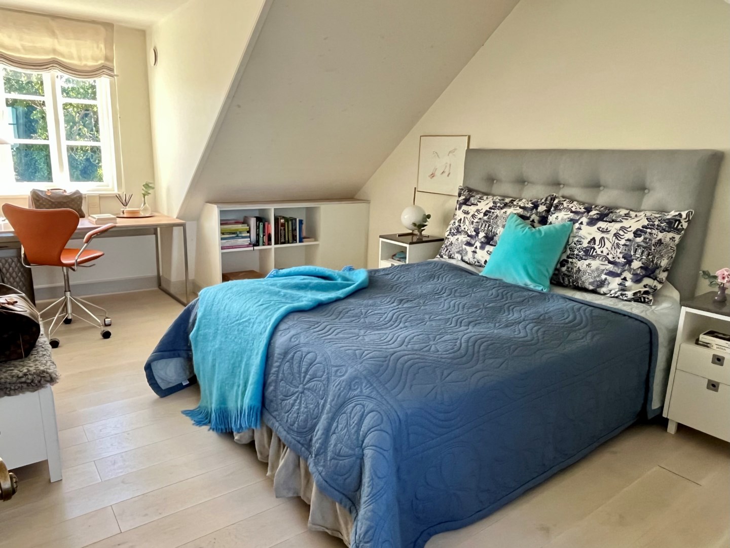 Övre plan: U-formad trappa i vitlaserad ek med ett mellanliggande vilplan, fönster, smäckra ledstänger i smide och välvda nedre trappsteg för maximal elegans. Uppe väntar en somrig övre hall/arbetsrum som också fyller funktionen av en walk-through-closet. Innertaket på övre plan är penselmålat i linoljefärg. Det ena sovrummet har platsbyggda bokhyllor, härligt ljusflöde iom fönster åt både öster och väster, samt plats för skrivbord och läsfåtölj. Dess intilliggande ensuite badrummet har både badkar, med välgörande utsikt, och duschnisch i mosaik med inbyggt duschsystem (osynlig duschstång och blandare), Montanakommod, vägghängd toalett och armatur i patinerad mässing från Vola. Det andra sovrummet är tillsammans med dess walk-in-closet stort nog att kunna delas av till ett tredje sovrum på övre plan. Även detta har fönster åt både öster och väster, samt ett eget ensuite badrum med inbyggd takdusch och inbyggd tvättställsblandare från Vola, kommodbänkskiva i sandfärgad sten och hänförande panoramautsikt över hav, stränder och möllan.