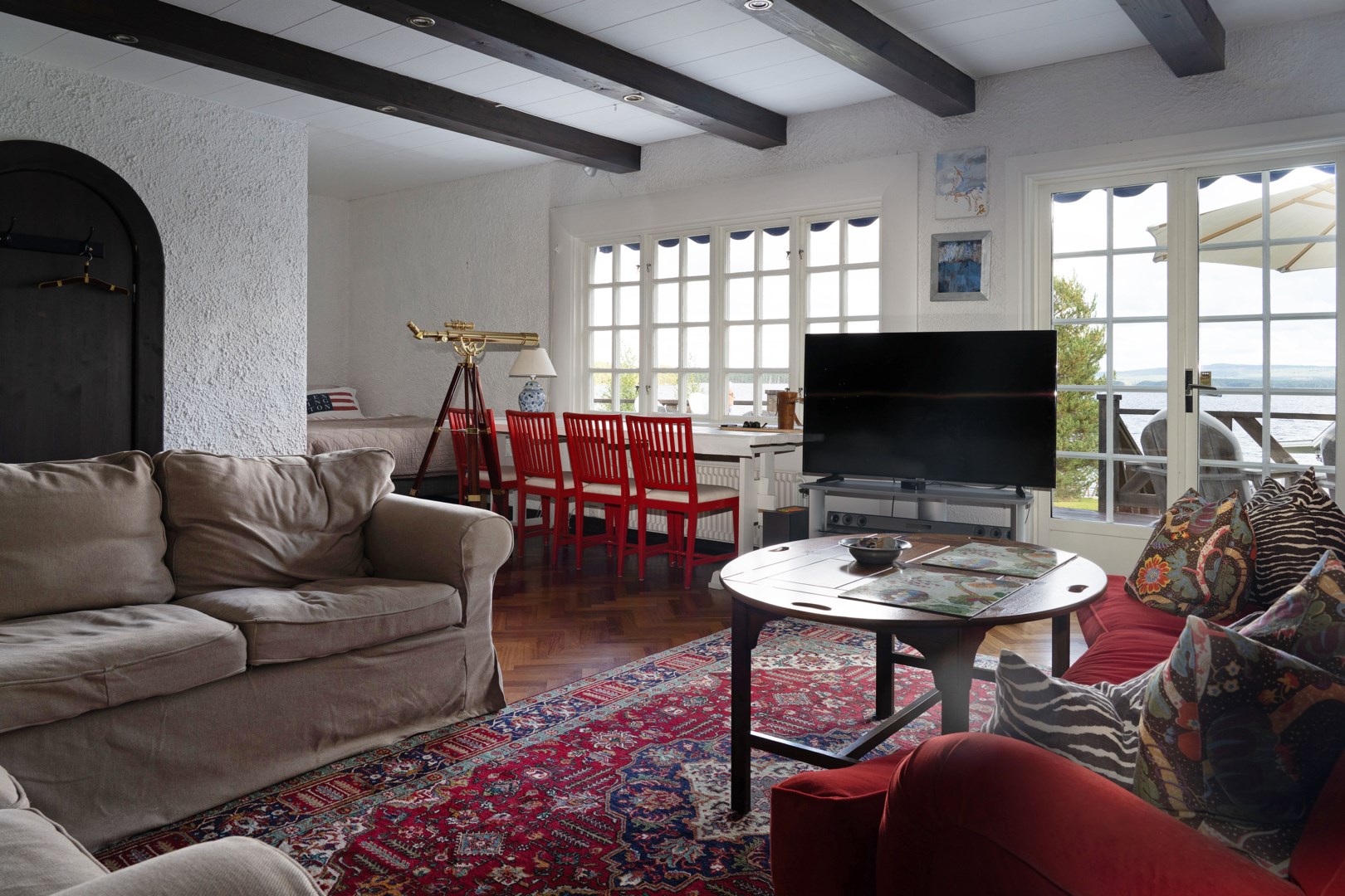 En liten trappa tar oss upp till husets entré som har plats plats för kläder och som har en gästtoalett. Här finns ett mycket generöst och ljust sällskapsrum med lågt bröstade och spröjsade fönster utmed husets sida mot vattnet, Sällskapsrummet rymmer såväl en stor soffgrupp som ett matsalsbord och har även en liten sovalkov. I taket finns infälld belysning i de vackra takbjälkarna och via pardörrar i glas nås den stora terrassen mot vattnet.