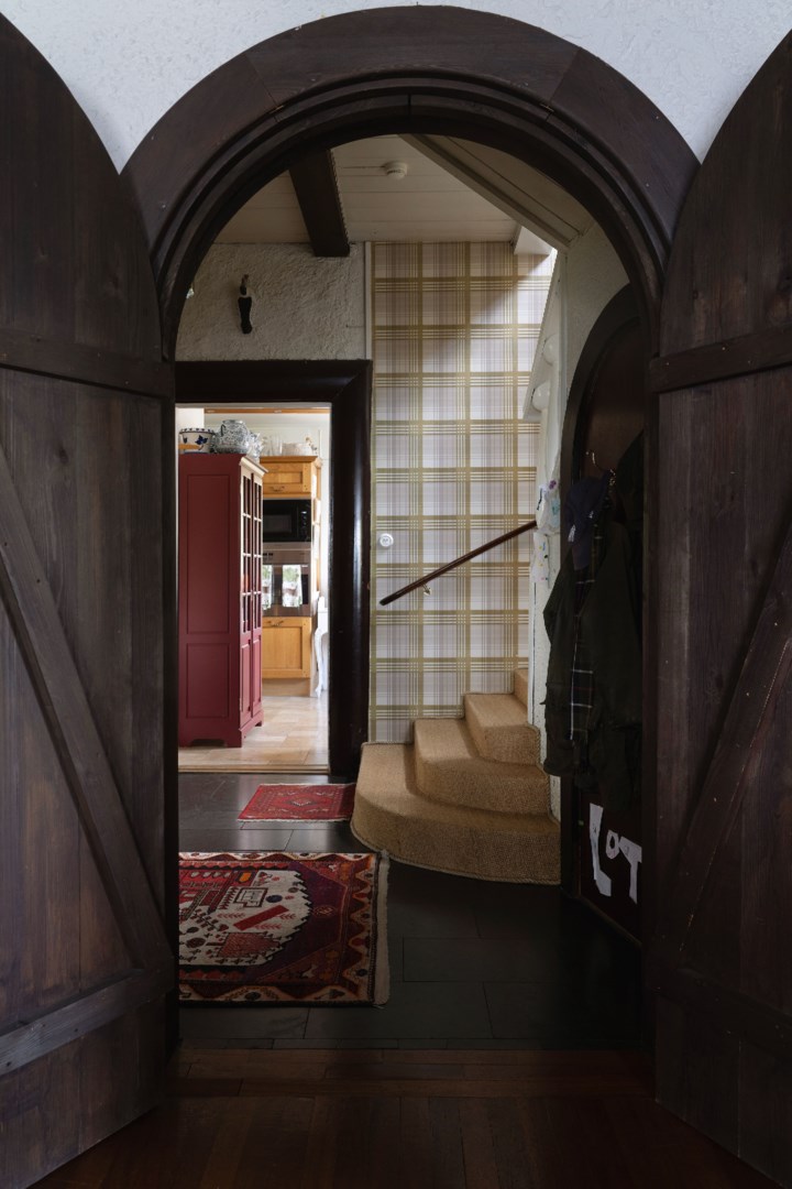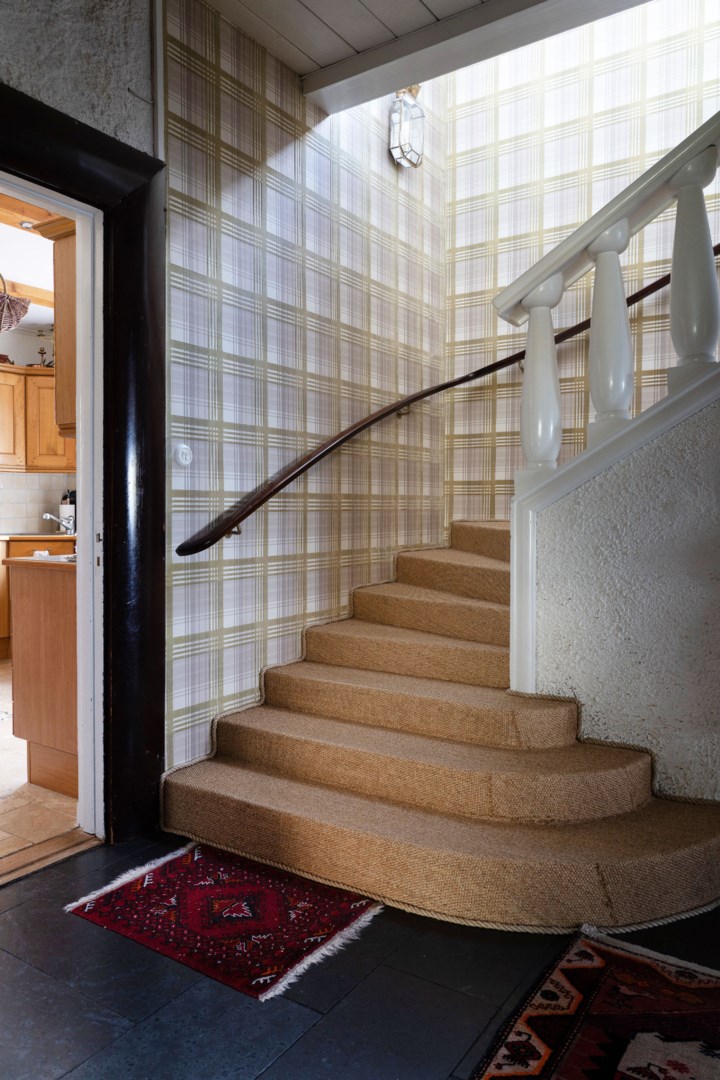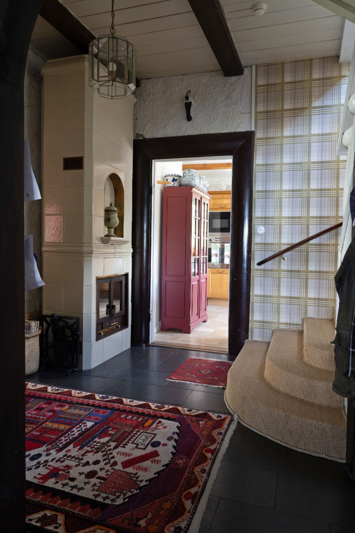Från sällskapsrummet nås en stilig inre hall med en kaklad eldstad och den mjukt svängda trappan upp till övre plan. Innanför hallen ligger ett stort kök med utrustning och förvaring utmed väggarna och med klinker på golvet. Köket har omedelbar access till matrummet som har ett dekorativt färgat, blyinfattat fönster med djup fönsternisch. Detta fönster härrör från Coventry Church utanför London. Här finns även en utgång till uteplats och trädgård.