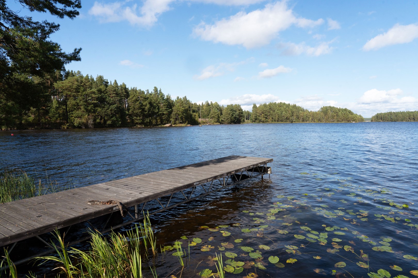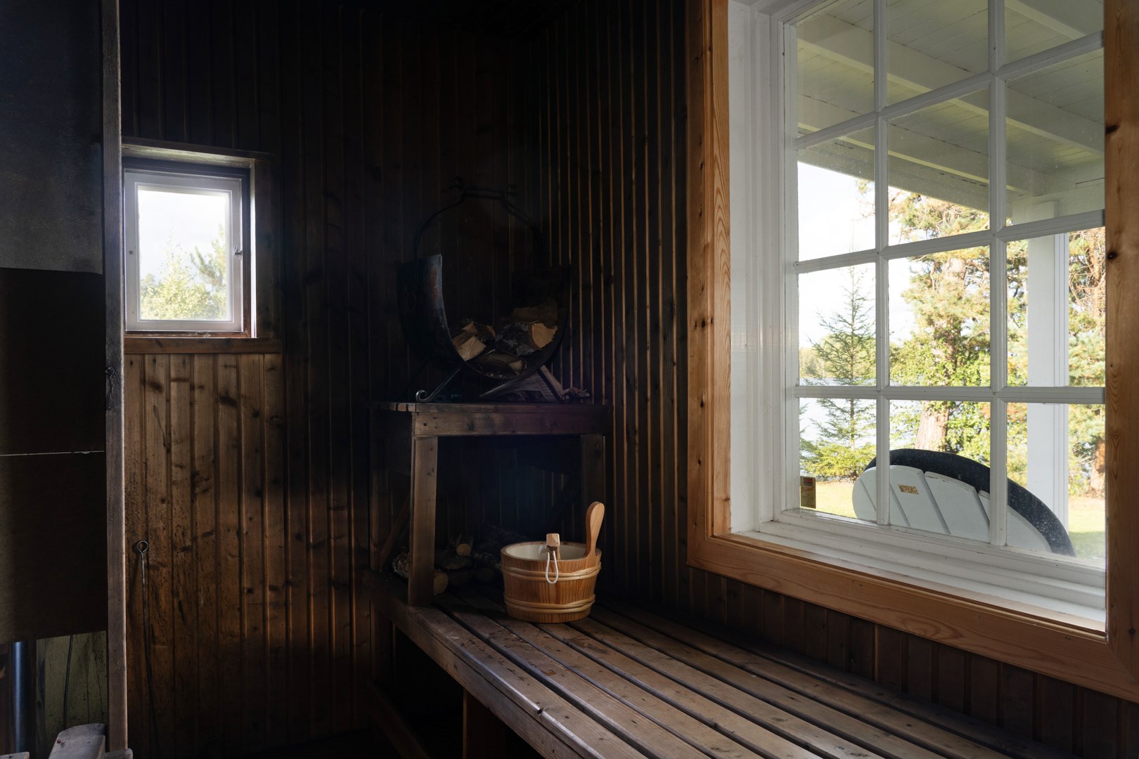 På andra sidan av tomten ligger den andra bryggan. Här finns även en sandstrand samt en trappa ner till vattnet. Några meter upp från strandkanten ligger sjöstugan med ett sovrum och en vedeldad bastu från vilka man blickar ut över vattnet. Sjöstugan har ny el och ny panel samt målades om 2024.
