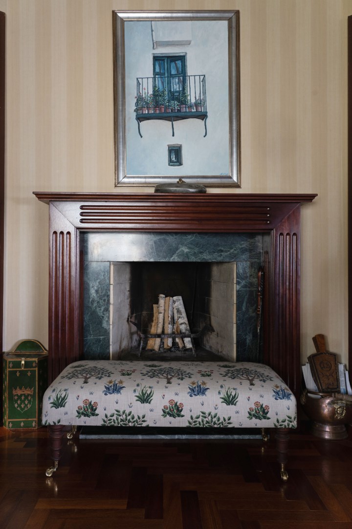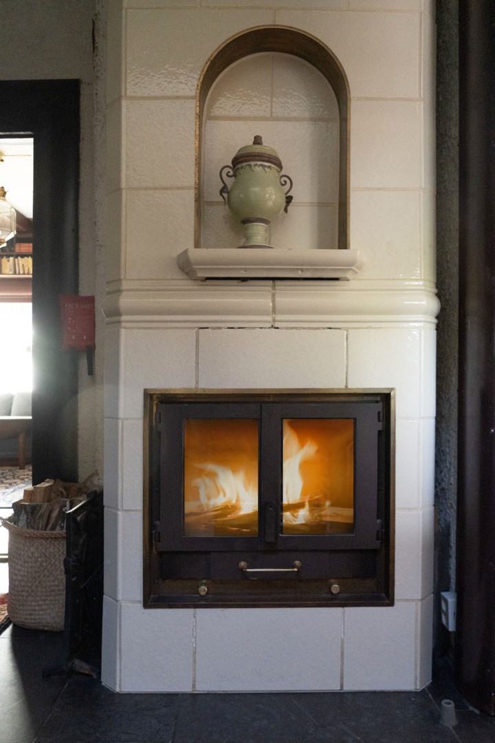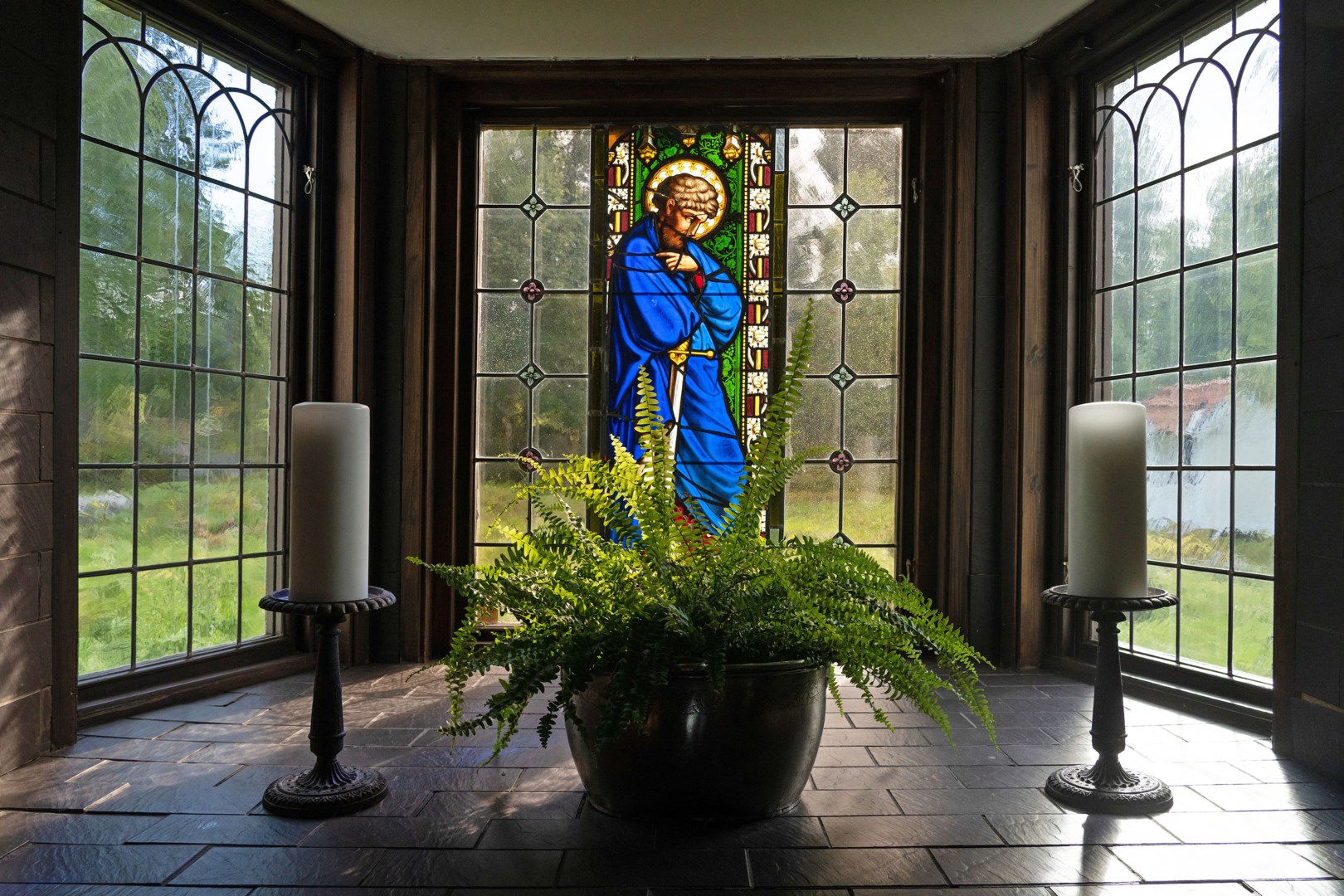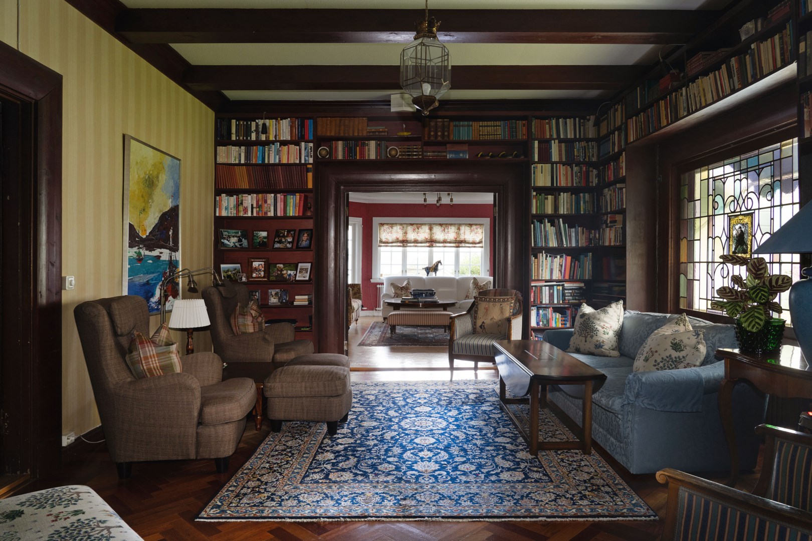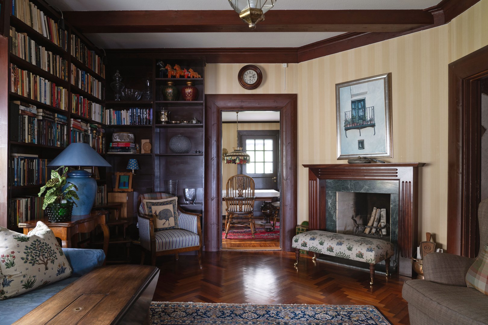 Matrummet ligger i fil med biblioteket/Tv-rummet som har platsbyggda hyllor, öppen spis med spiselkrans av marmor från Kolmården och ett än större dekorativt, färgat och blyinfattat glasfönster.