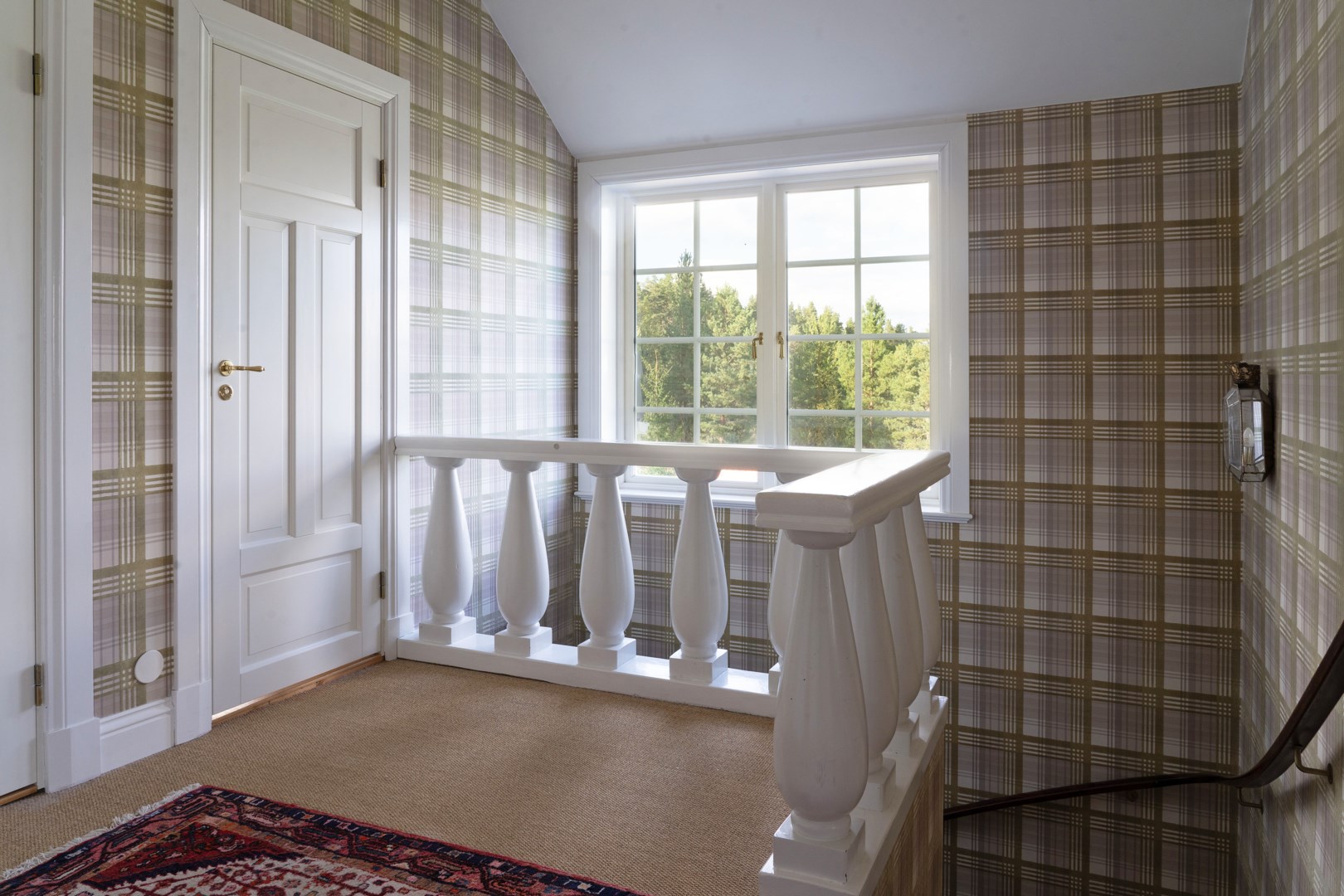 Samtliga rum i huset har stavparkett utom kök och hallar. En del har stavparkett av det lite mörkare slaget s k afrikansk stavparkett.