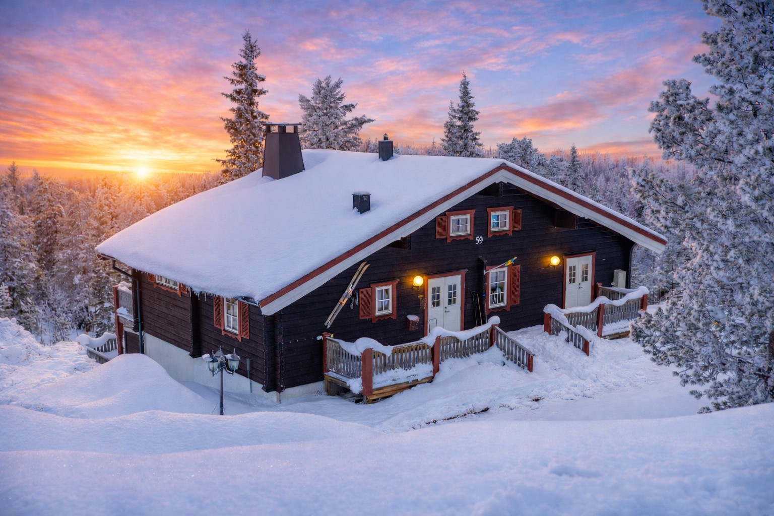 Med ett av Sälens bättre lägen ligger detta attraktiva fritidshus med plats för den stora familjen. Genomgående sociala ytor och separat uthyrningslägenhet om så önskas. Till huset hör skoterförråd.