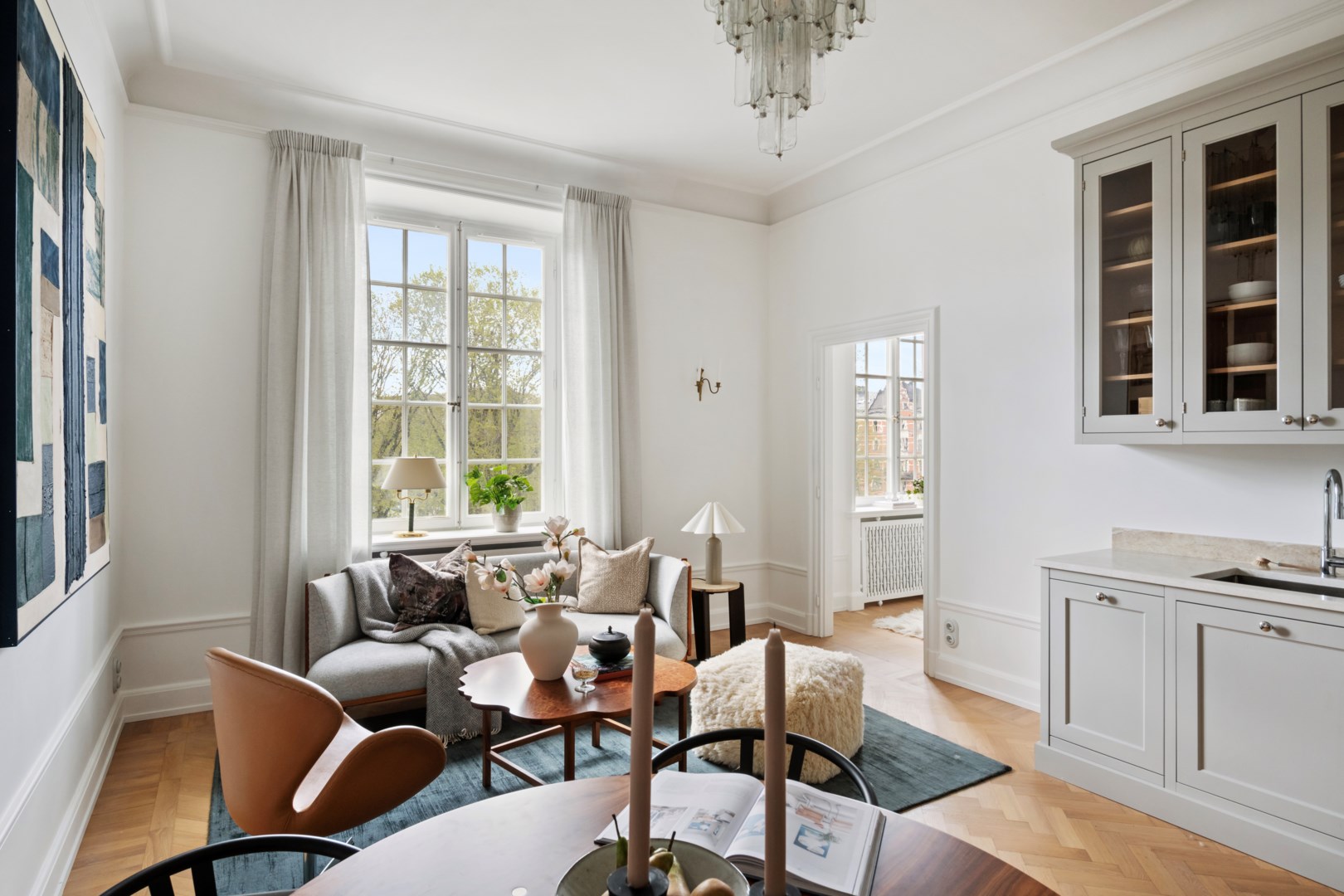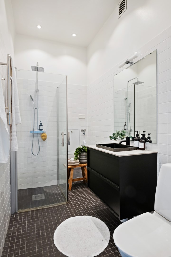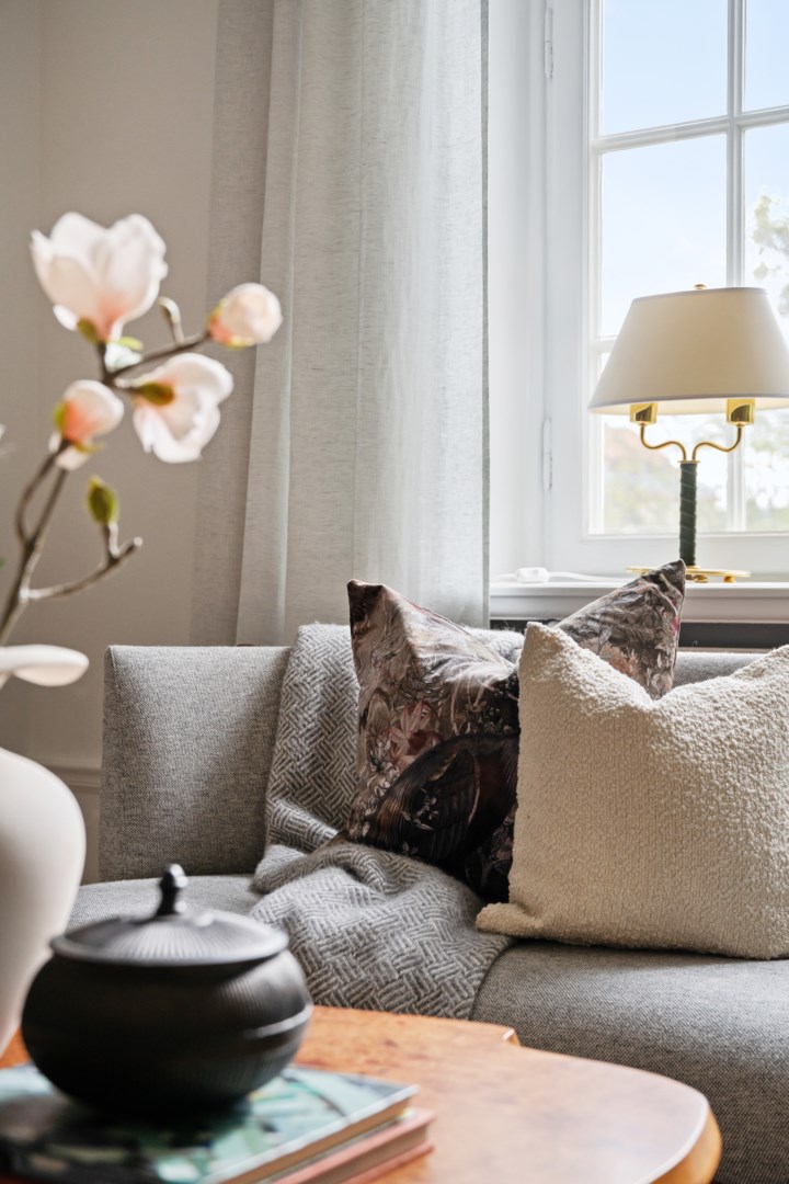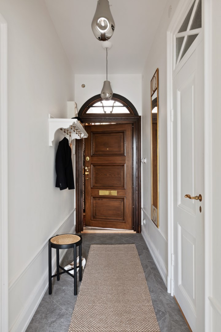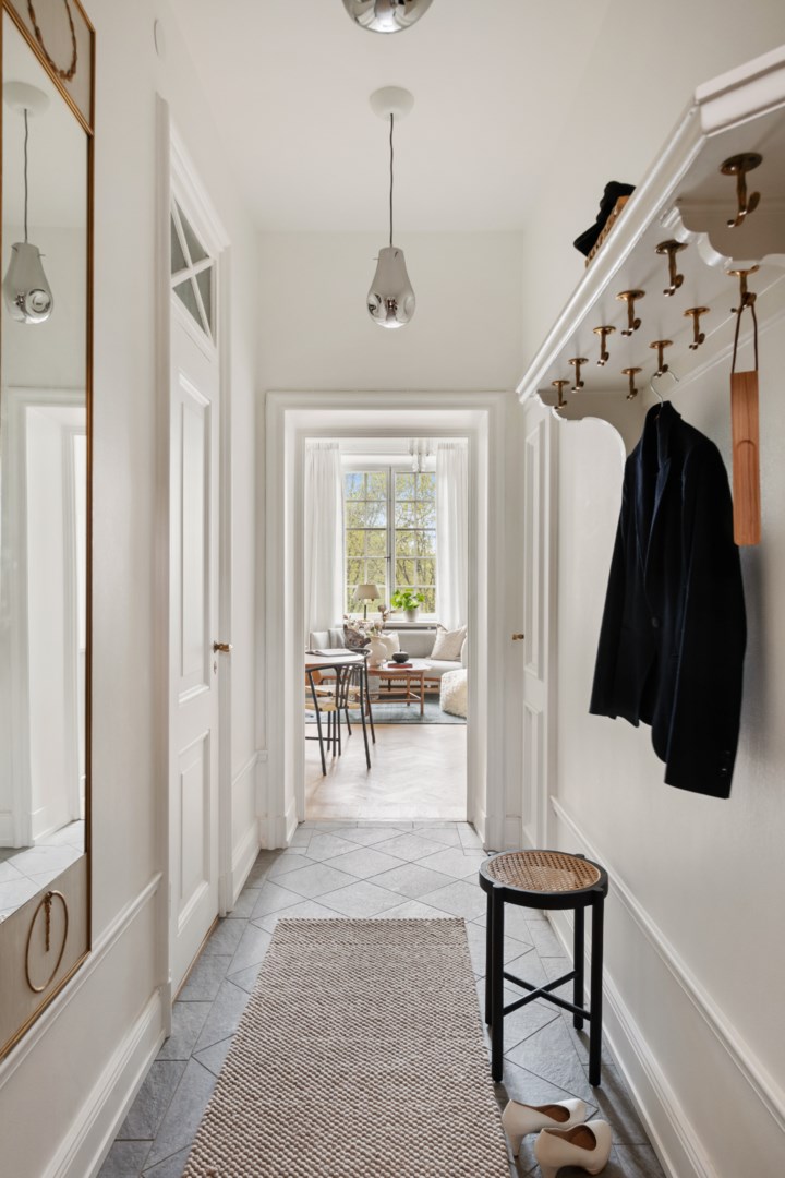 Lägenheten bevarar vackra detaljer från byggnadsåret såsom fiskbensparkett, höga golvsocklar, rundade hålkäl vid övergång mellan tak och vägg, dörrhandtag och spanjoletter. Efter modernisering av el nya eluttag och strömbrytare i porslin i tidstypisk stil. Ljus hall med hatthylla i original, stor inbyggd garderob och elegant stengolv välkomnar. Härligt sällskapsrum med högkvalitativt kök, matplats och vardagsrumsdel i öppen planlösning. Via spröjsade fönster fri utsikt över himmel och grönskande träd. Köket från Kvänum har gott om förvaring och arbetsytor, bred induktionshäll, bänkskiva och stänkskydd i natursten och vitvaror från Miele. Intill ett rymligt sovrum med gott om plats för stor dubbelsäng samt arbetsbord om så önskas. I anslutning en rymlig walk-in closet med hyllor, klädstänger och heltäckningsmatta. Ifrån hallen ett fint badrum med dusch och förberett för tvättmaskin.