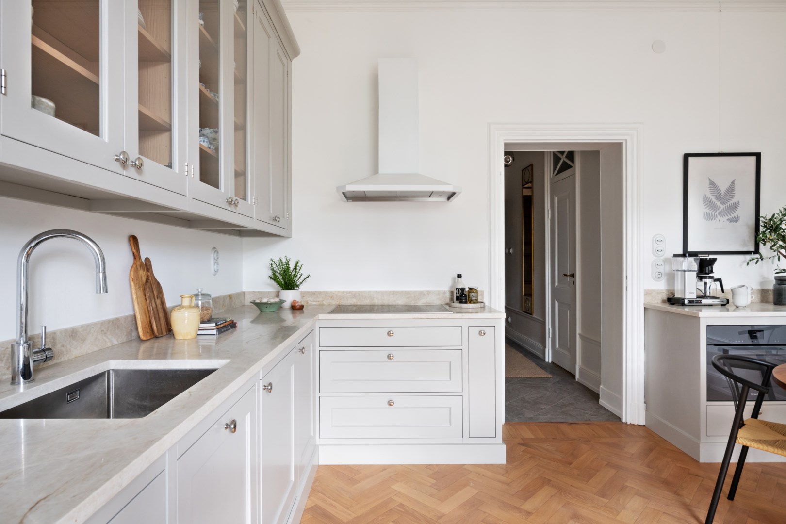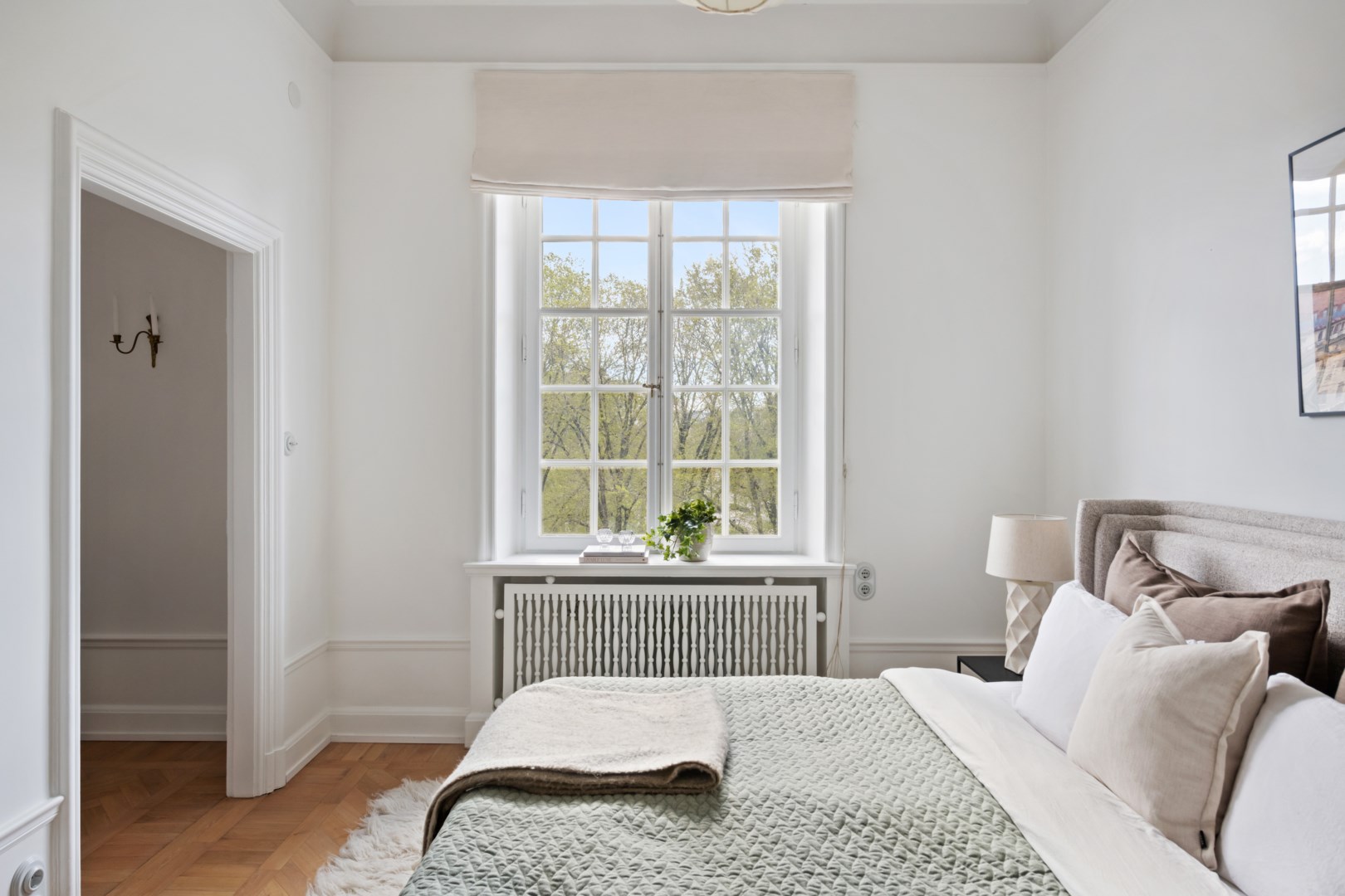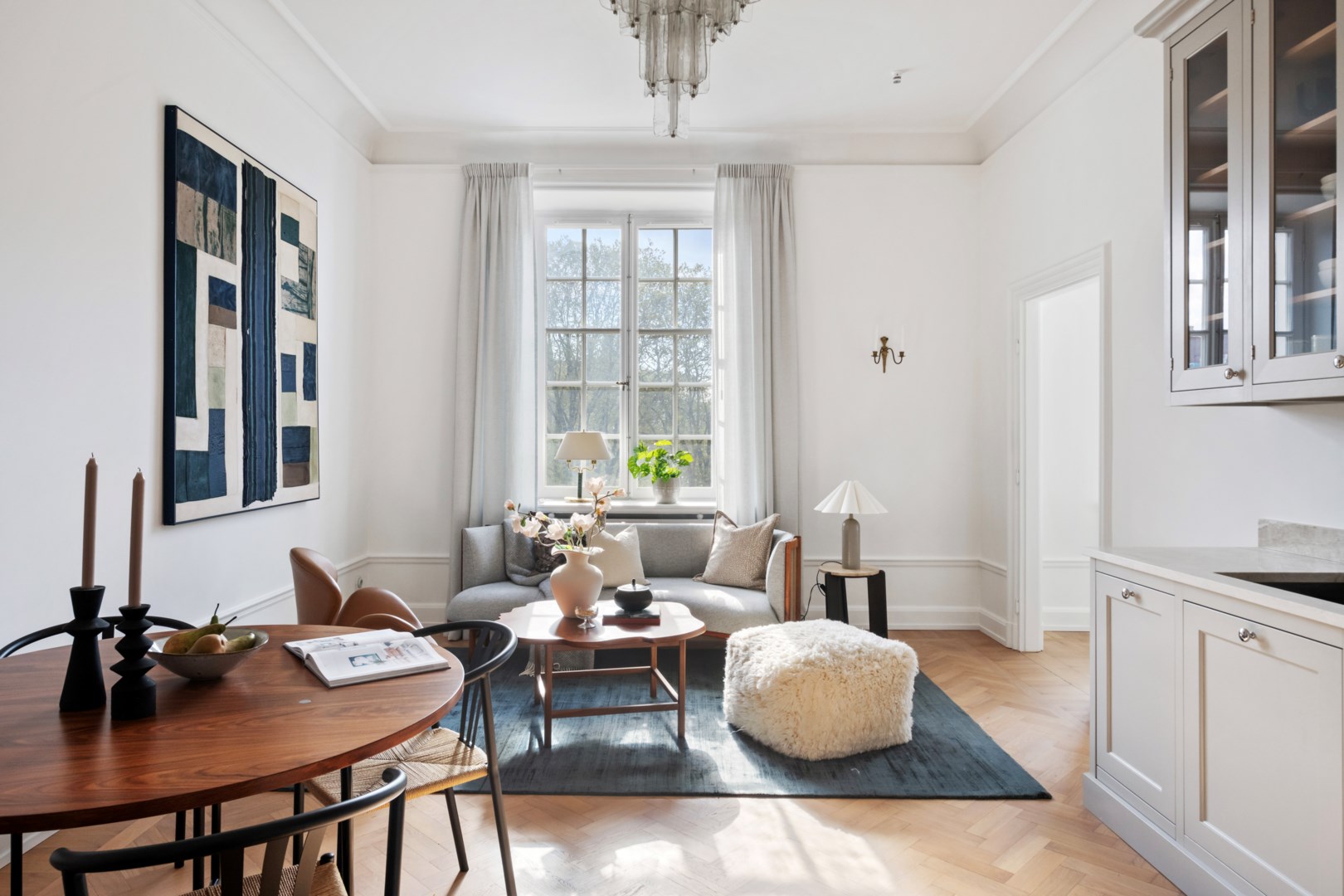Lägenheten bevarar vackra detaljer från byggnadsåret såsom fiskbensparkett, höga golvsocklar, rundade hålkäl vid övergång mellan tak och vägg, dörrhandtag och spanjoletter. Efter modernisering av el nya eluttag och strömbrytare i porslin i tidstypisk stil. Ljus hall med hatthylla i original, stor inbyggd garderob och elegant stengolv välkomnar. Härligt sällskapsrum med högkvalitativt kök, matplats och vardagsrumsdel i öppen planlösning. Via spröjsade fönster fri utsikt över himmel och grönskande träd. Köket från Kvänum har gott om förvaring och arbetsytor, bred induktionshäll, bänkskiva och stänkskydd i natursten och vitvaror från Miele. Intill ett rymligt sovrum med gott om plats för stor dubbelsäng samt arbetsbord om så önskas. I anslutning en rymlig walk-in closet med hyllor, klädstänger och heltäckningsmatta. Ifrån hallen ett fint badrum med dusch och förberett för tvättmaskin.