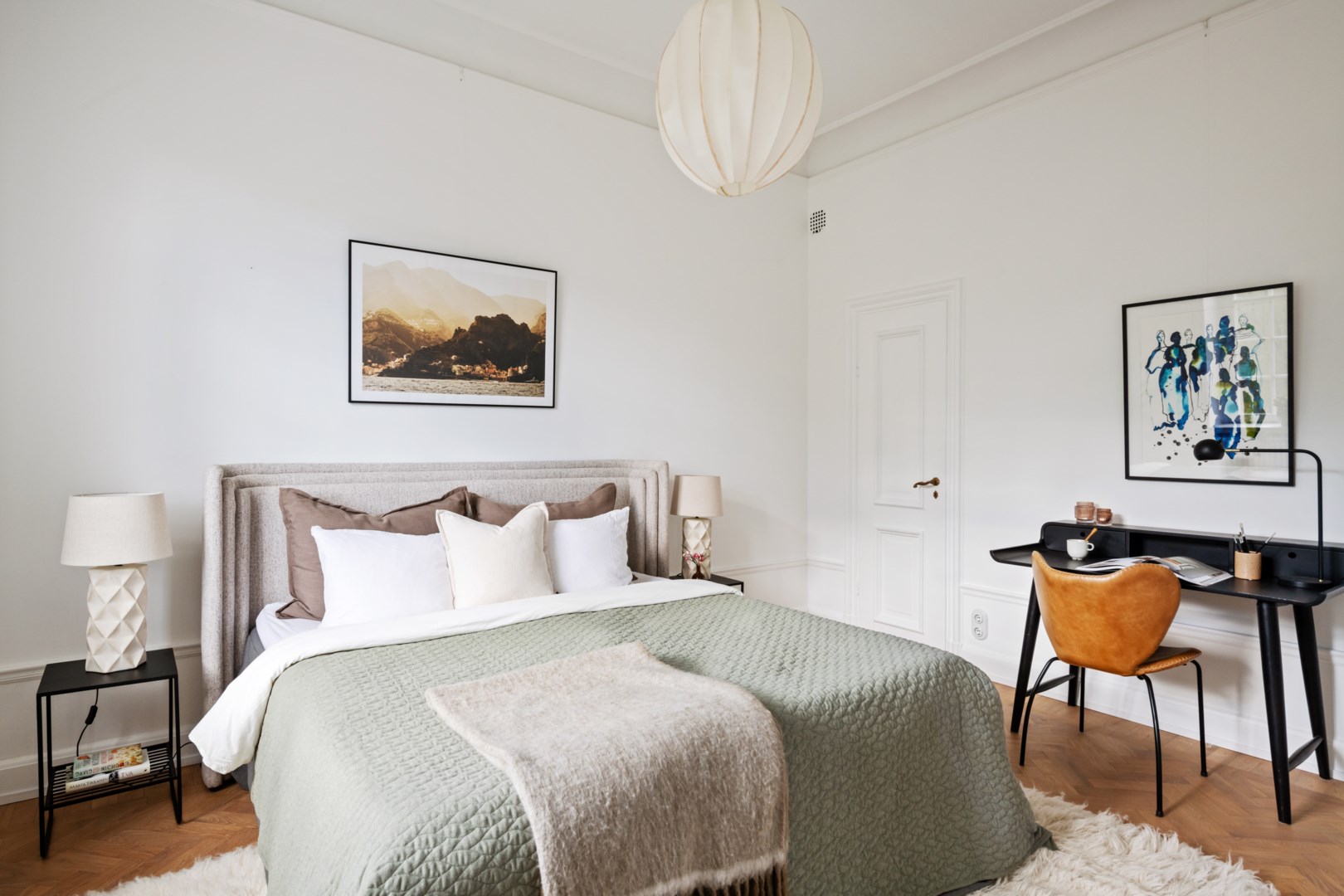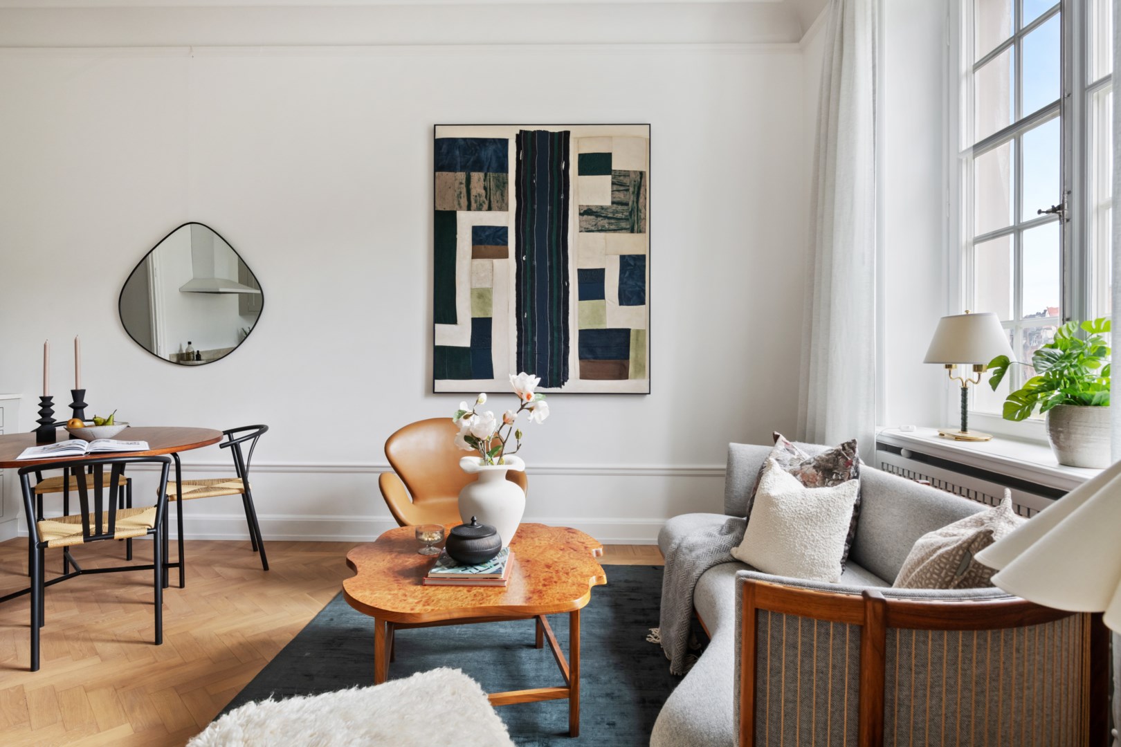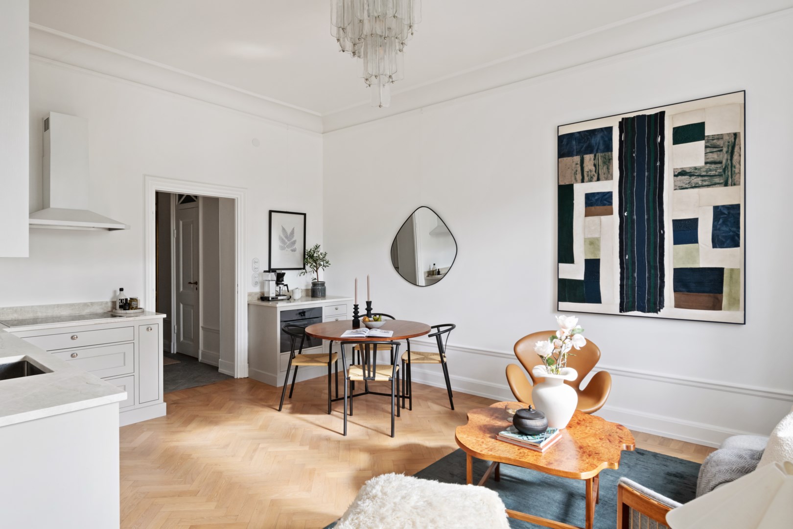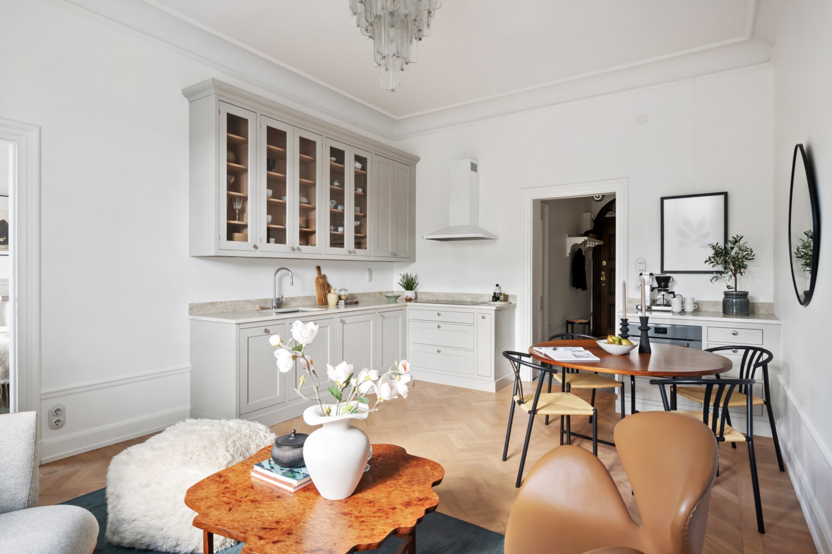Lägenheten bevarar vackra detaljer från byggnadsåret såsom fiskbensparkett, höga golvsocklar, rundade hålkäl vid övergång mellan tak och vägg, dörrhandtag och spanjoletter. Efter modernisering av el nya eluttag och strömbrytare i porslin i tidstypisk stil. Ljus hall med hatthylla i original, stor inbyggd garderob och elegant stengolv välkomnar. Härligt sällskapsrum med högkvalitativt kök, matplats och vardagsrumsdel i öppen planlösning. Via spröjsade fönster fri utsikt över himmel och grönskande träd. Köket från Kvänum har gott om förvaring och arbetsytor, bred induktionshäll, bänkskiva och stänkskydd i natursten och vitvaror från Miele. Intill ett rymligt sovrum med gott om plats för stor dubbelsäng samt arbetsbord om så önskas. I anslutning en rymlig walk-in closet med hyllor, klädstänger och heltäckningsmatta. Ifrån hallen ett fint badrum med dusch och förberett för tvättmaskin.