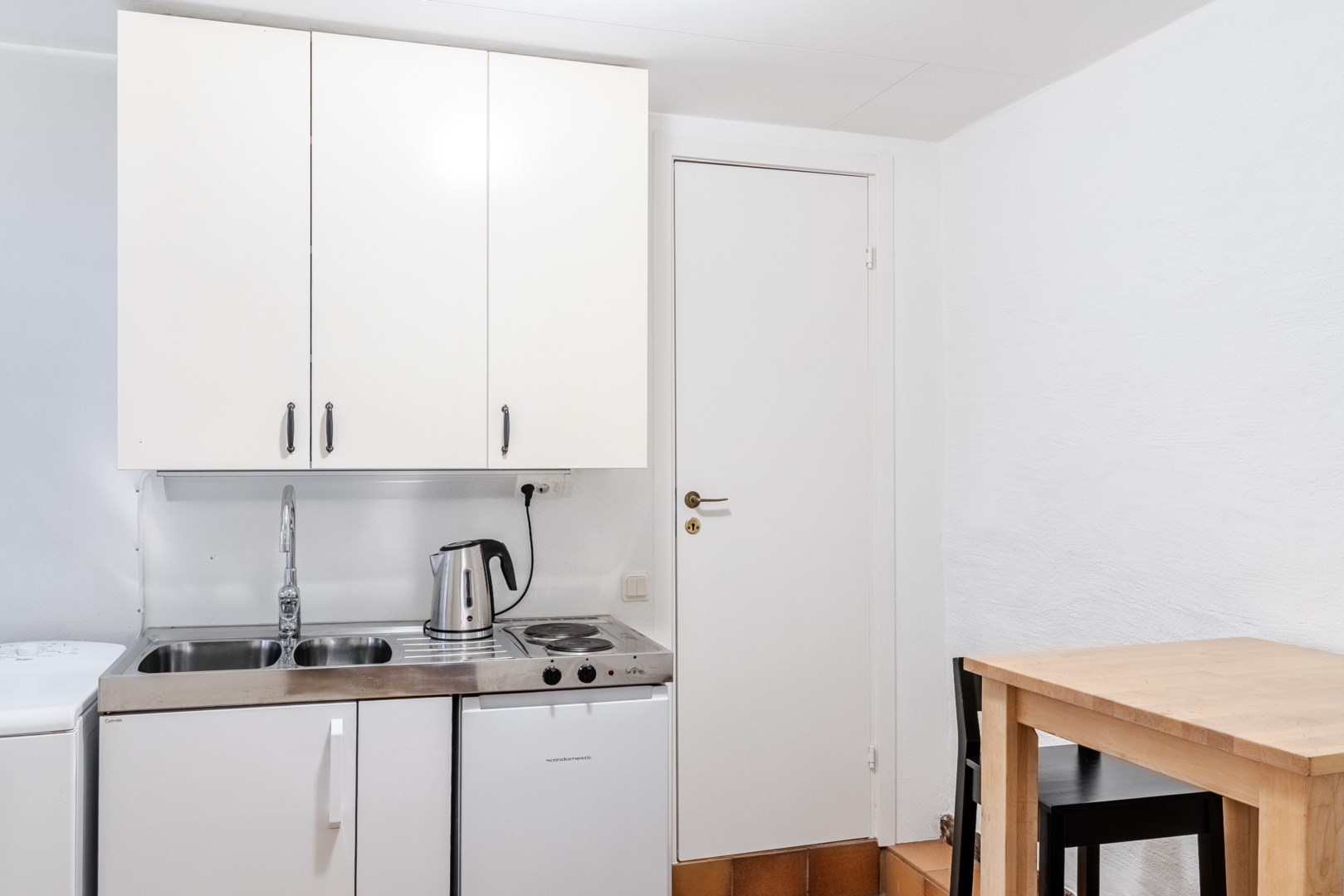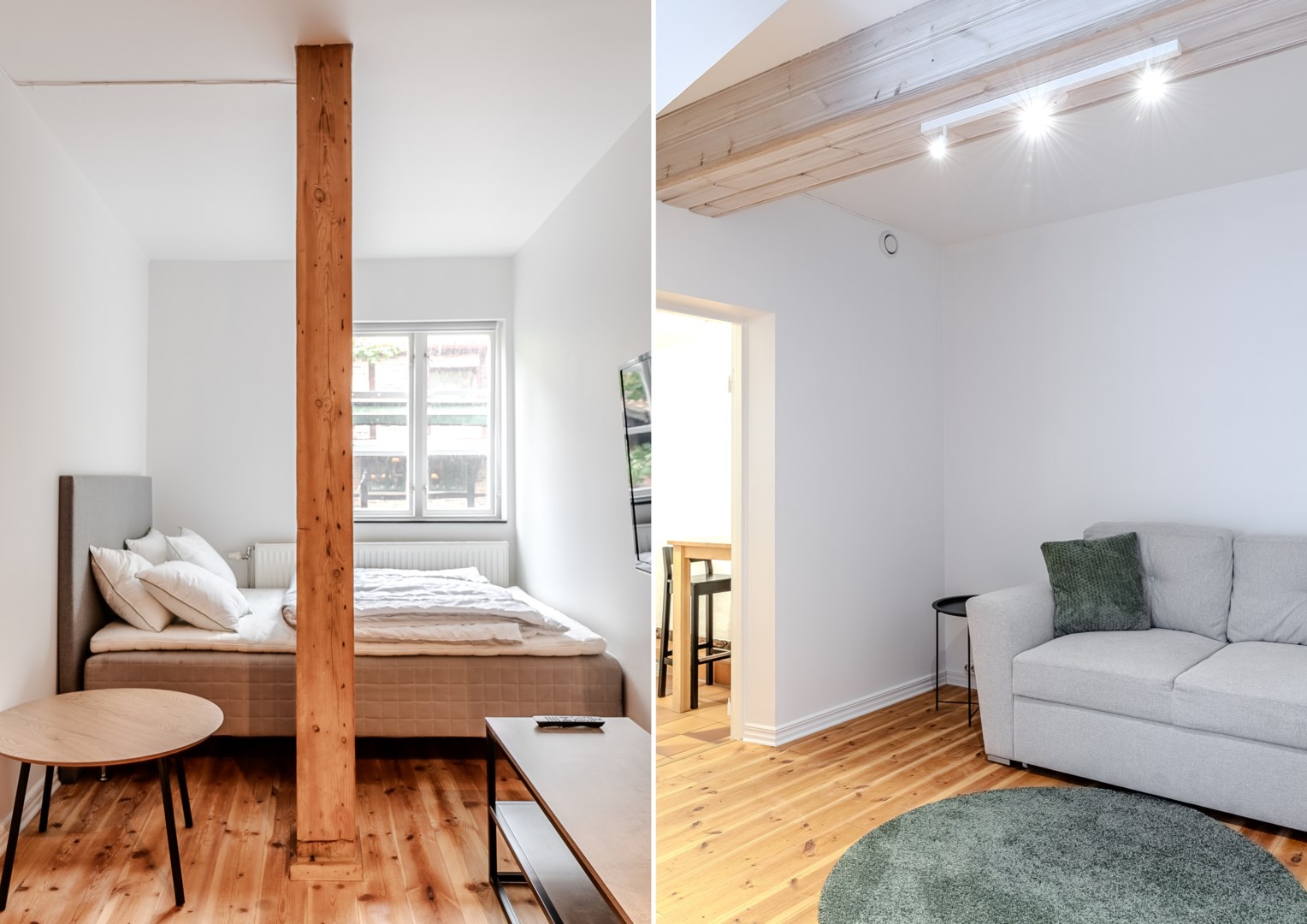 I norra längan är fastighetens största bostad placerad. Vacker gatuhusfasad mot Stora Västergatan med klassisk puts och spröjsade fönster. Härligt allrum med synliga bjälkar och kakelugn. Två sovrum, allrum, matplats och kök med utgång till avgränsad uteplats på den vackra innergården. Även över denna bostad ligger oinredd vind.