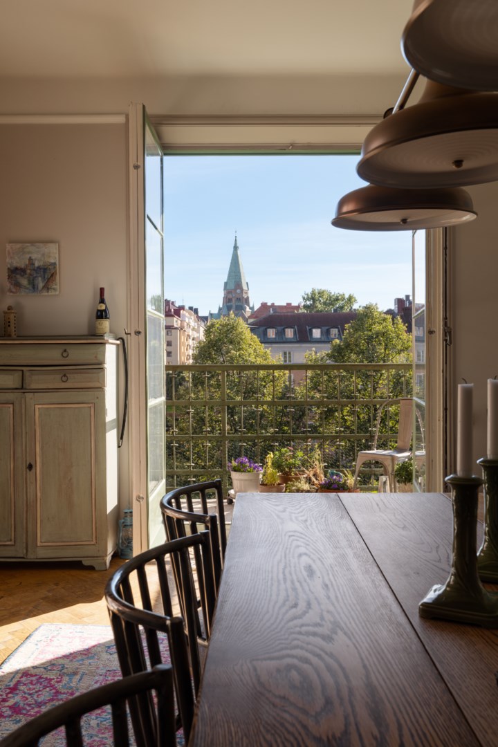 Våningen erbjuder en ljus och tilltalande planlösning med generösa sällskapsytor och en stor balkong med vacker utsikt. Här finns ett rymligt kök med matplats, sällskapsrum med burspråk och en intilliggande matsal med öppen spis.