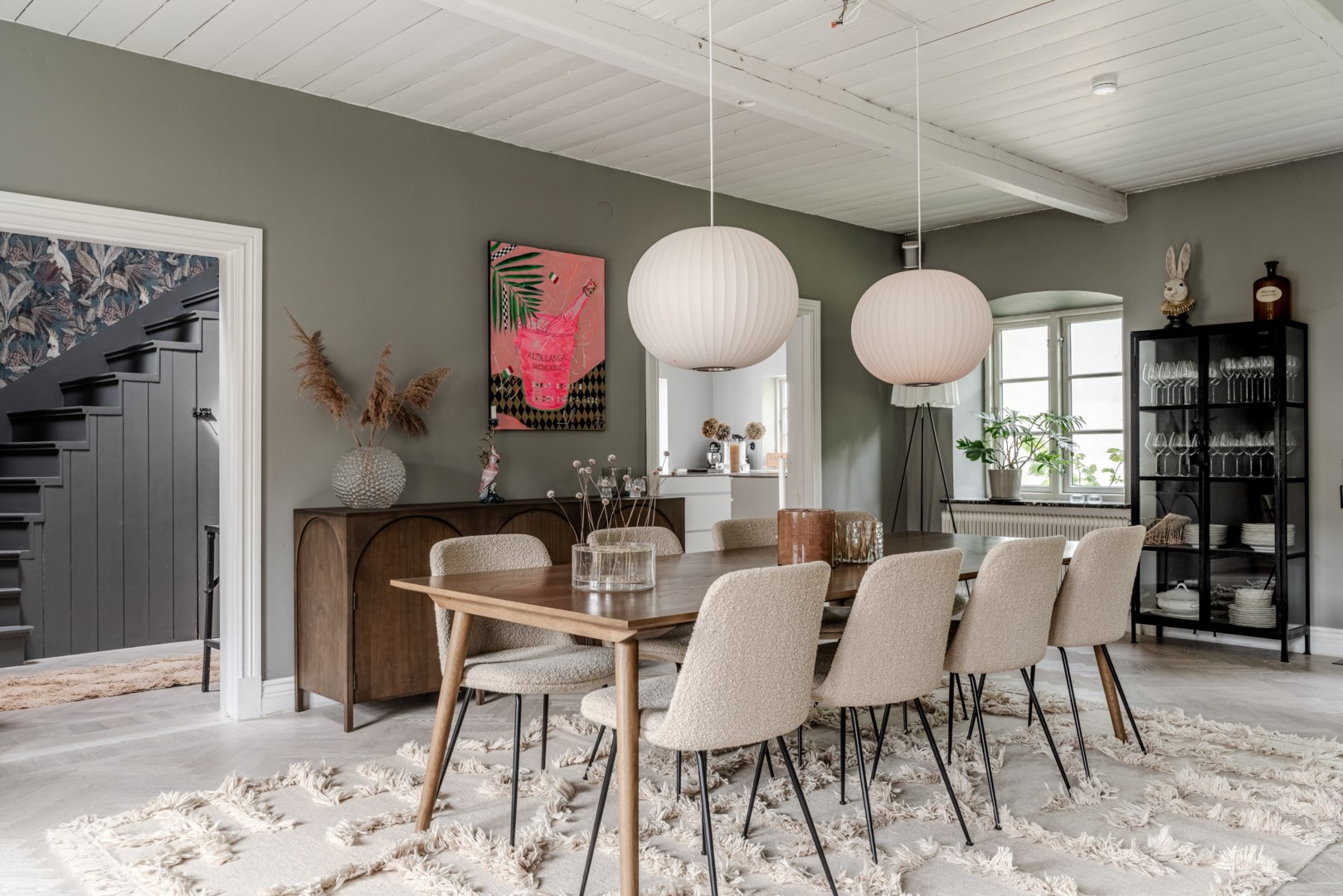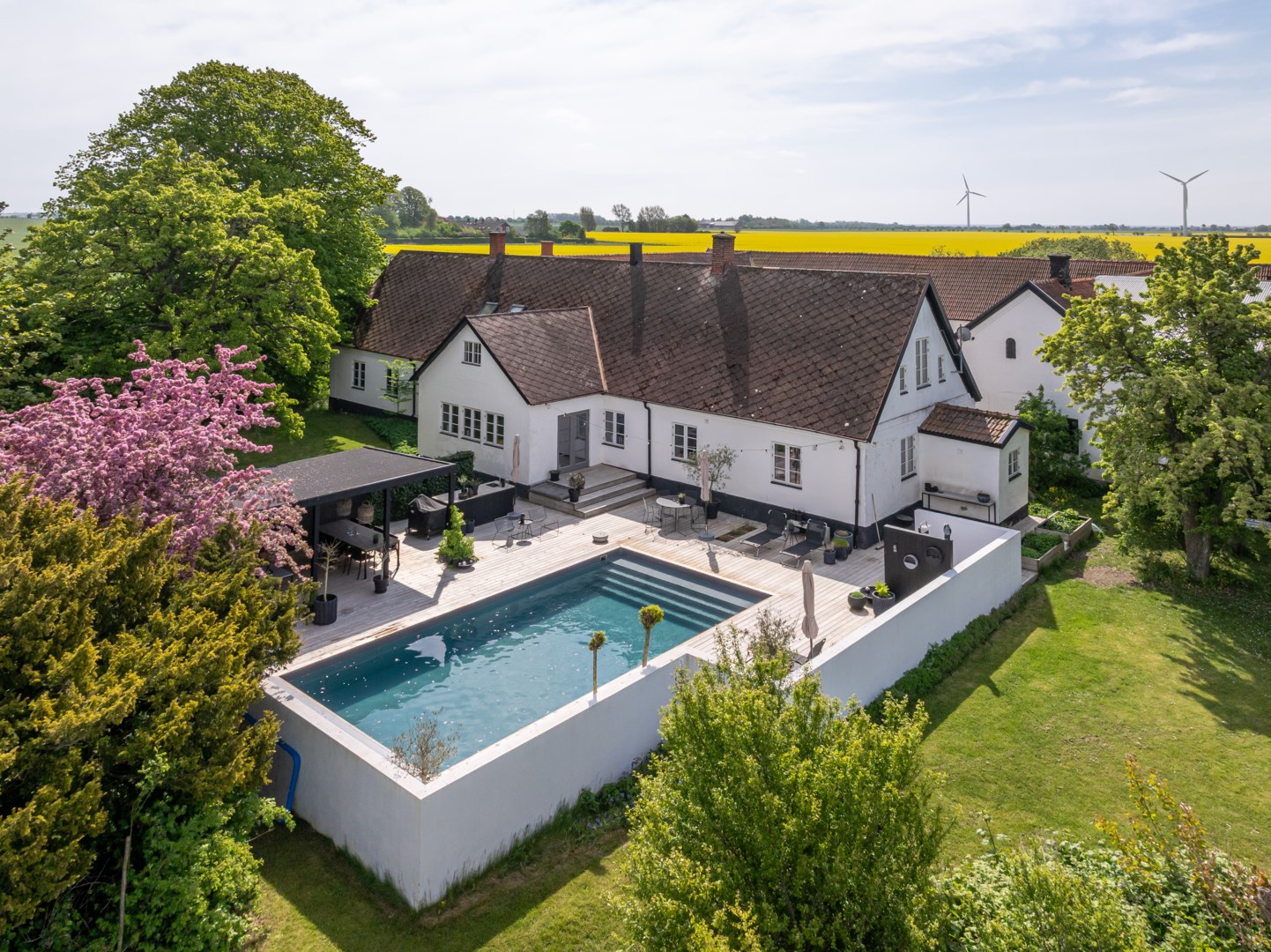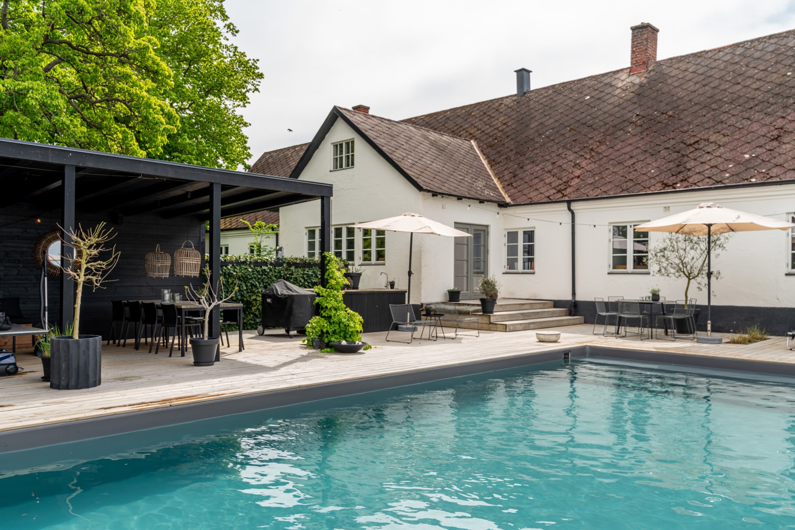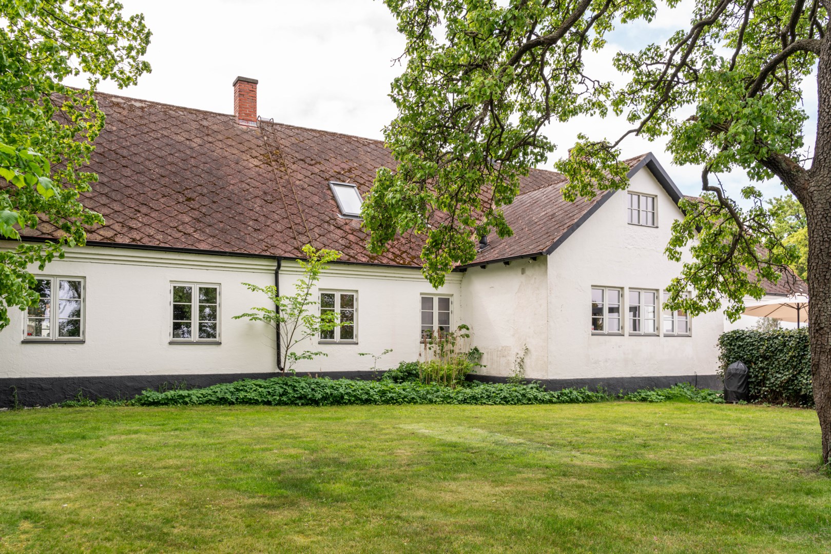 Entrén välkomnar in i bostaden med direkt tillgång till kök och två stor sällskapsrum i fil. Köket har en fin rymd med stora ytor och dubbel takhöjd upp till nock. Köket byggdes 2013 och har stommar från Kvik som utgör bl. a. köksö och högskåp med inbyggd kyl och frys m.m. Från köket nås också poolområdet med utekök och flera möblemang. Vidare i huset ligger matsal och allrum i fil. Båda är försedda med murstock och vars sin eldstad som delar av de sociala ytorna. I husets motsatta sida ligger separat, mera privat avdelning med master bedroom, stor klädkammare och badrum samt rum för hemmakontor. På planet finns också tvättrum med egen ingång och gwc. En trappa upp finns tv-rum och tre sovrum samt badrum med dusch. Gott om förvaring i form av flera klädkammare. Privatbostadens utemiljö utgörs främst av det härliga poolområdet. Pool om 5x10m med trappa utmed hela kortsidan och dusch i närheten. Praktiskt utekök med vatten och intill ligger taköverbyggd uteplats. Perfekt plats att uppleva fantastiska solnedgångar över fälten i väst.