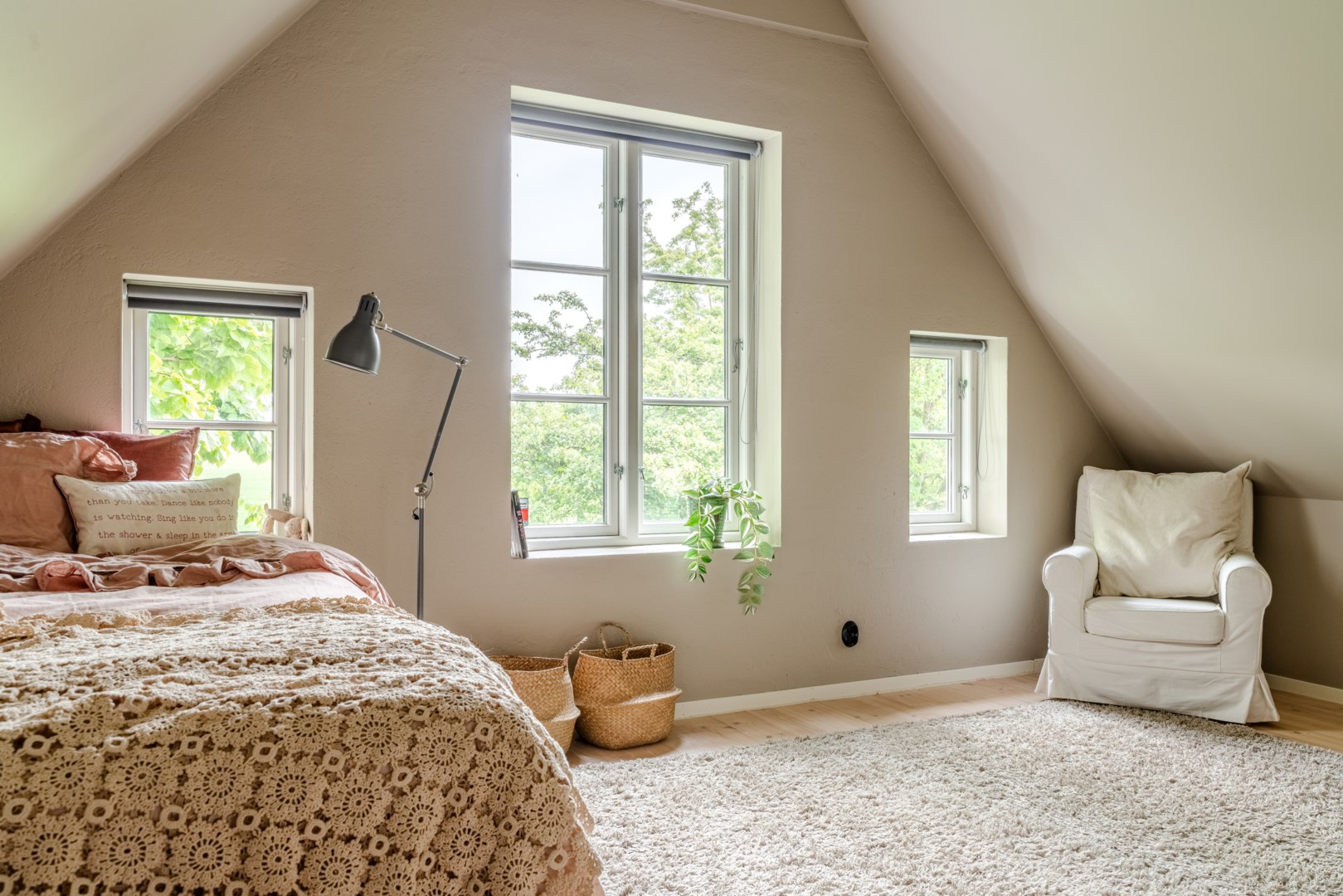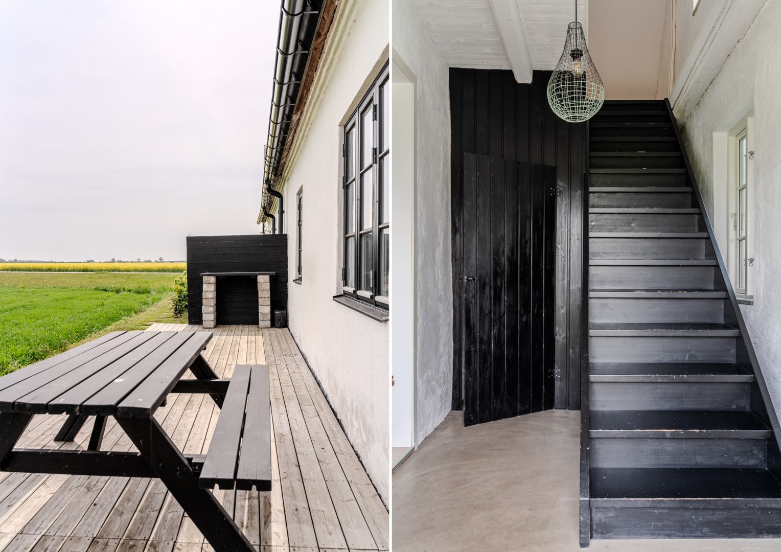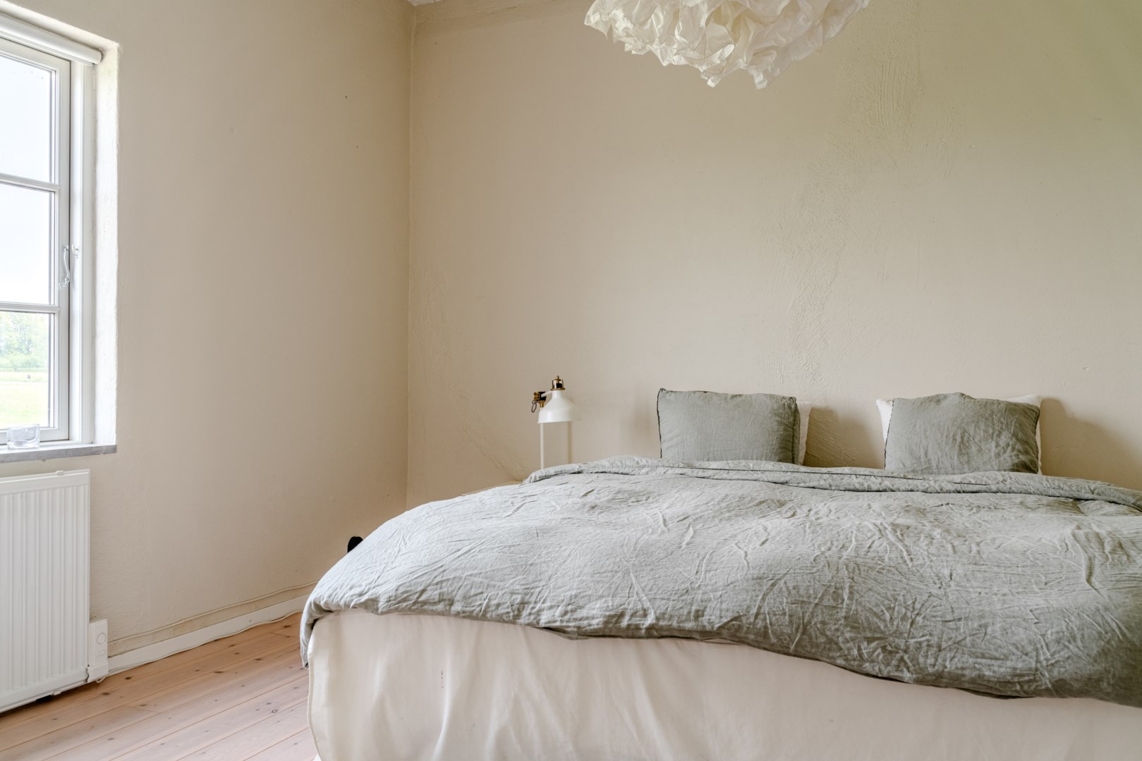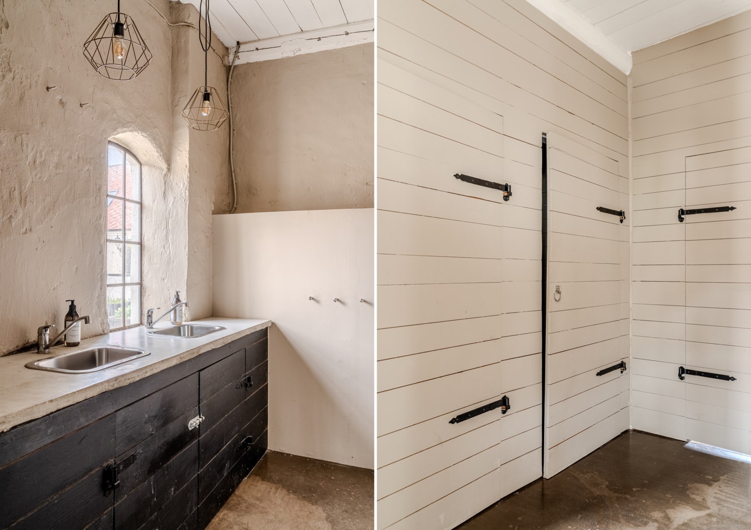 I gårdens östra länga ligger den första gästlägenheten. Egen uteplats och entré leder in till kök och allrum i öppen planlösning. Entréplanet har också ett sovrum och badrum med dusch och tvättpelare. En trappa upp ligger ytterligare två sovrum.