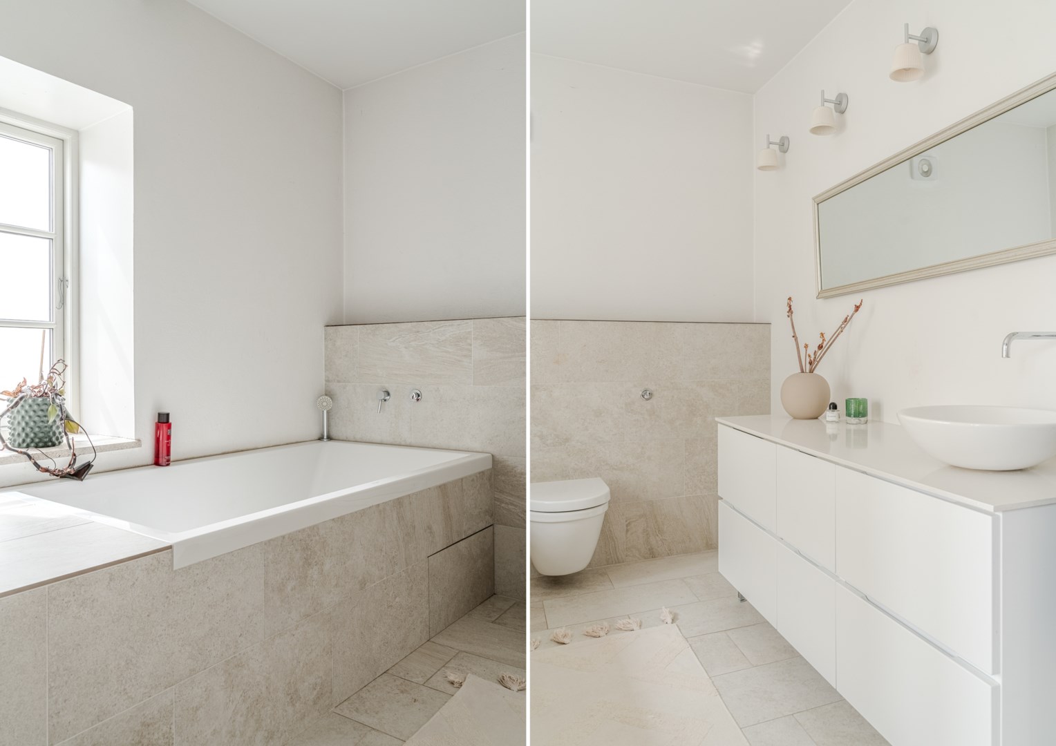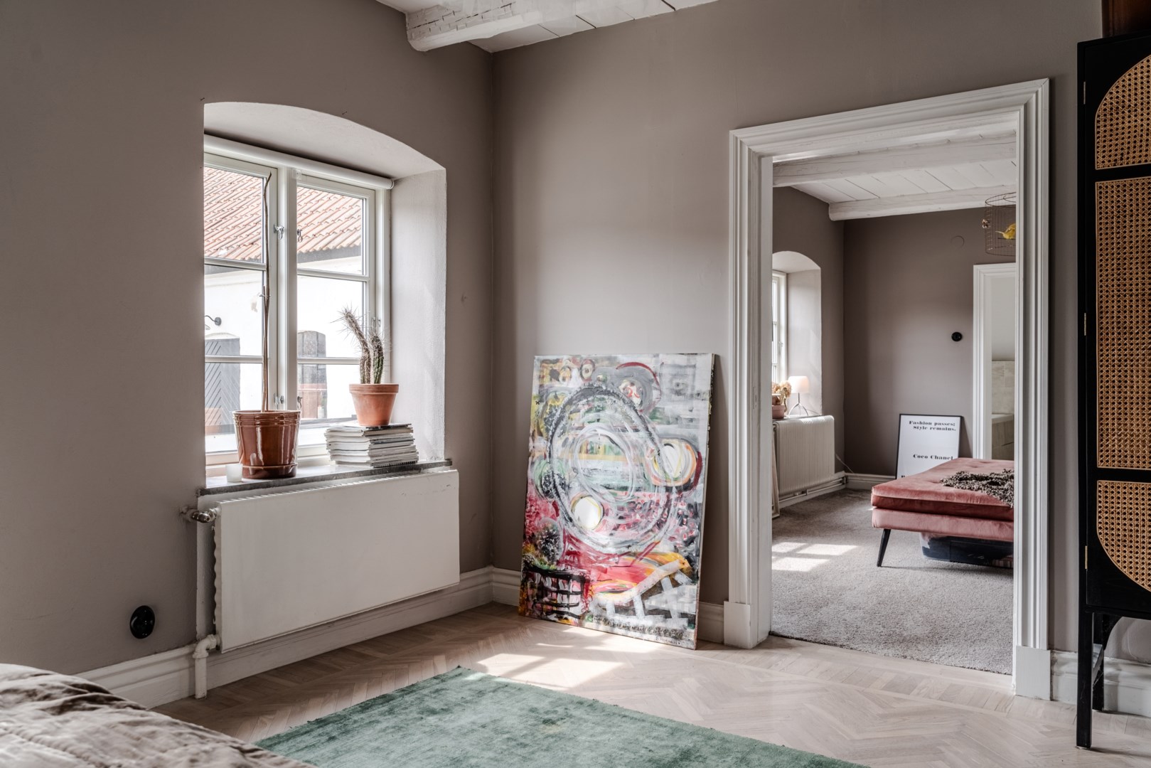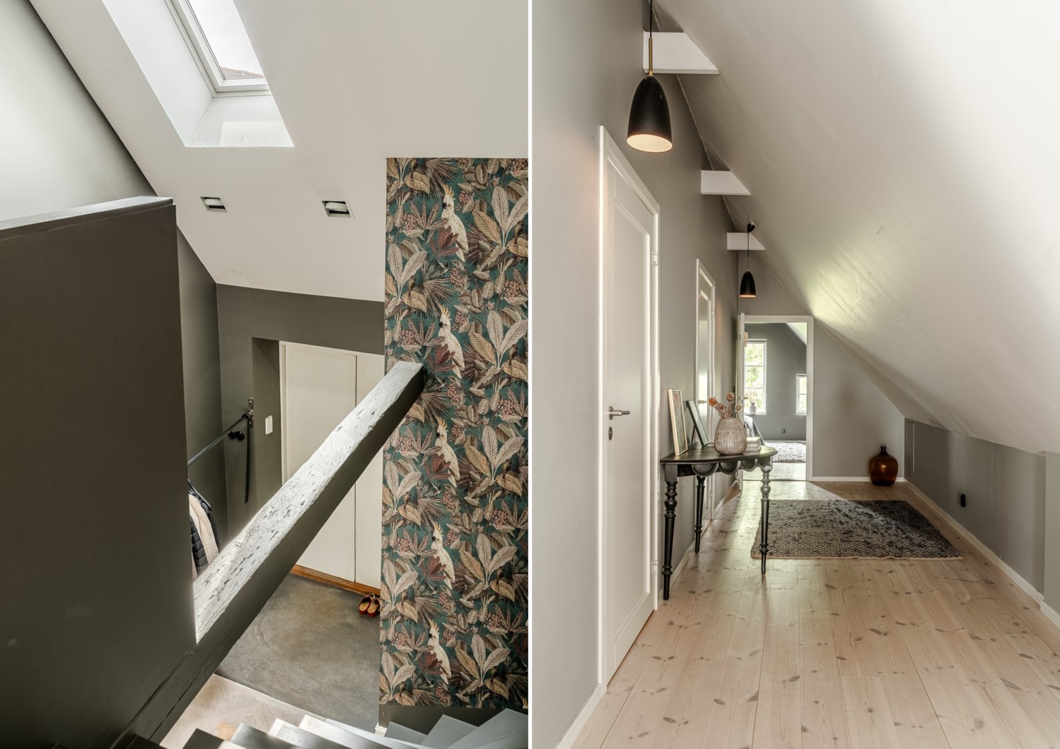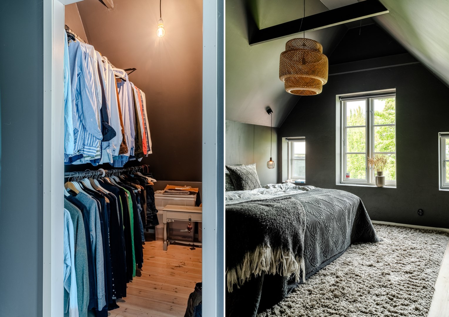 I gårdens östra länga ligger den första gästlägenheten. Egen uteplats och entré leder in till kök och allrum i öppen planlösning. Entréplanet har också ett sovrum och badrum med dusch och tvättpelare. En trappa upp ligger ytterligare två sovrum.