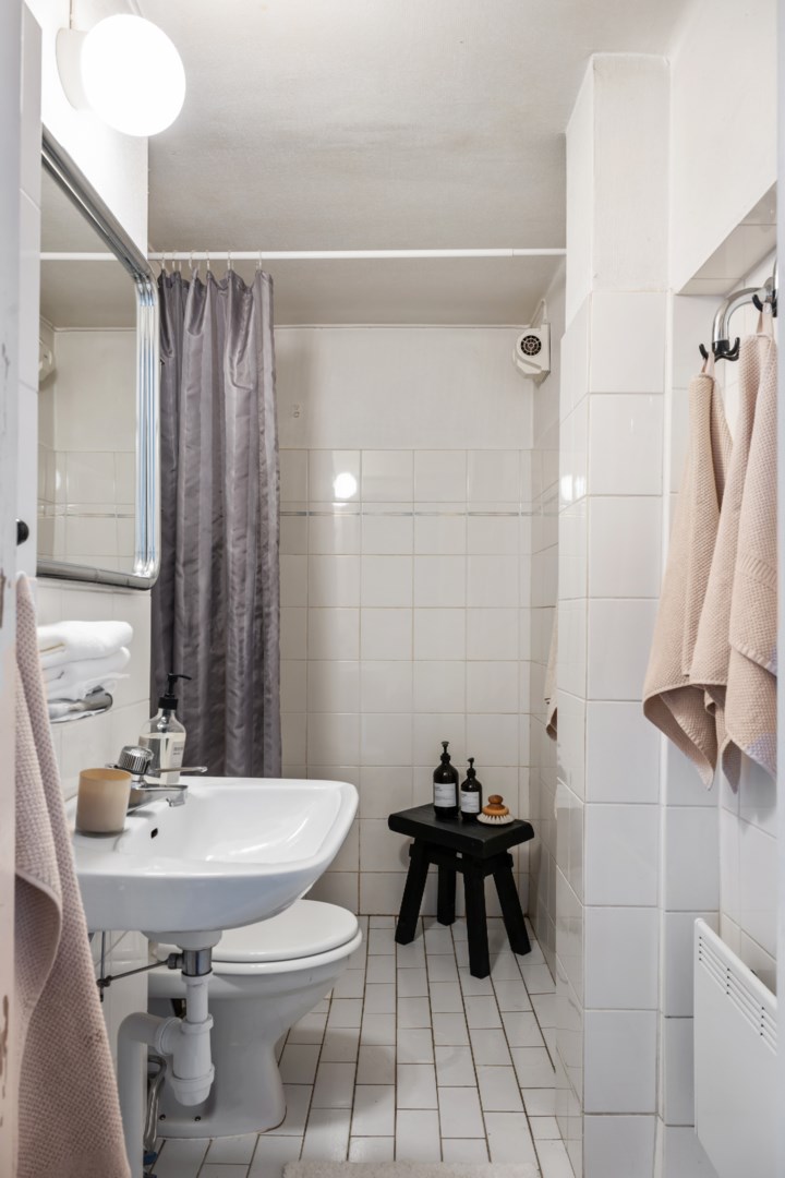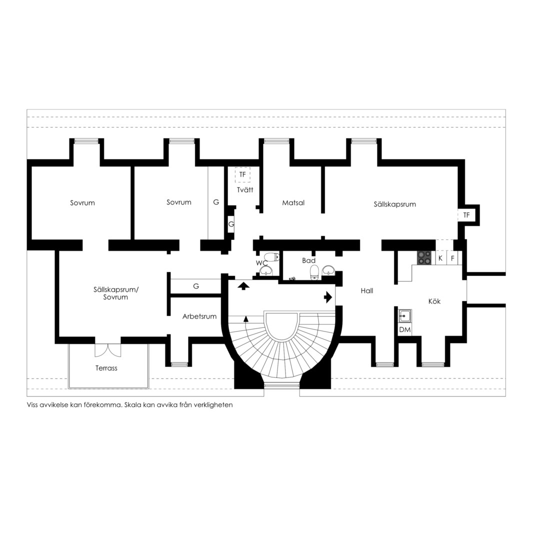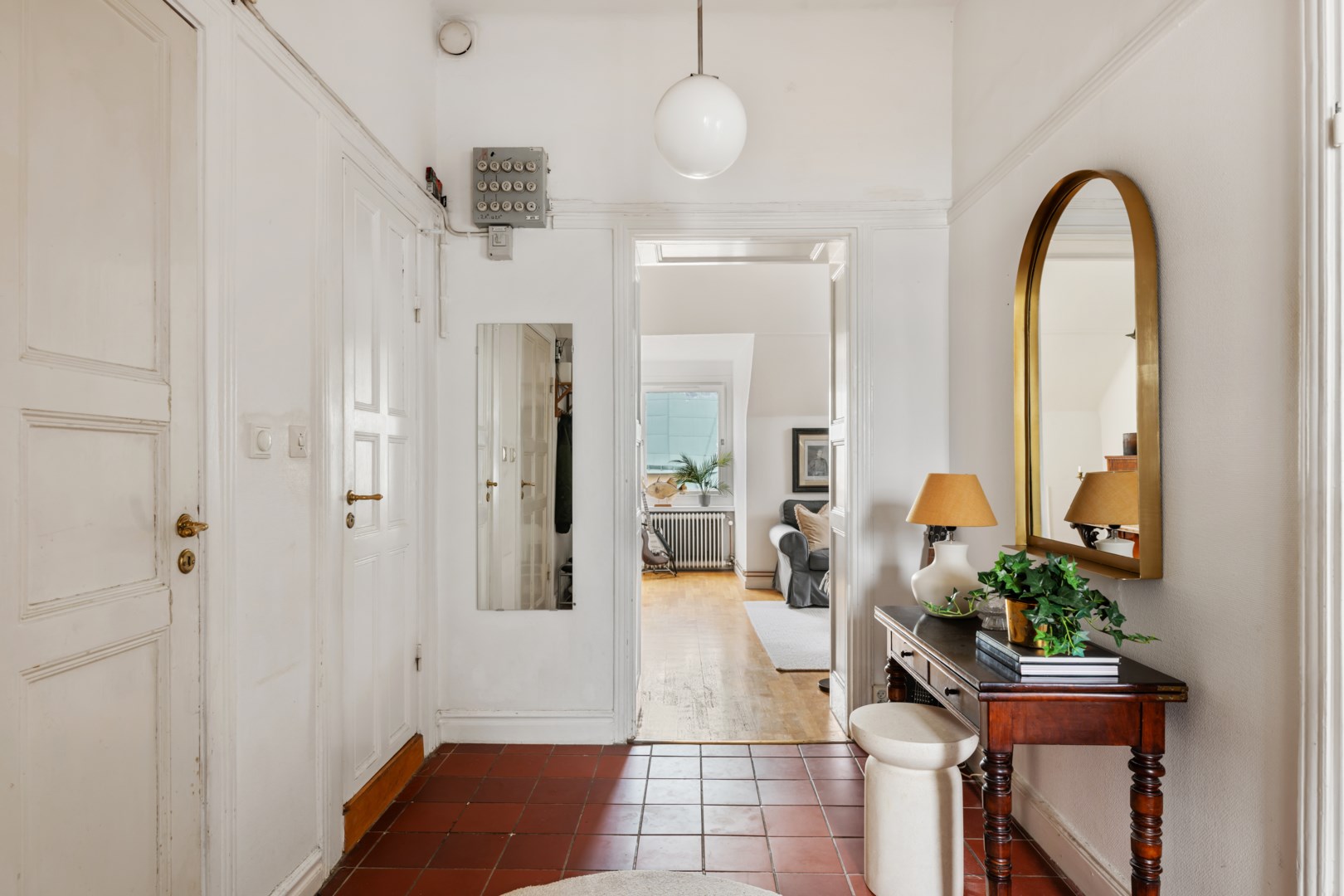 Ljus och möblerbar hall välkomnar och ifrån hallen ett trivsamt kök med matplats invid fönster mot den inre gården. Direkt utgång från kök till vindsförråd. Angränsande till köket ett generöst sällskapsrum med härlig rymd och fönster i två väderstreck och intill en mysig matsal. Vidare längs denna långsida av våningen som vetter mot Östermalmsgatan en praktisk tvättstuga samt två fina sovrum, båda med garderobsförvaring. Mot den inre gården ytterligare ett inbjudande sällskapsrum med utgång till underbar terrass i soligt sydsydvästläge med utsikt över Östermalms takåsar. Gott om plats att möblera med både matgrupp och sittgrupp på terrassen. Ett litet arbetsrum/barnrum med fönster intill sällskapsrummet och på andra sidan väggen bra garderobsförvaring. Ifrån hallen ett kaklat badrum med dusch och vid den andra entrén en WC. Möjlighet att förändra planlösning, se text under Övrigt om riktlinjer inför och under ombyggnation.