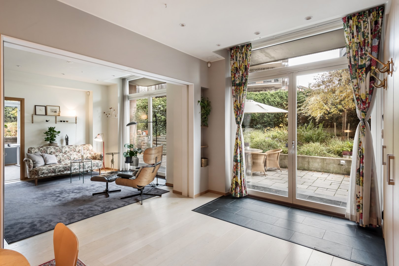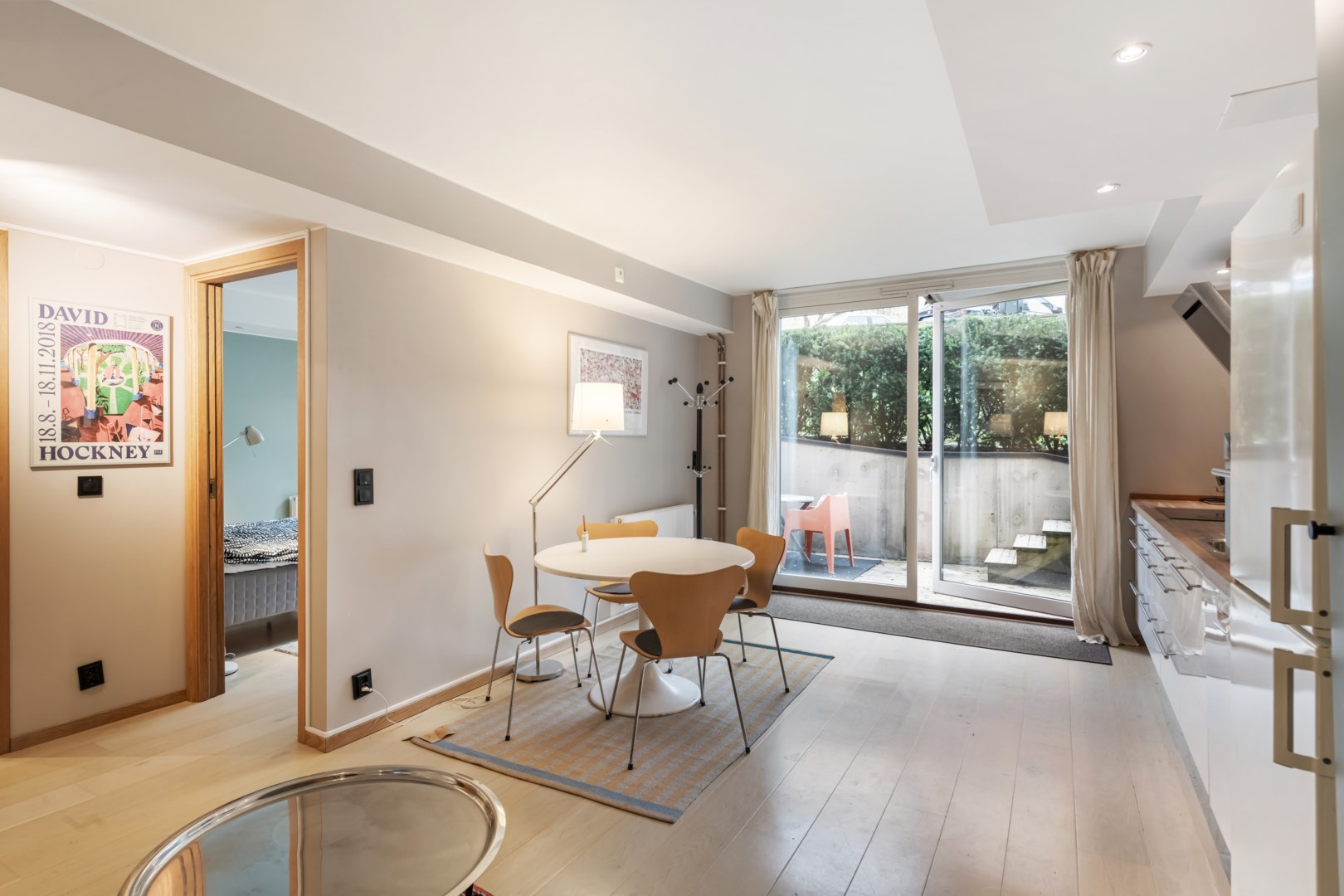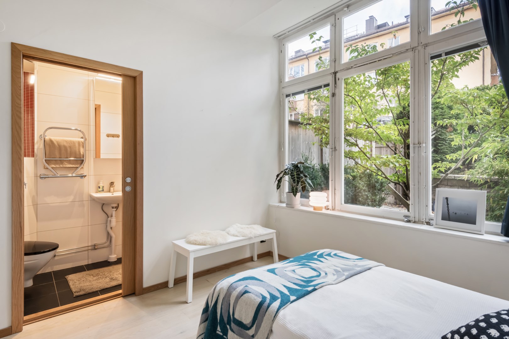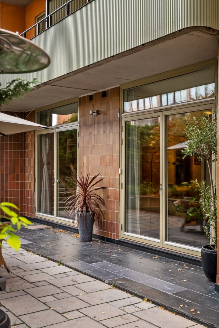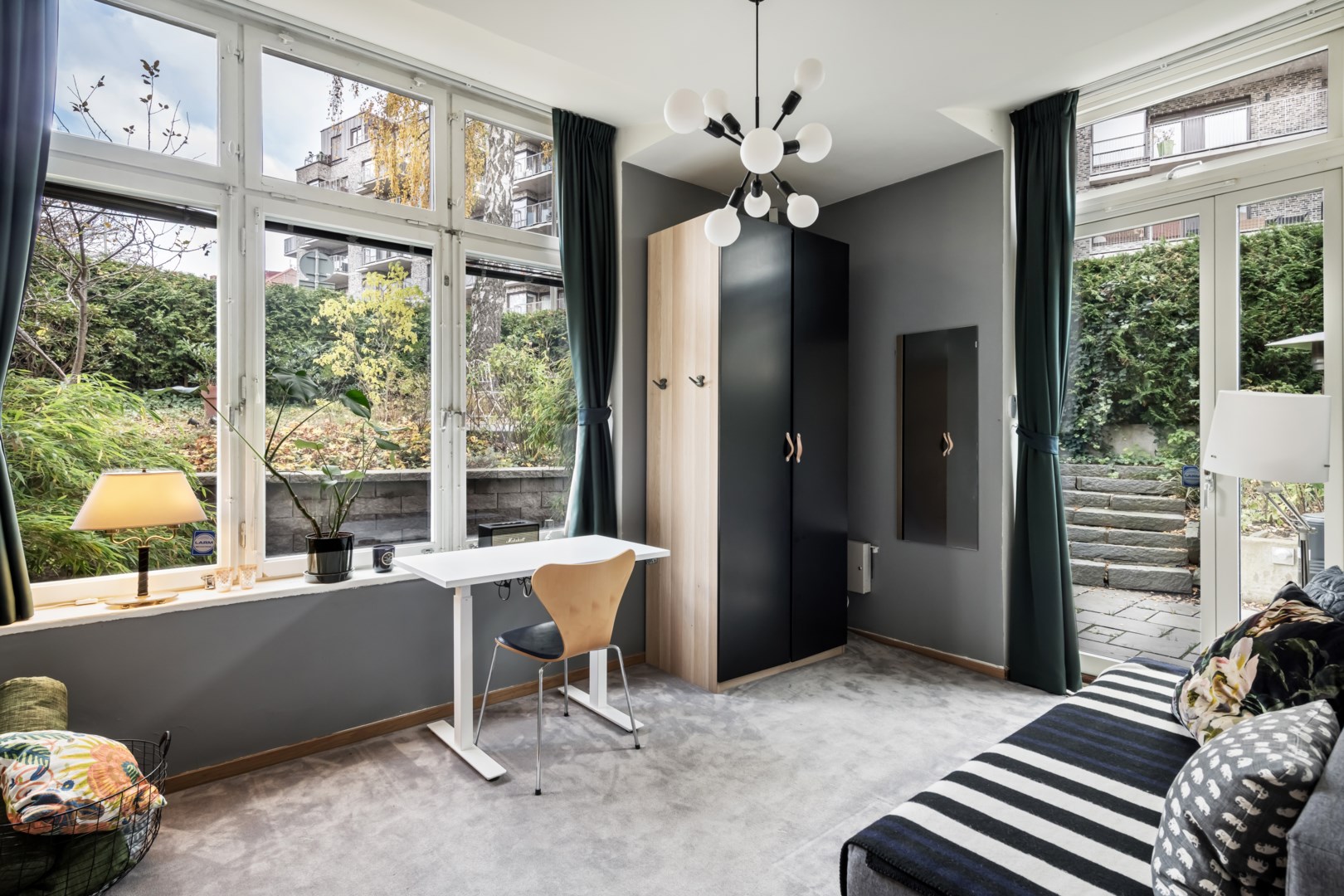 Här bor du i en stilren funkis fastighet med egen, insynsskyddad trädgård om hela 200 kvm – en grön oas bara några minuter från city. Läget är svårslaget, med Ladugårdsgärdets grönområden, Kampementsbadet, utegym och volleybollplaner alldeles runt hörnet.