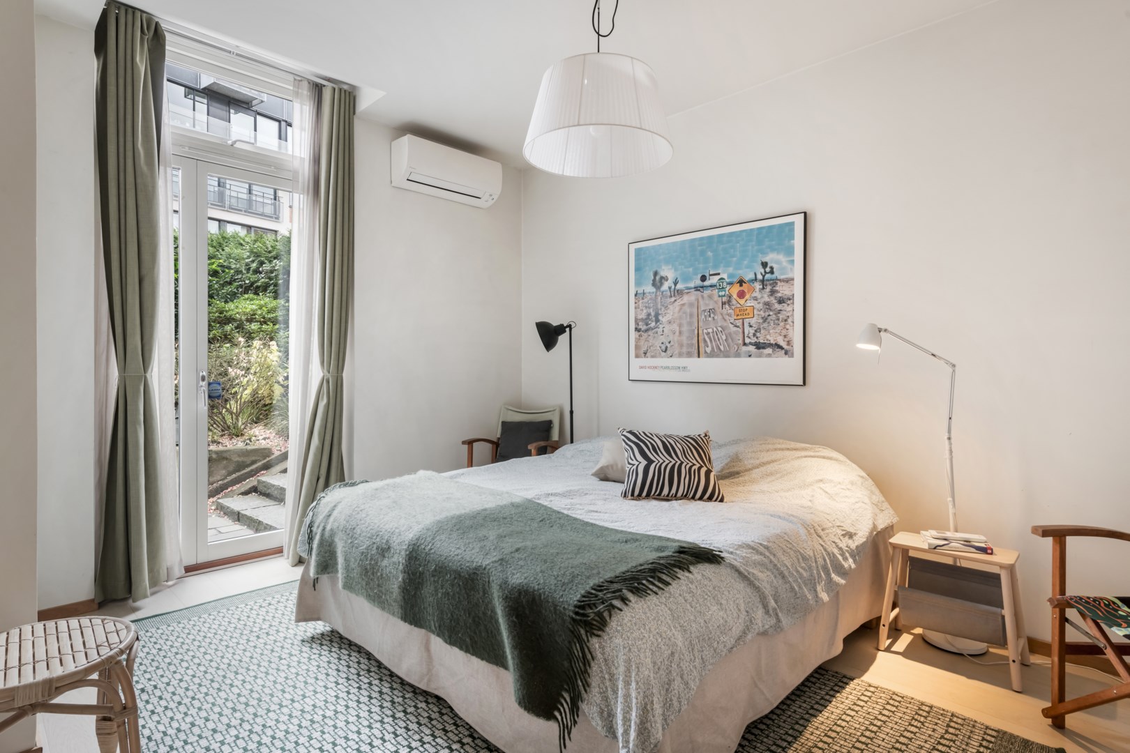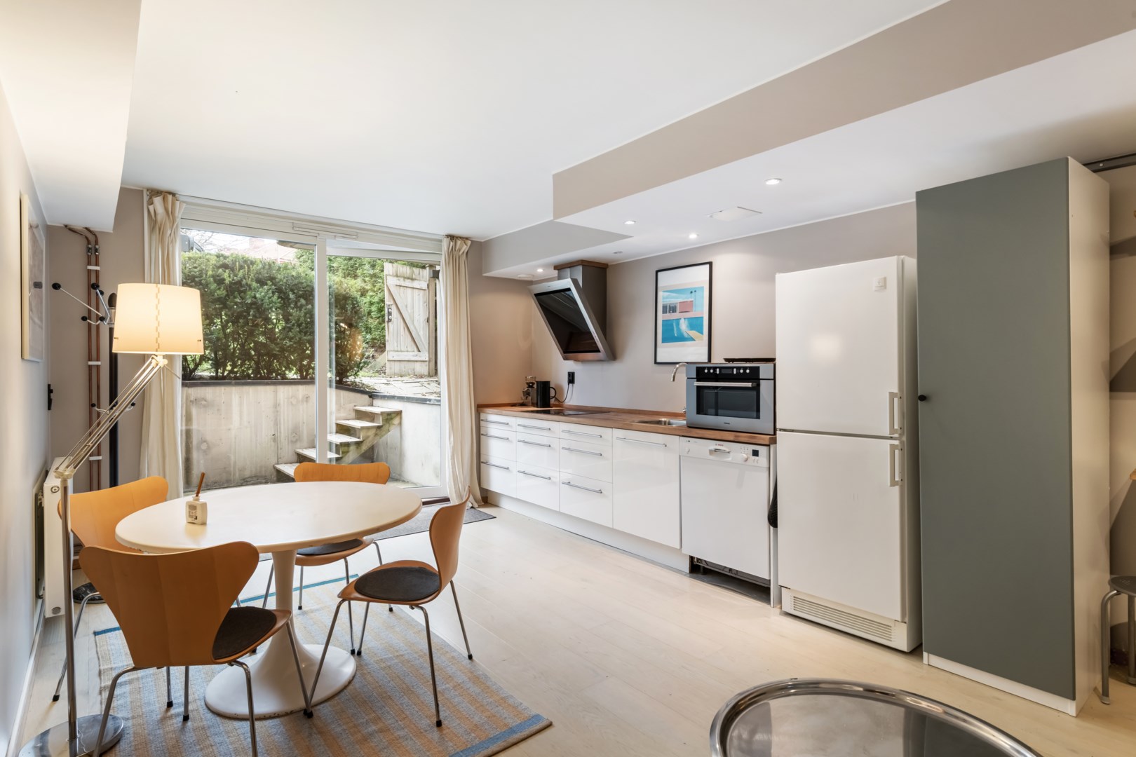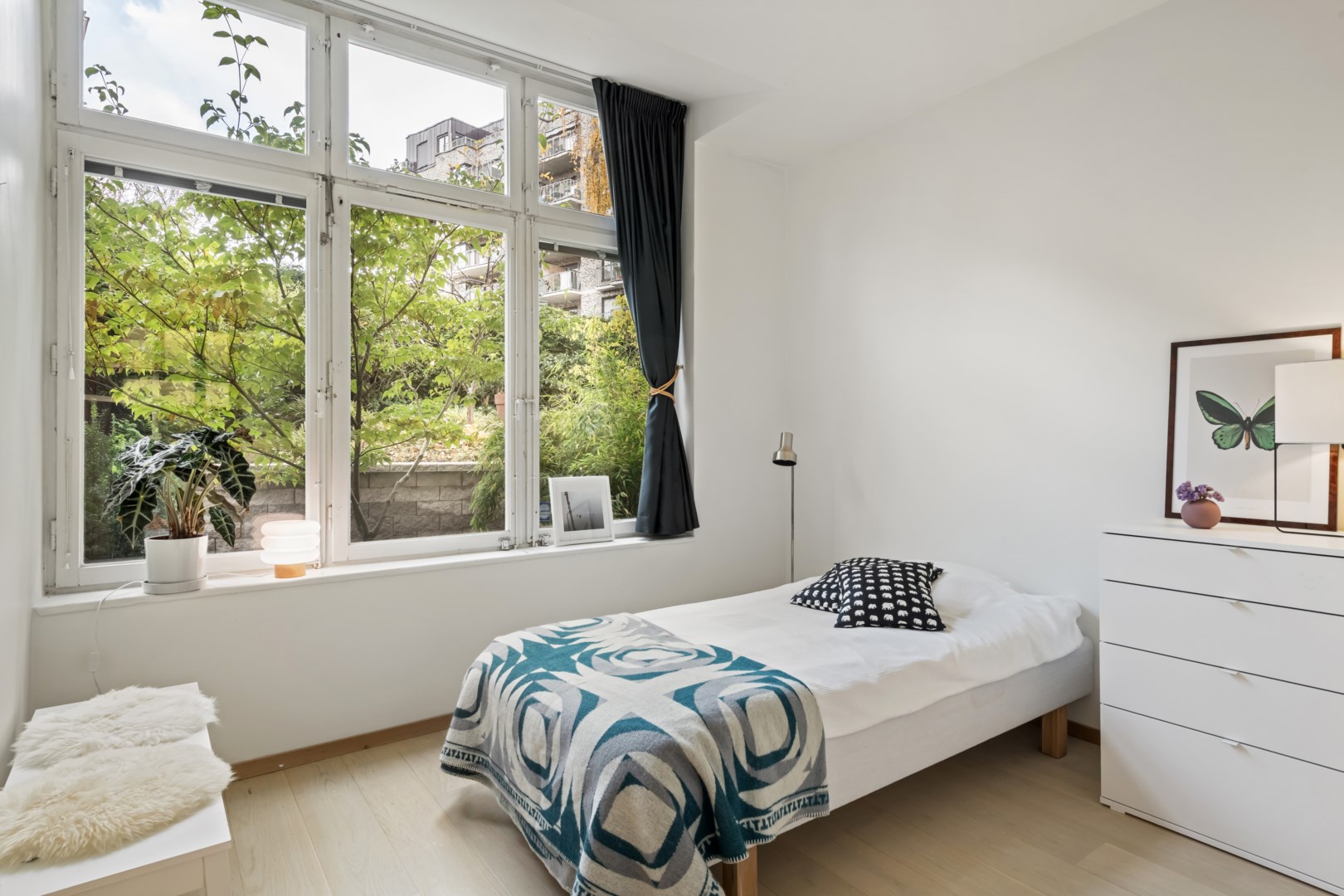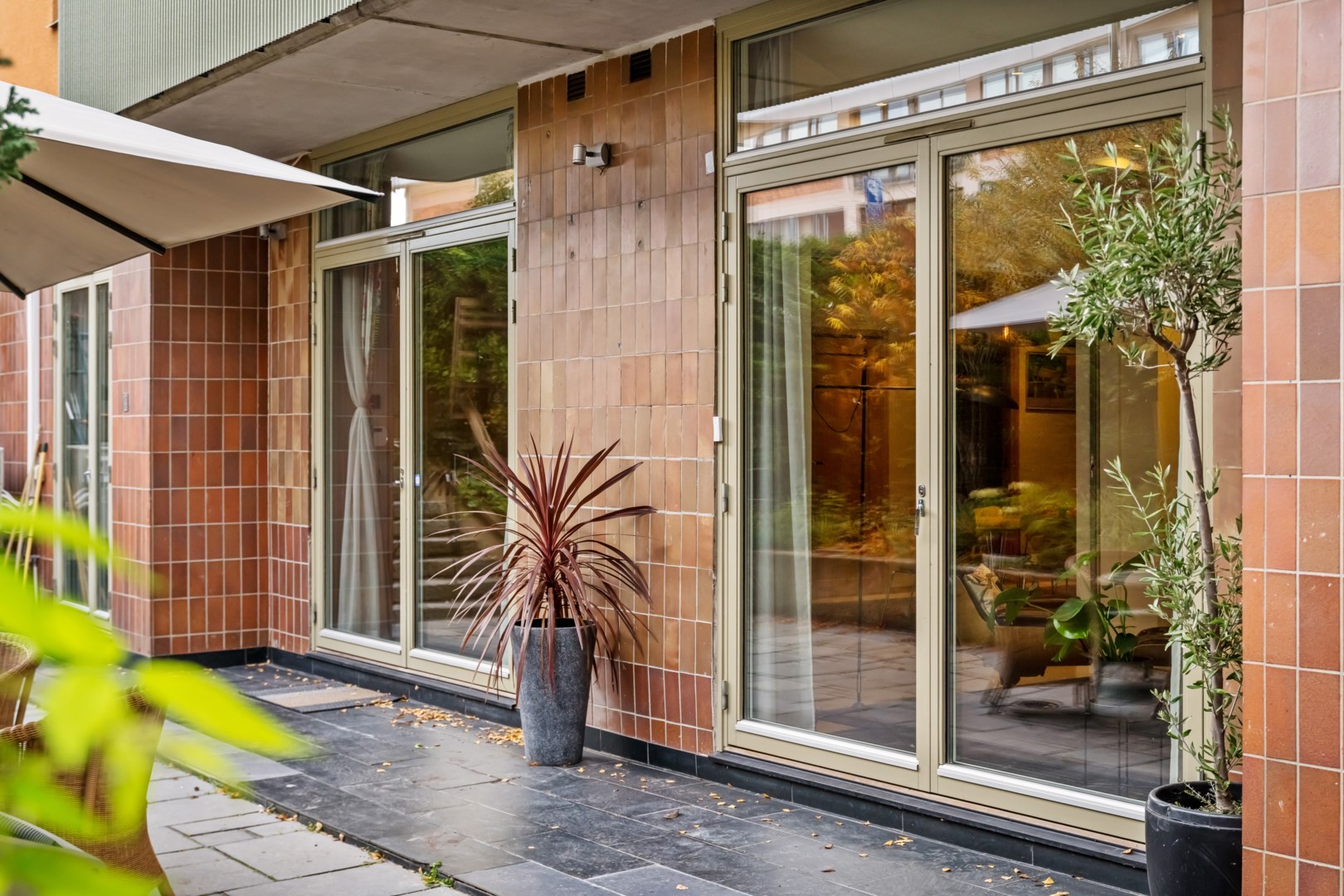 Här bor du i en stilren funkis fastighet med egen, insynsskyddad trädgård om hela 200 kvm – en grön oas bara några minuter från city. Läget är svårslaget, med Ladugårdsgärdets grönområden, Kampementsbadet, utegym och volleybollplaner alldeles runt hörnet.