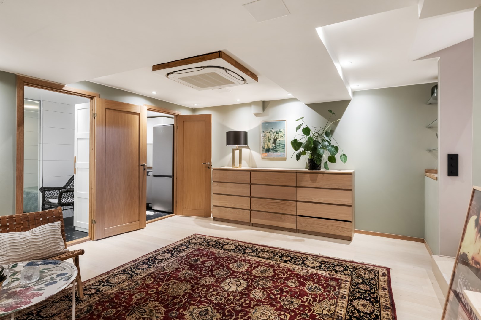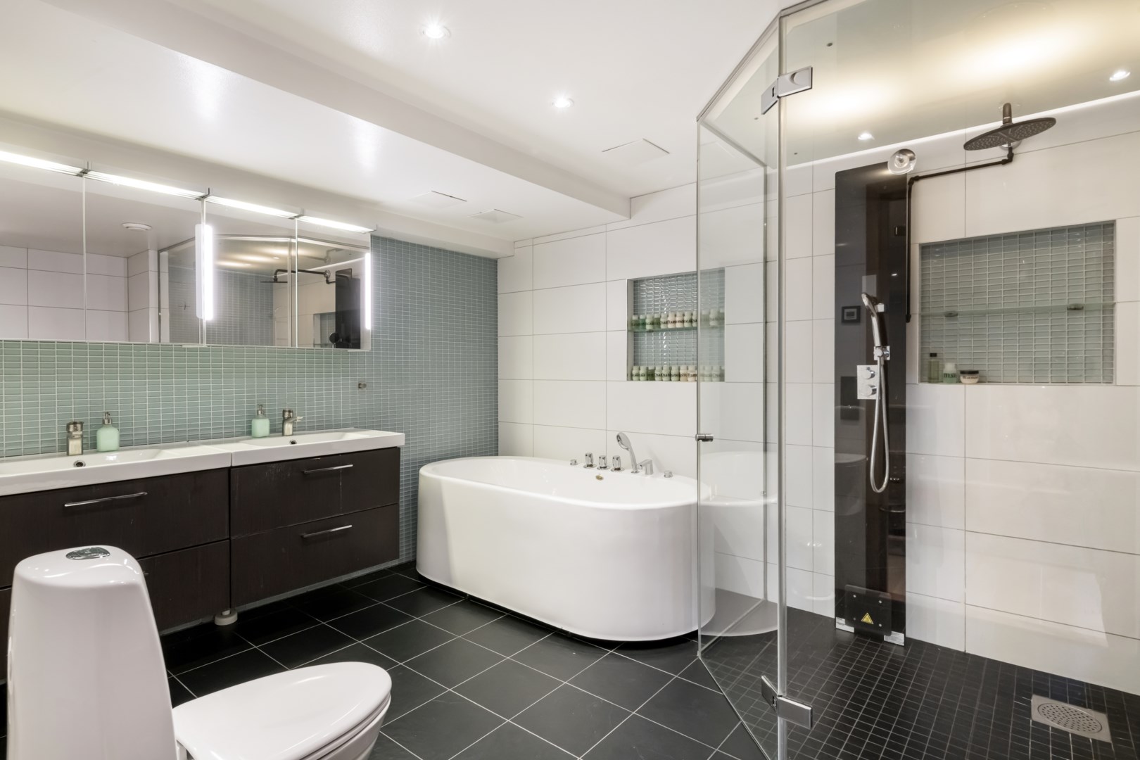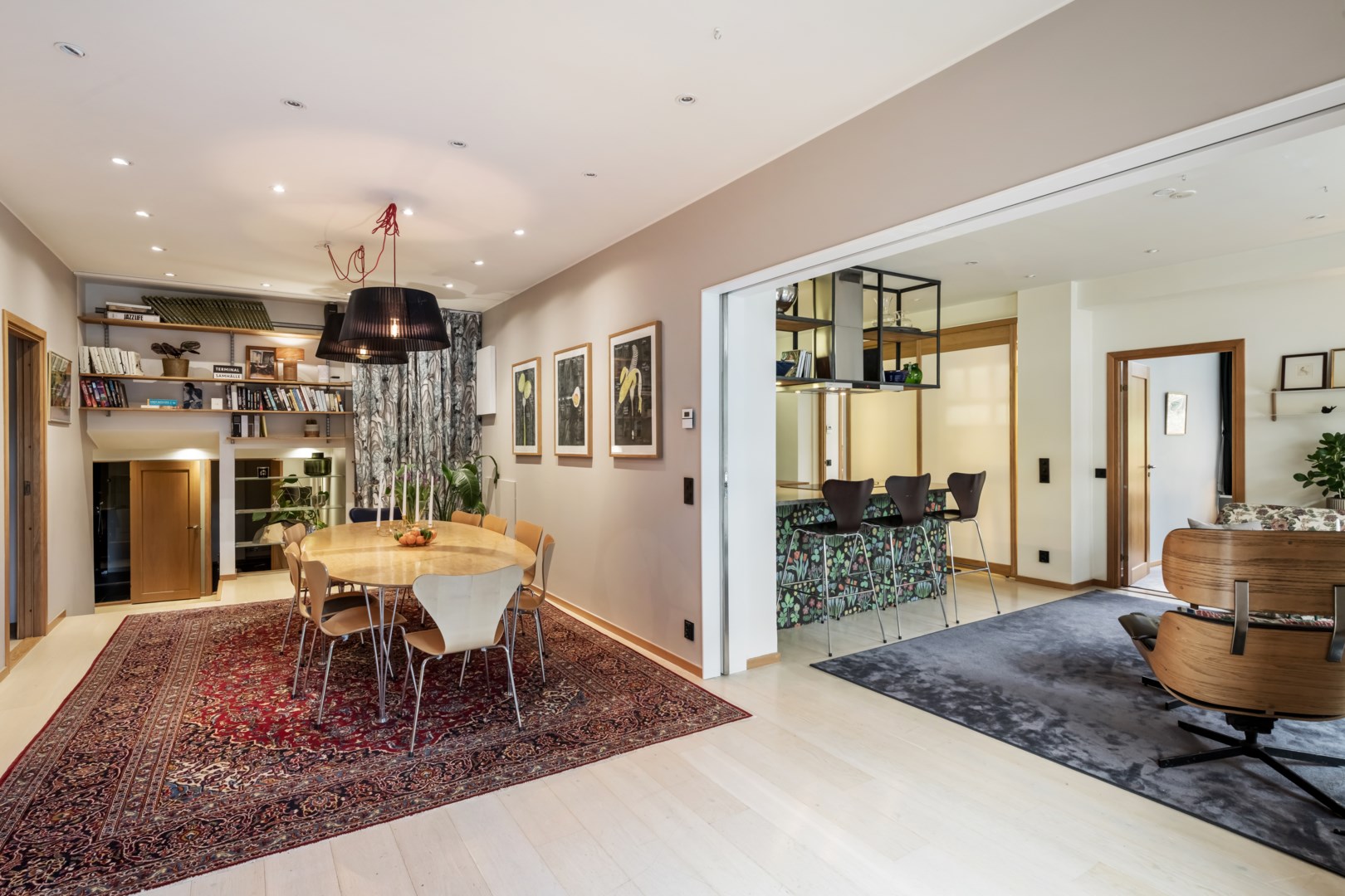 Våningen erbjuder två moderna kök med genomtänkta materialval – perfekt för matlagning och umgänge. Här finns sex rymliga sovrum med goda förvaringsmöjligheter, tre helkaklade badrum, bastu, tvättstuga och flera praktiska förvaringsutrymmen.