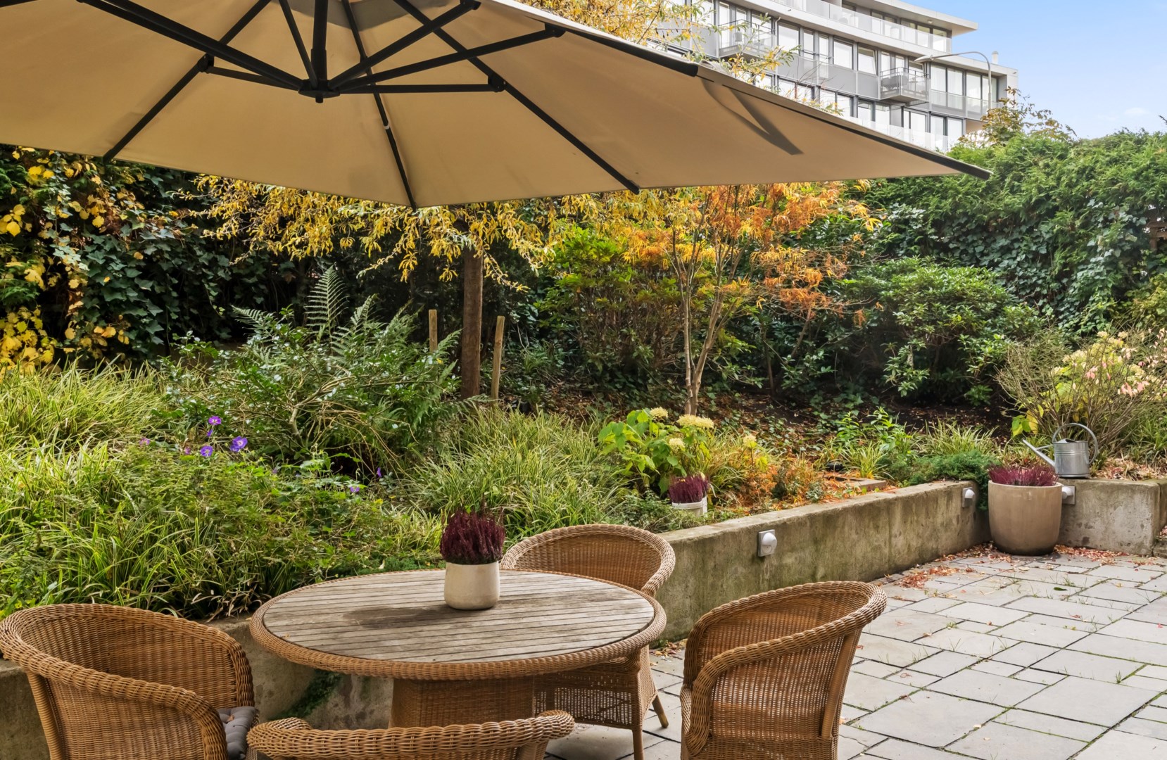 Den söder vända trädgården ramas in av en två meter hög, vintergrön häck som ger fullständig avskildhet året runt. I direkt anslutning finns möjlighet att hyra parkeringsplatser genom föreningen – en ovanlig förmån som ger samma bekvämlighet som i ett radhus eller villa, men med stadens puls precis utanför grindarna.