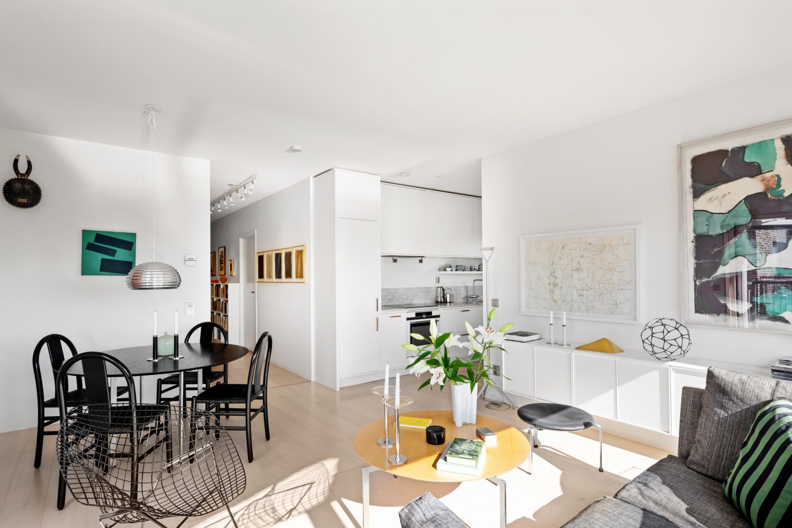 Ljus hall med bra avhängningsmöjligheter välkomnar och bjuder vy genom lägenheten mot stort fönsterparti i vardagsrum. Smakfullt kök, vardagsrum och matplats i öppen planlösning med utgång till ljuvlig hörnbalkong med sol under hela dagen. Milsvid utsikt över glittrande vatten, Lidingö, Kaknästornet, Djurgården och Nacka i fonden. Härligt ljust vardagsrum med stora fönsterpartier och gott om plats för soffgrupp och annan önskad möblering. Inbjudande matplats med plats för rejält matbord. Platsbyggt stilrent kök från Lappvattnets snickeri med bänkskiva och stänkskydd i ljusgrå Carraramarmor och vitvaror från Siemens. Kombinerad ugn/micro med induktionshäll samt helintegrerad kyl, frys och diskmaskin. Från kök utgång till ytterligare en härlig balkong med fri sjöutsikt över Lilla Värtan och mot Lidingö. Master bedroom med hel garderobsvägg, fönster mot balkongen och samma härliga utsikt över Lilla Värtan. Ytterligare ett fint sovrum med hörnläge och fönster mot båda balkongerna. Mitt emot Master bedroom ett exklusivt badrum med Carraramarmor på golv och i dusch, stor spegel och handfat samt kombinerad tvättmaskin/torktumlare under bänkskiva i Carraramarmor. Intill badrum en rymlig klädkammare med garderober. Genomgående golv i vitpigmenterad och mattlackerad ekplank med vattenburen golvvärme.