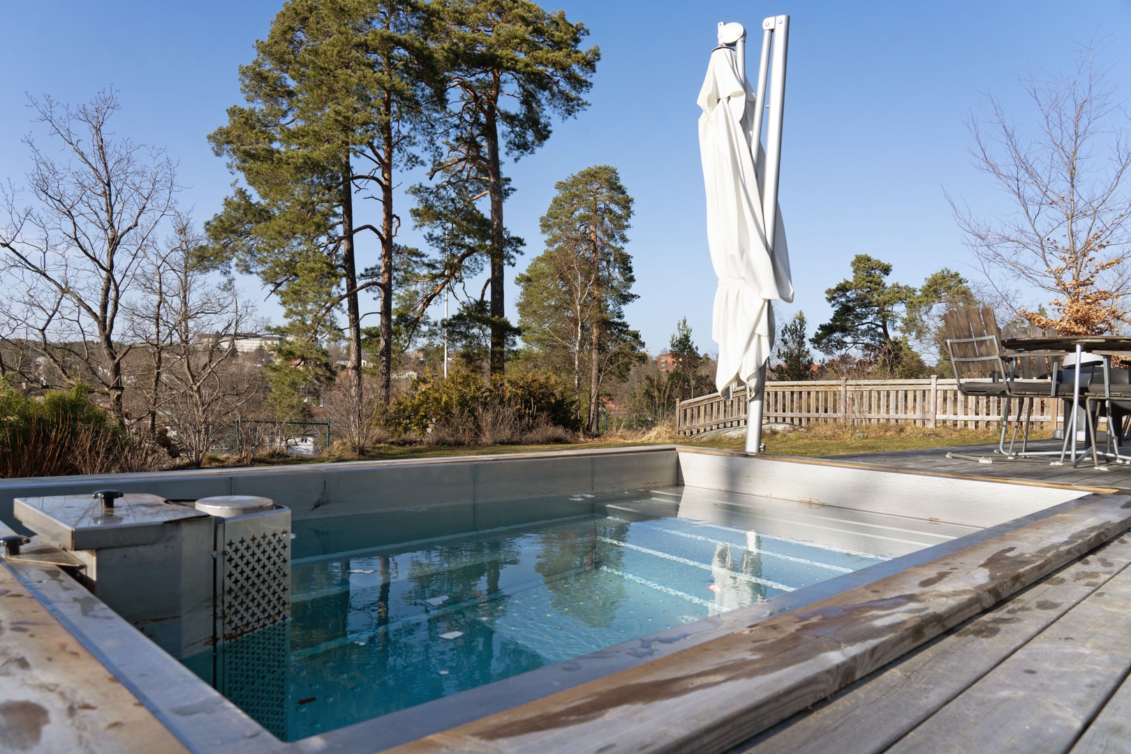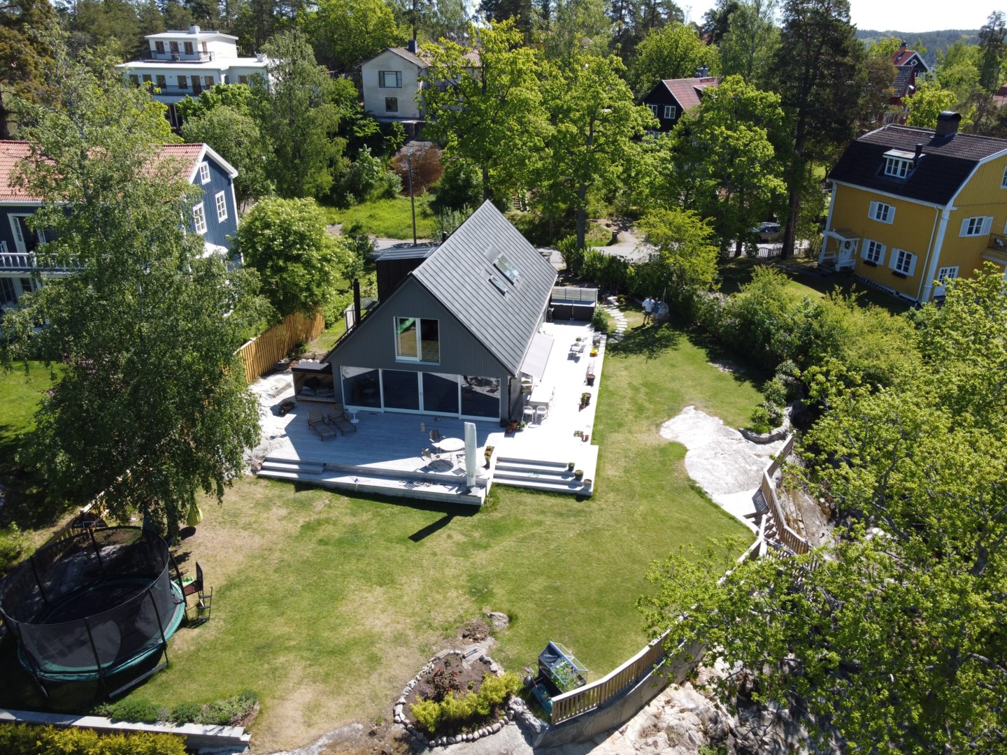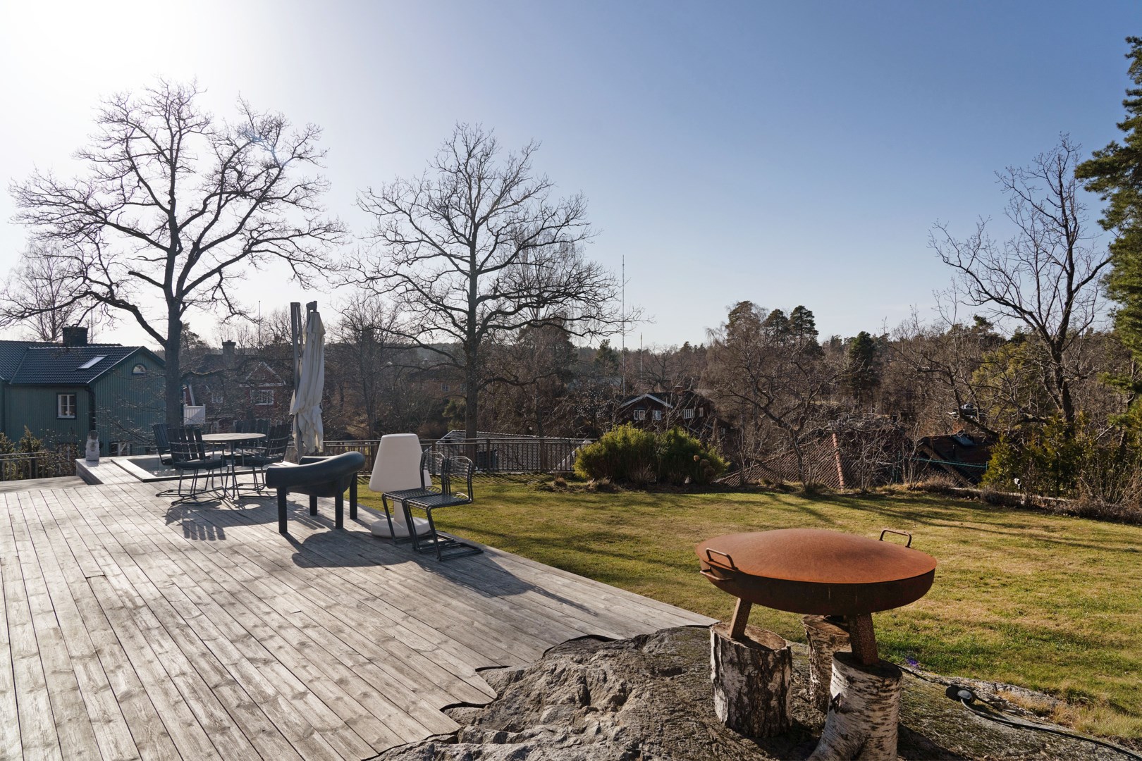 Utemiljön är trivsam med en plan insynsskyddad trädgård med väl tilltaget trädäck. Härlig vy över villaområdet nedanför, på kvällen blir det LA-känsla med de upplysta lamporna på andra sidan dalen. Uppvärmd badtunna från Modulpool och plats för flertalet olika sittgrupper och grill. Flera av entréplanets rum har pardörrar ut till altanen som omsluter huset. Träd och buskar är belysta, liksom husfasaden. Den stora tomten fortsätter även ner mot en terrasserande sluttning, perfekt för odlingar och för middagar sena sommarkvällar. På tomten står en friggebod uppdelad i ett uppvärmt hemmakontor/gästrum samt ett kallförråd. Uppfarten har plats för ca 3-4 bilar.