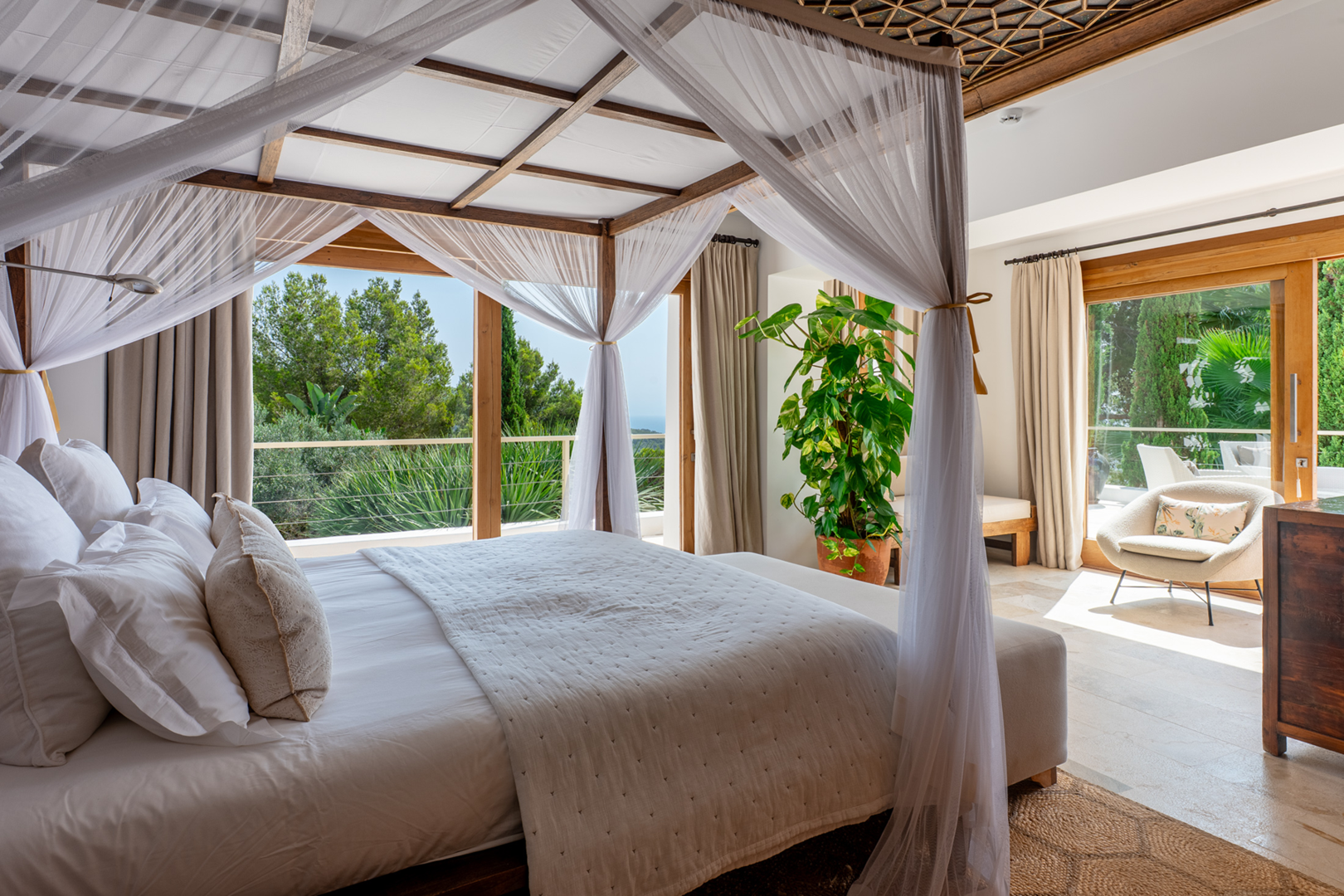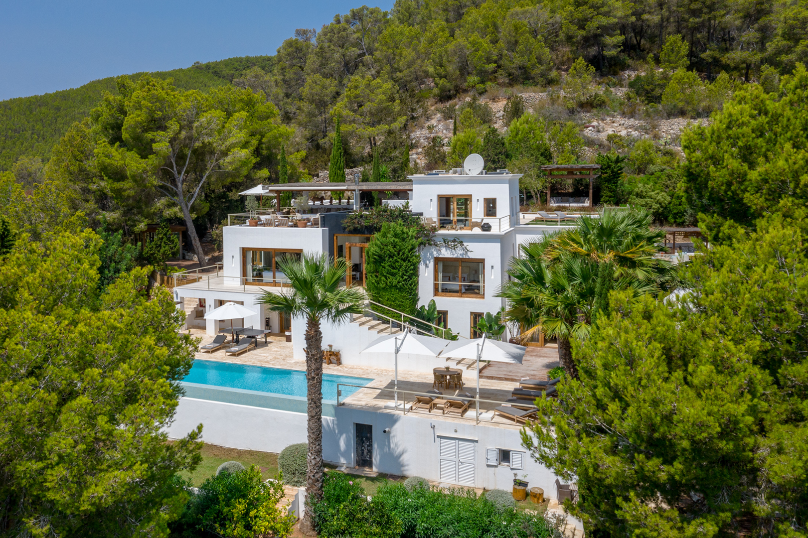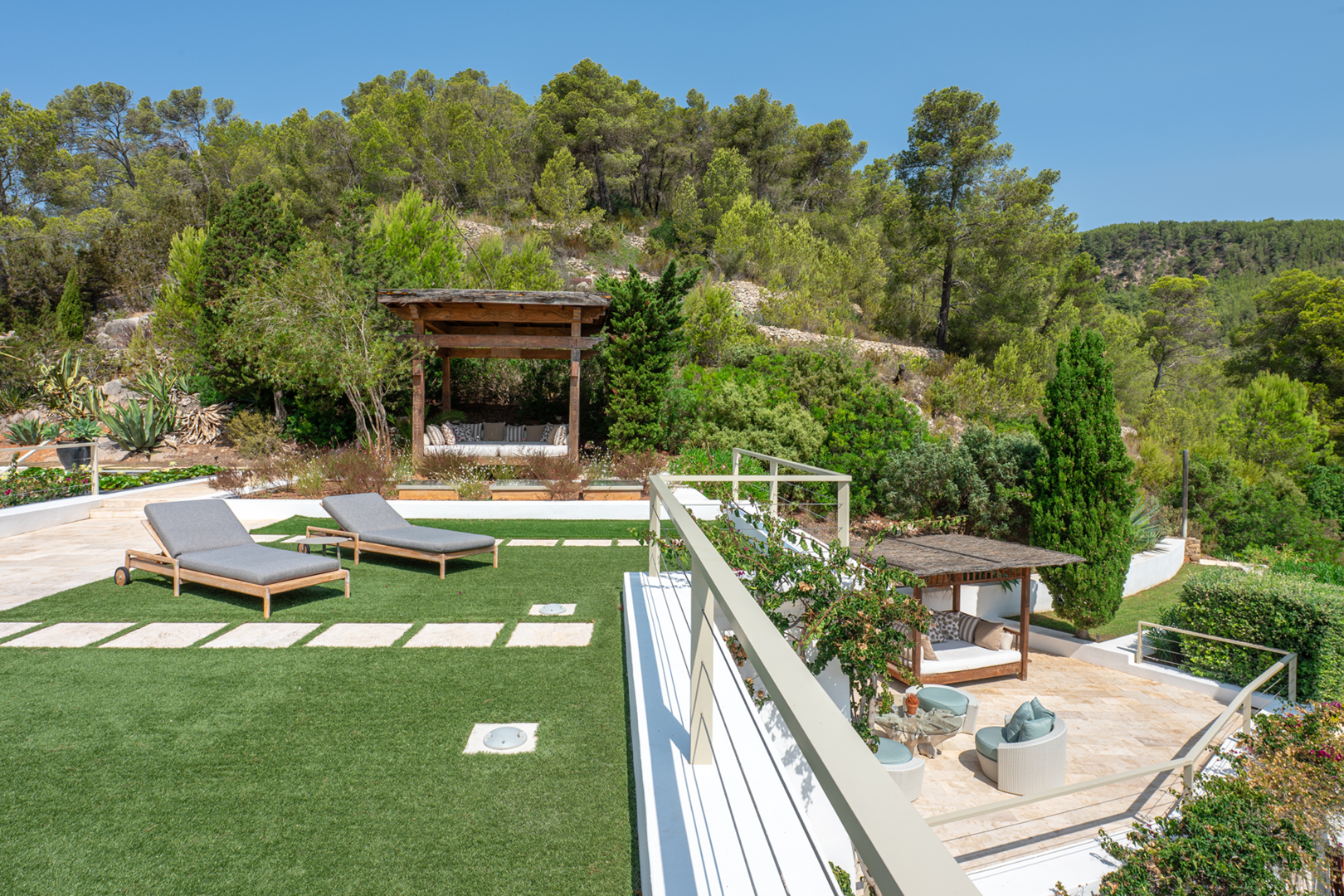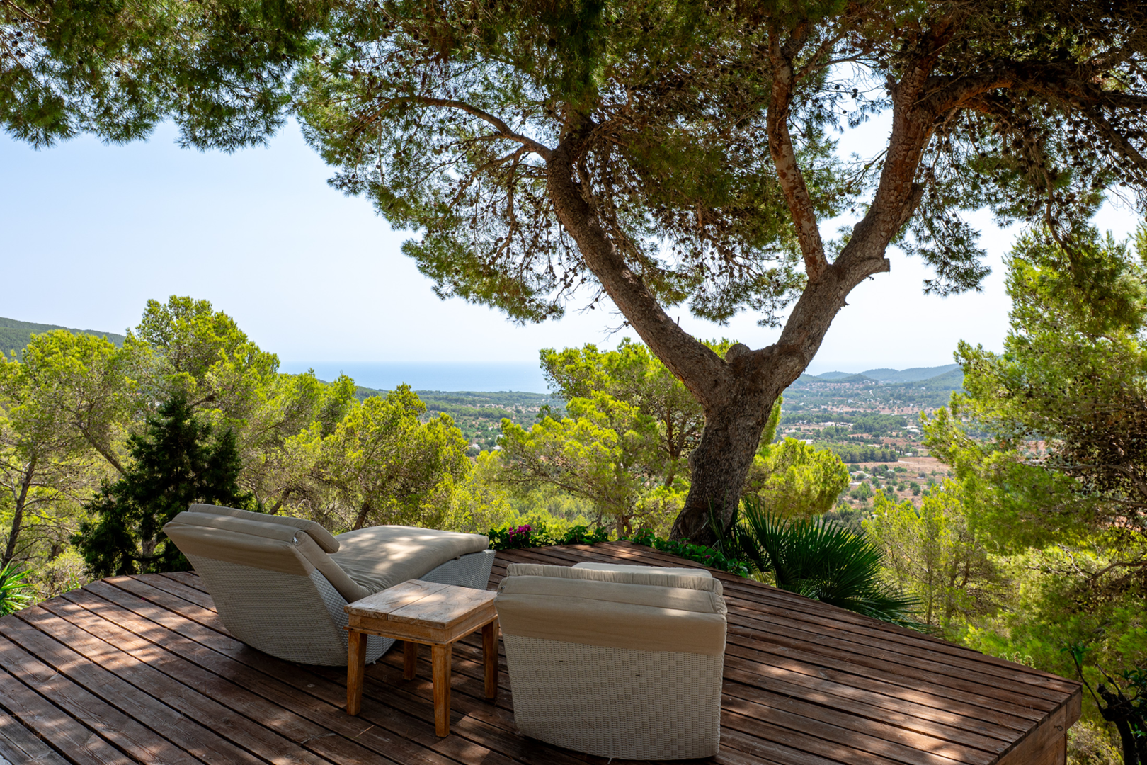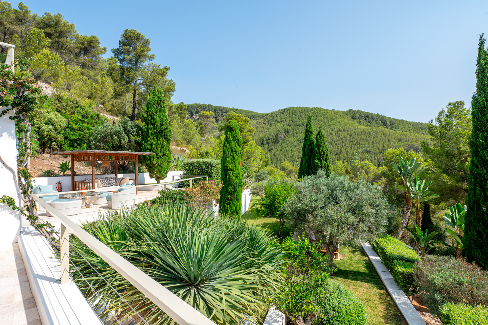 The rooftop terrace is the crown jewel of the villa. With an elegant outdoor dining area and a chic seating area, it offers unobstructed 270-degree views over the valley of Morna and the Mediterranean Sea, a truly unique viewpoint to appreciate the natural beauty of Ibiza.