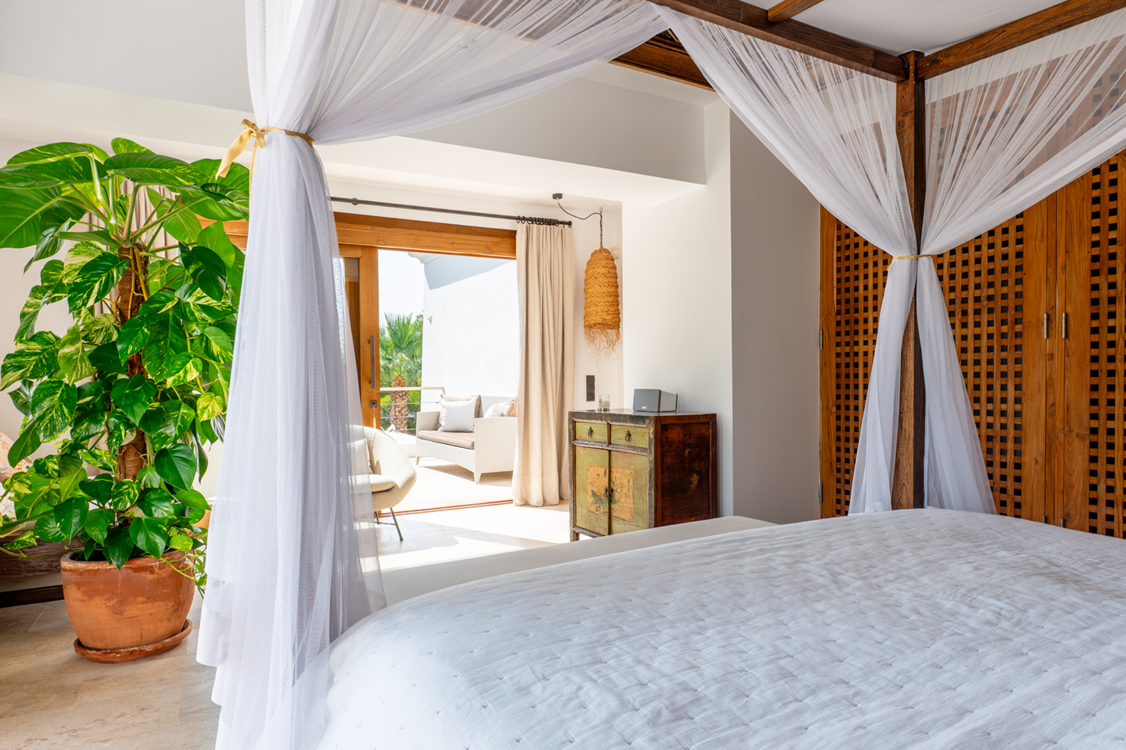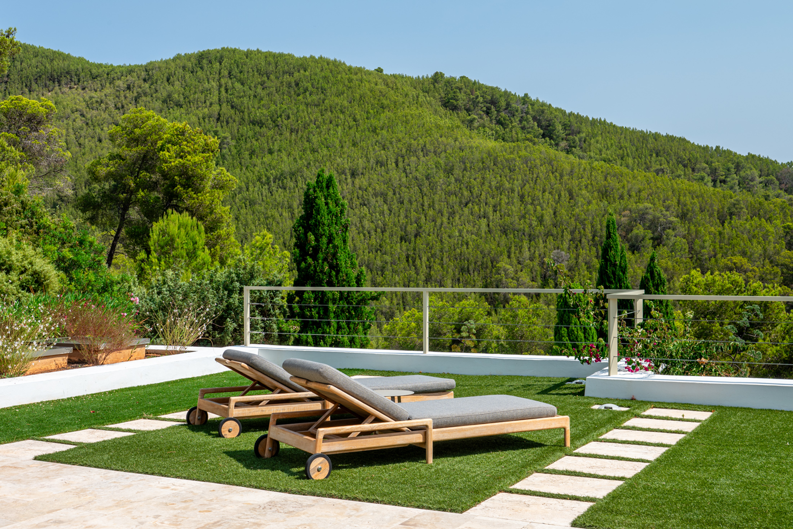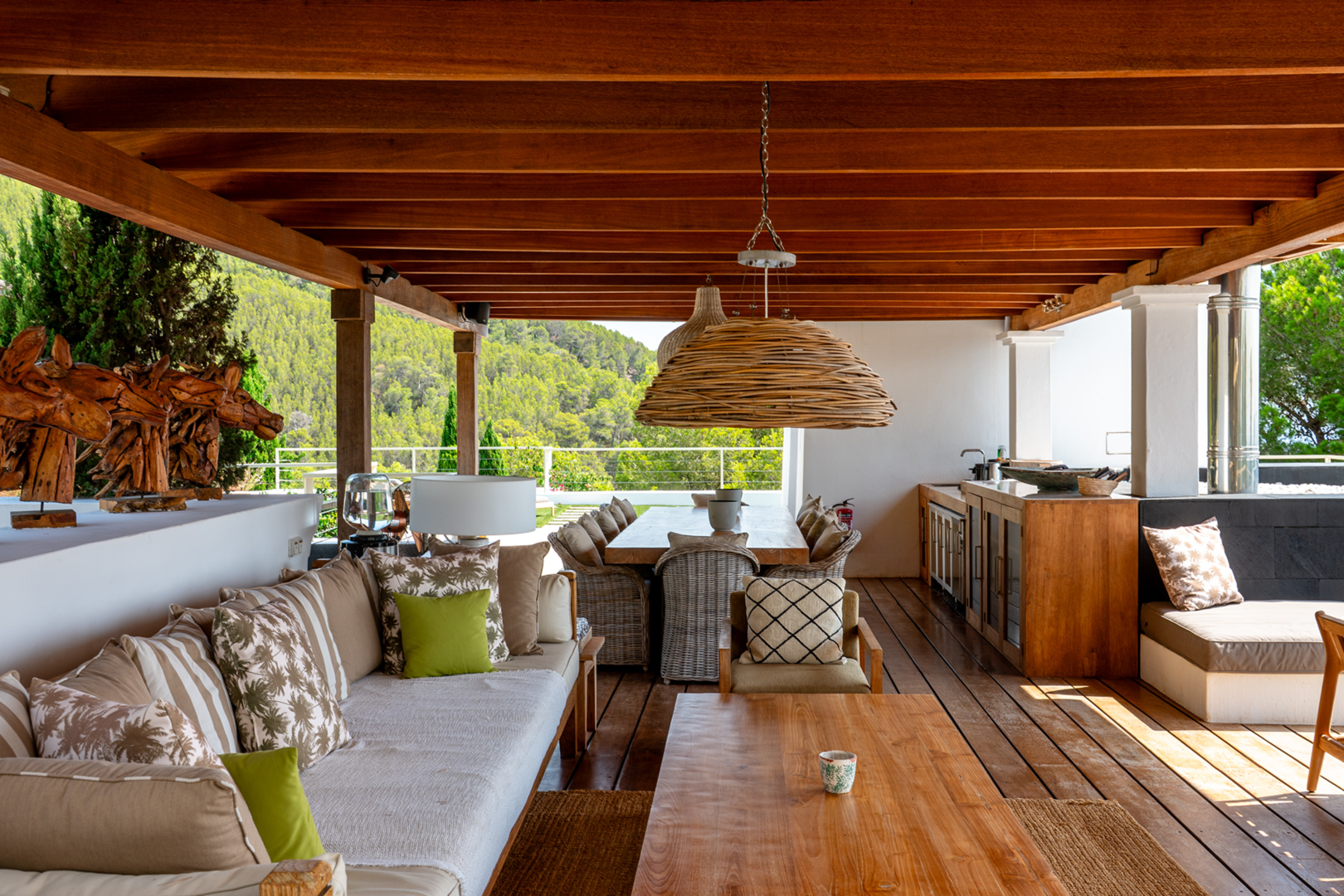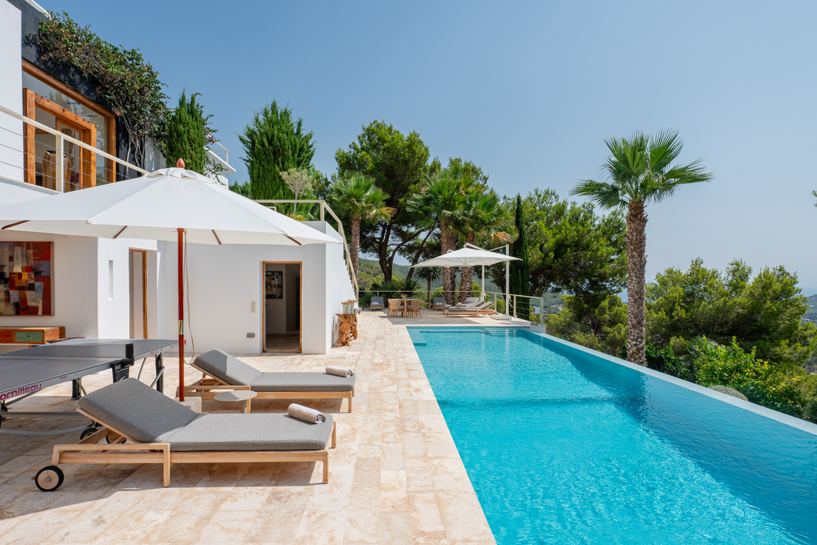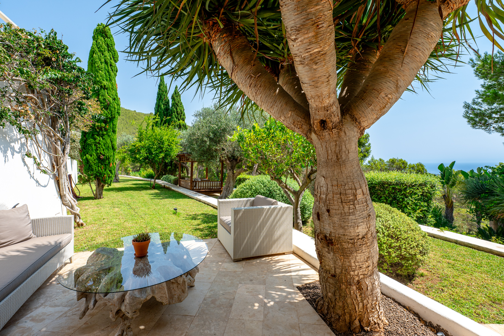 The rooftop terrace is the crown jewel of the villa. With an elegant outdoor dining area and a chic seating area, it offers unobstructed 270-degree views over the valley of Morna and the Mediterranean Sea, a truly unique viewpoint to appreciate the natural beauty of Ibiza.