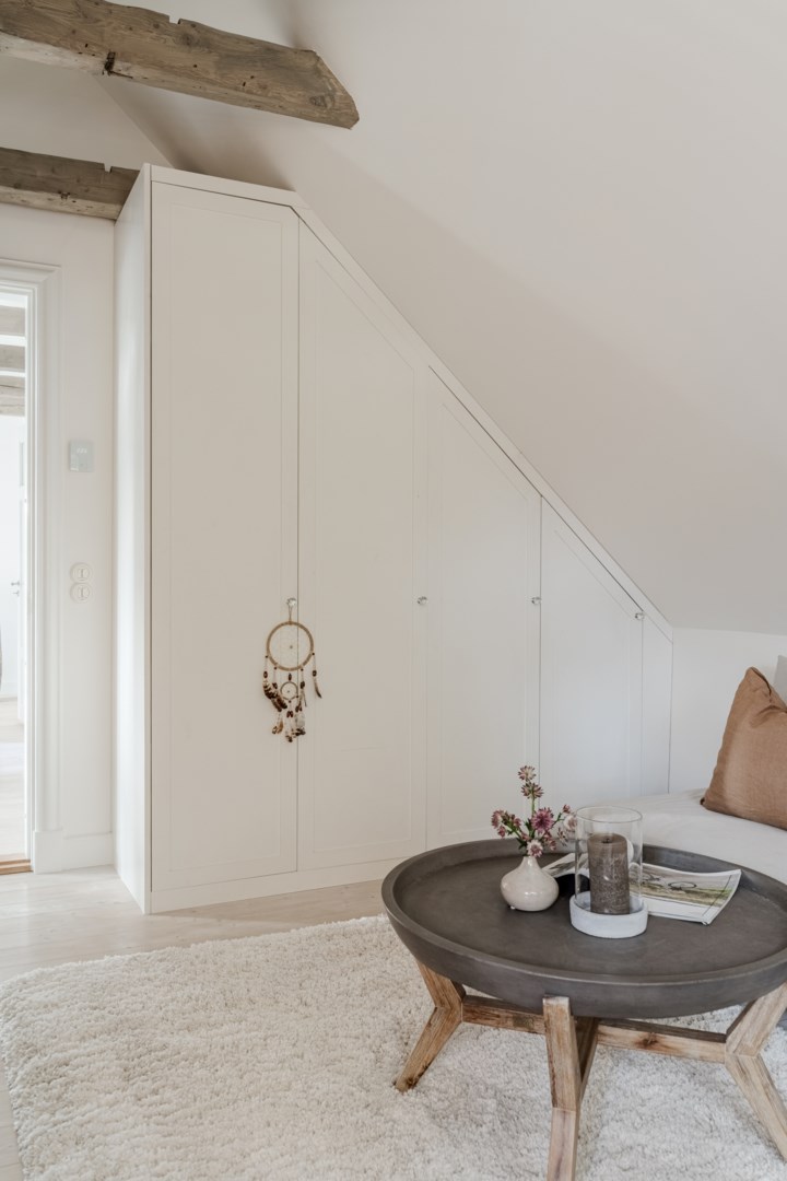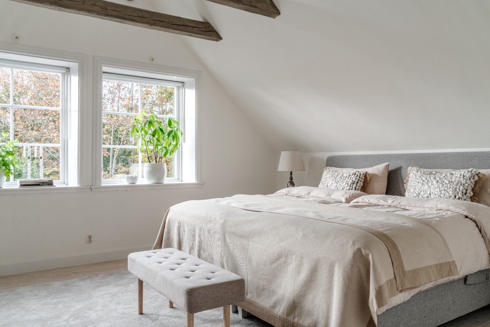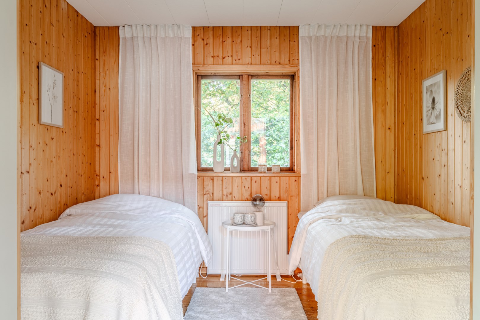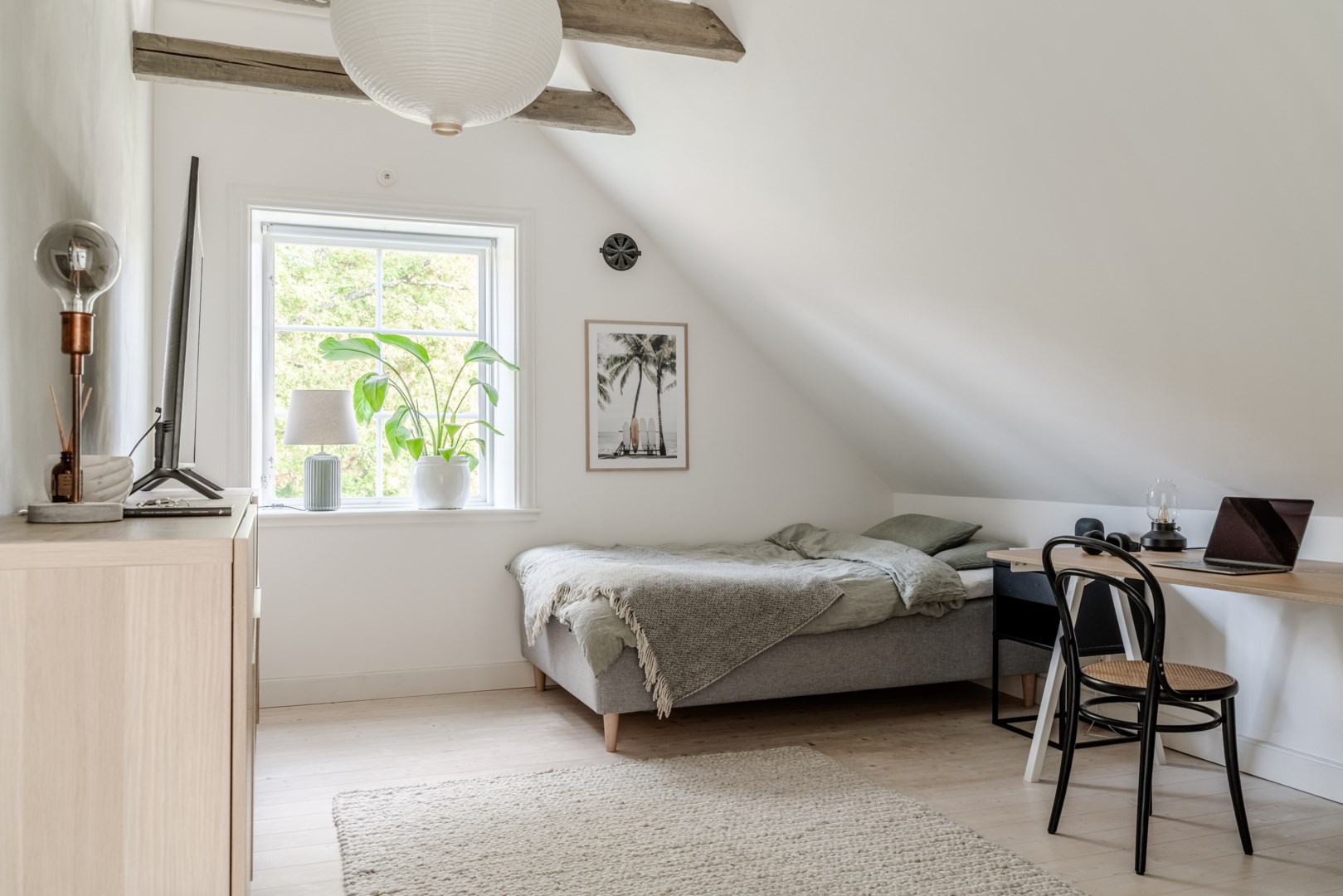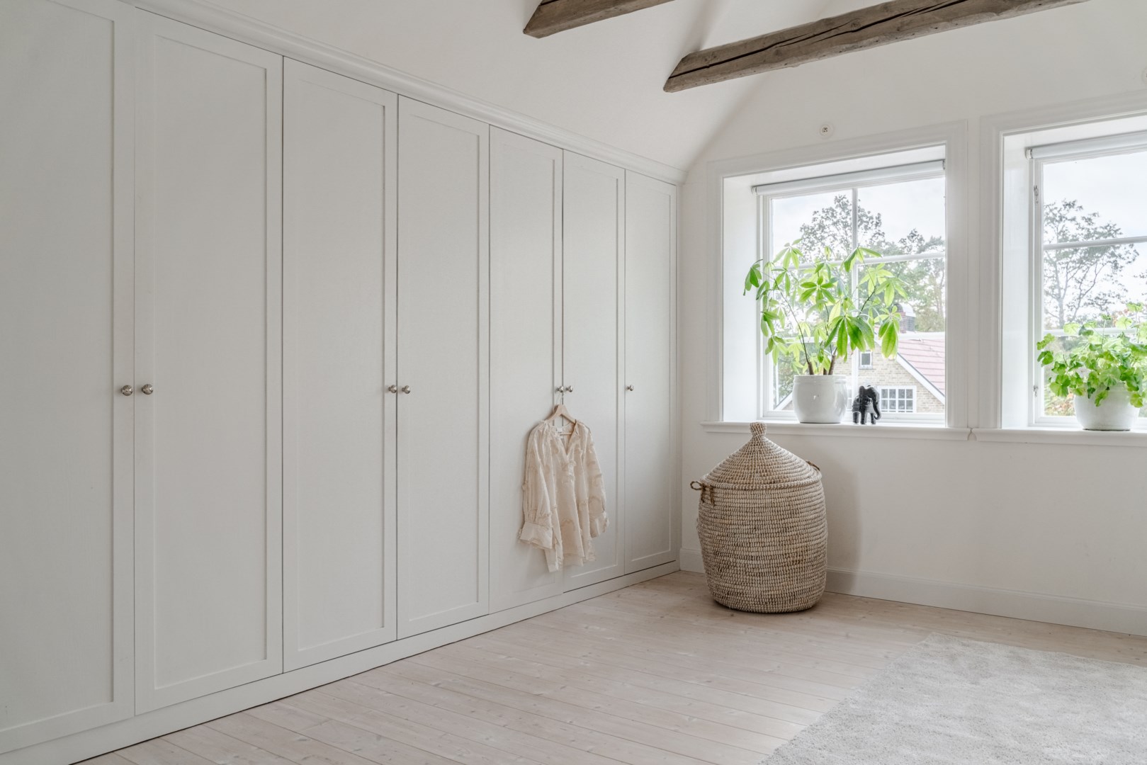 I husets östra gavel finns två lika stora sovrum, båda med platsbyggda garderober och samma vackra takhöjd.