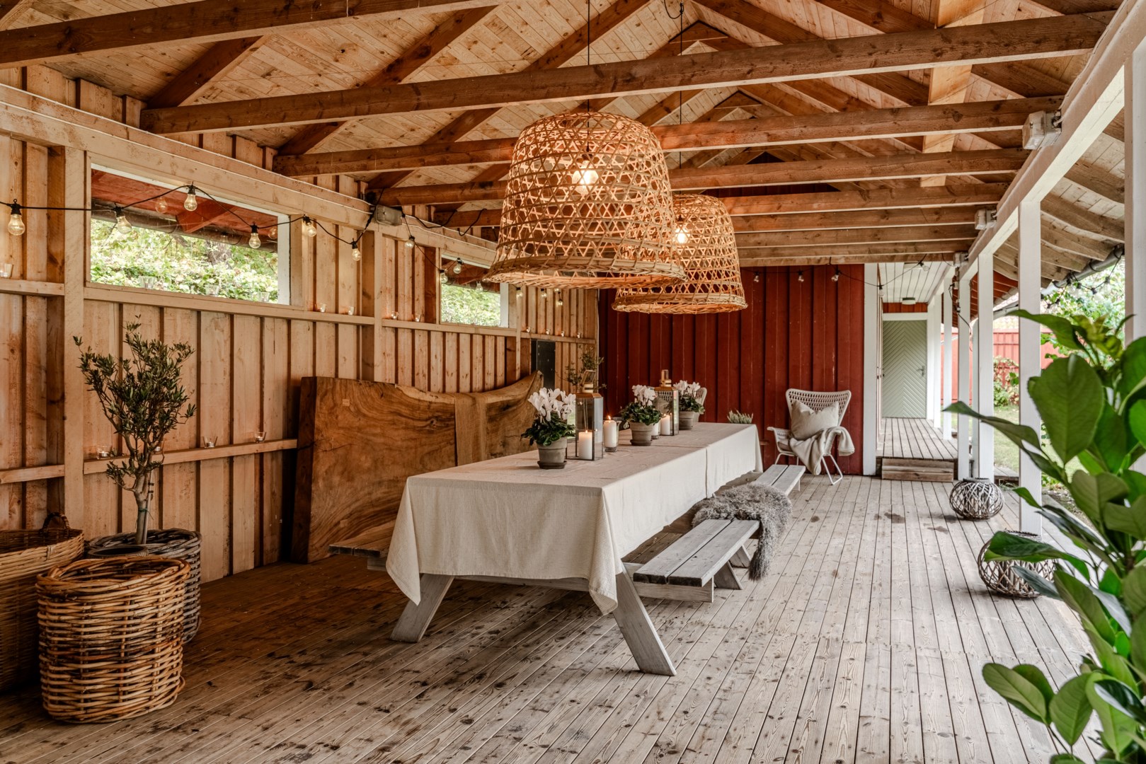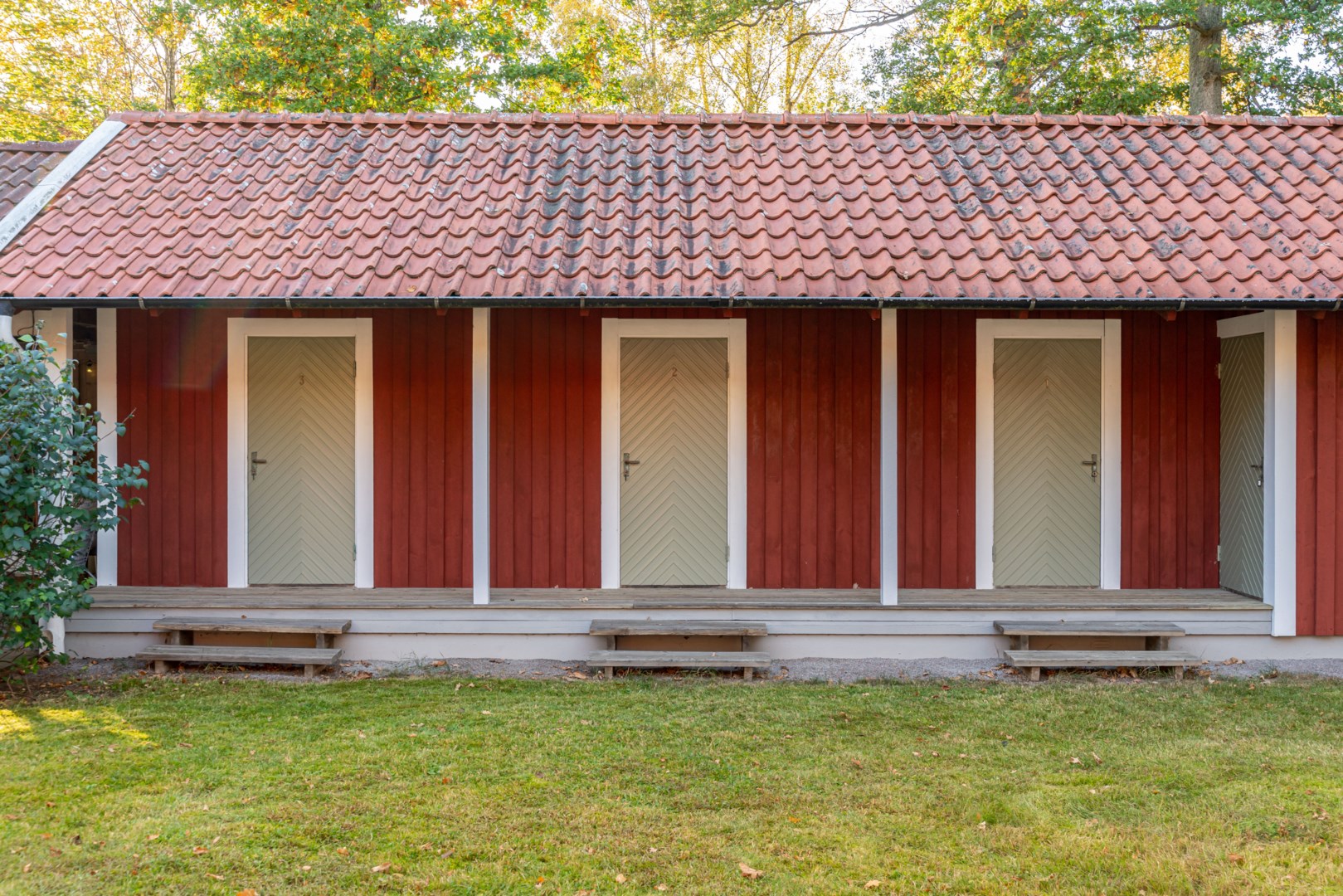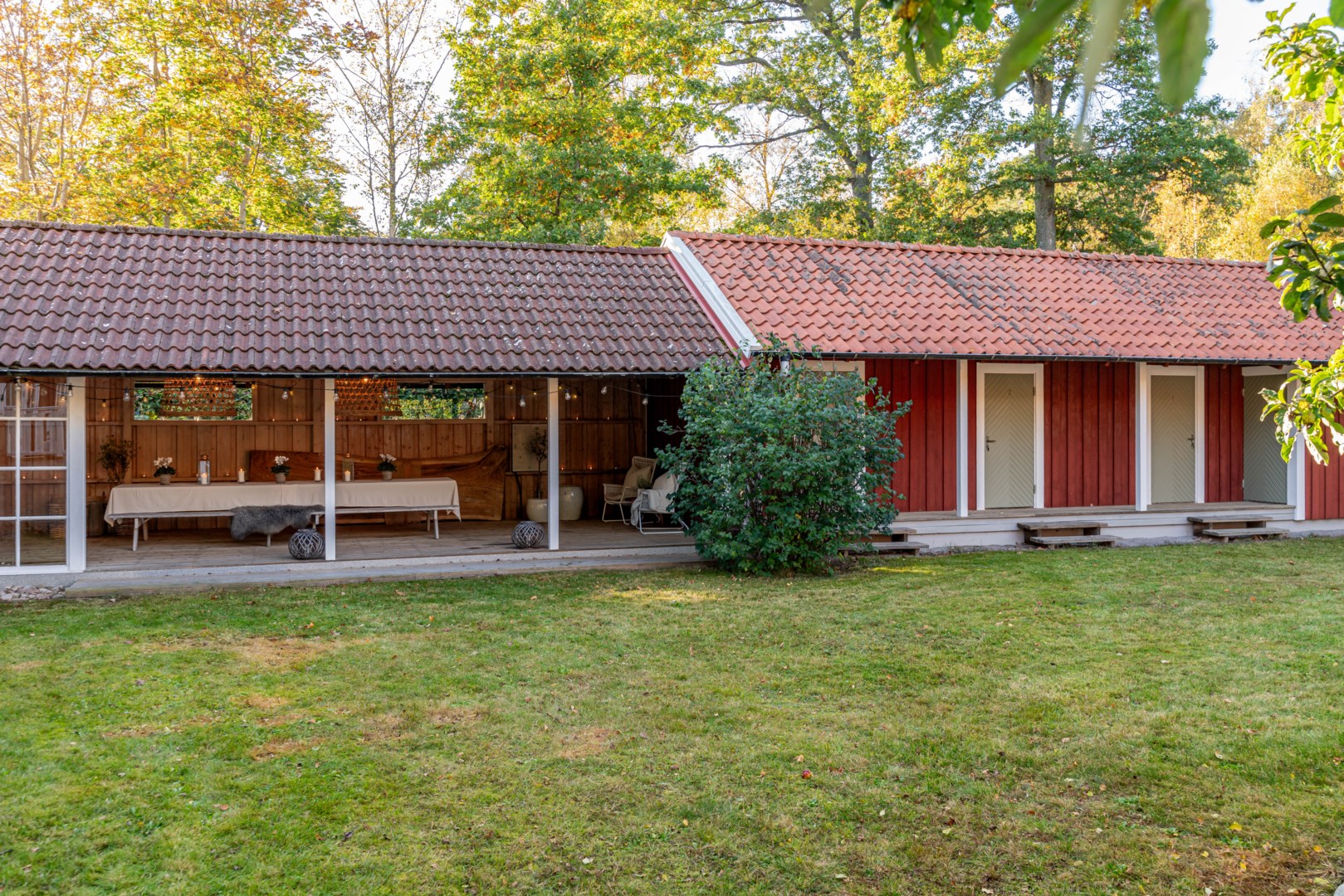Det överbyggda uterummet har öppet upp i nock och trägolv, en härlig plats för sommarens fester. I anslutning finns en länga med tre sovrum, alla med träpanel, trägolv och dubbla garderober. Här finns även ett badrum med dusch och toalett samt en separat toalett med handfat (ej inkopplade i dagsläget). Möjlighet finns att installera pentry. På gaveln ligger ett rymligt trädgårdsförråd.