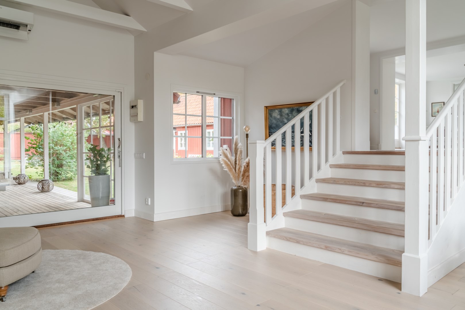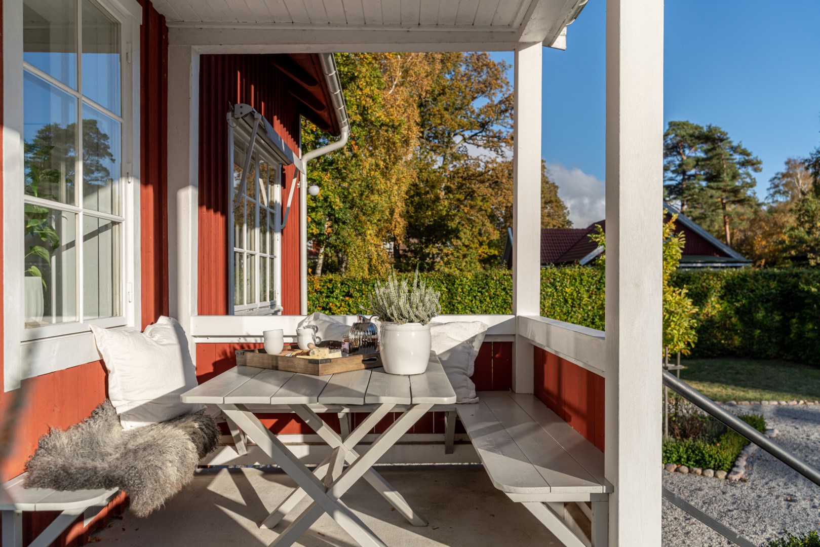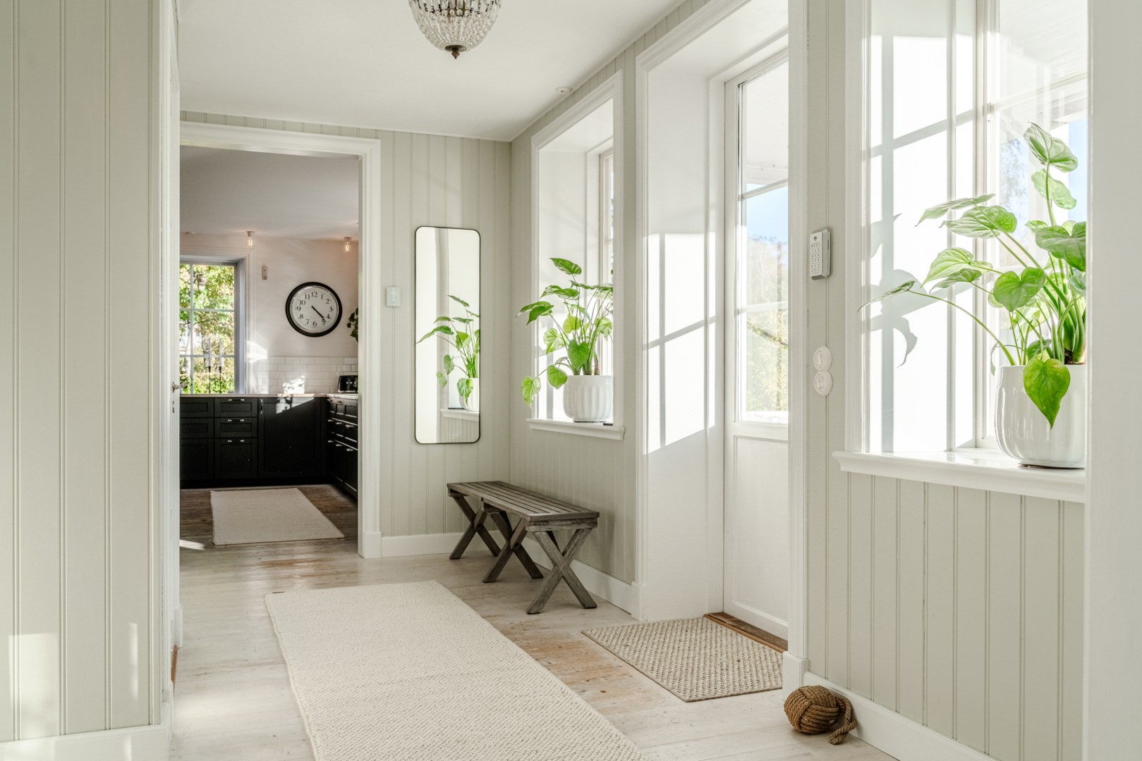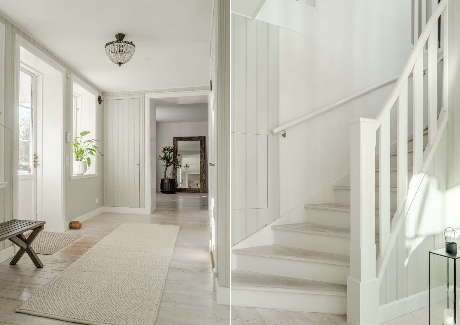 Entrén nås via en överbyggd veranda med platsbyggda bänkar och bord – en inbjudande plats för morgonkaffet eller middag i kvällssolen. Den ljusa hallen välkomnar med gråmålad pärlspont och två platsbyggda garderober infällda i väggen. Från hallen leder den platsbyggda trappan vidare både till övervåningen och till källarplanet.