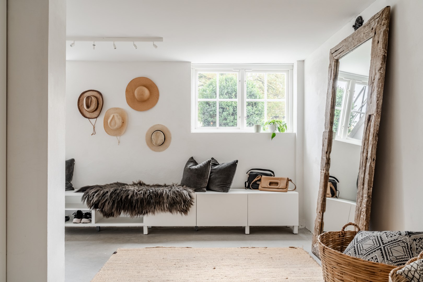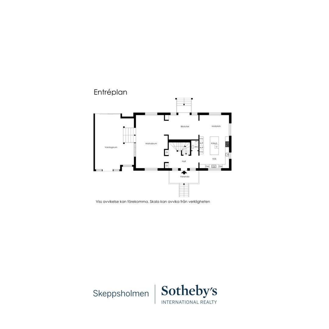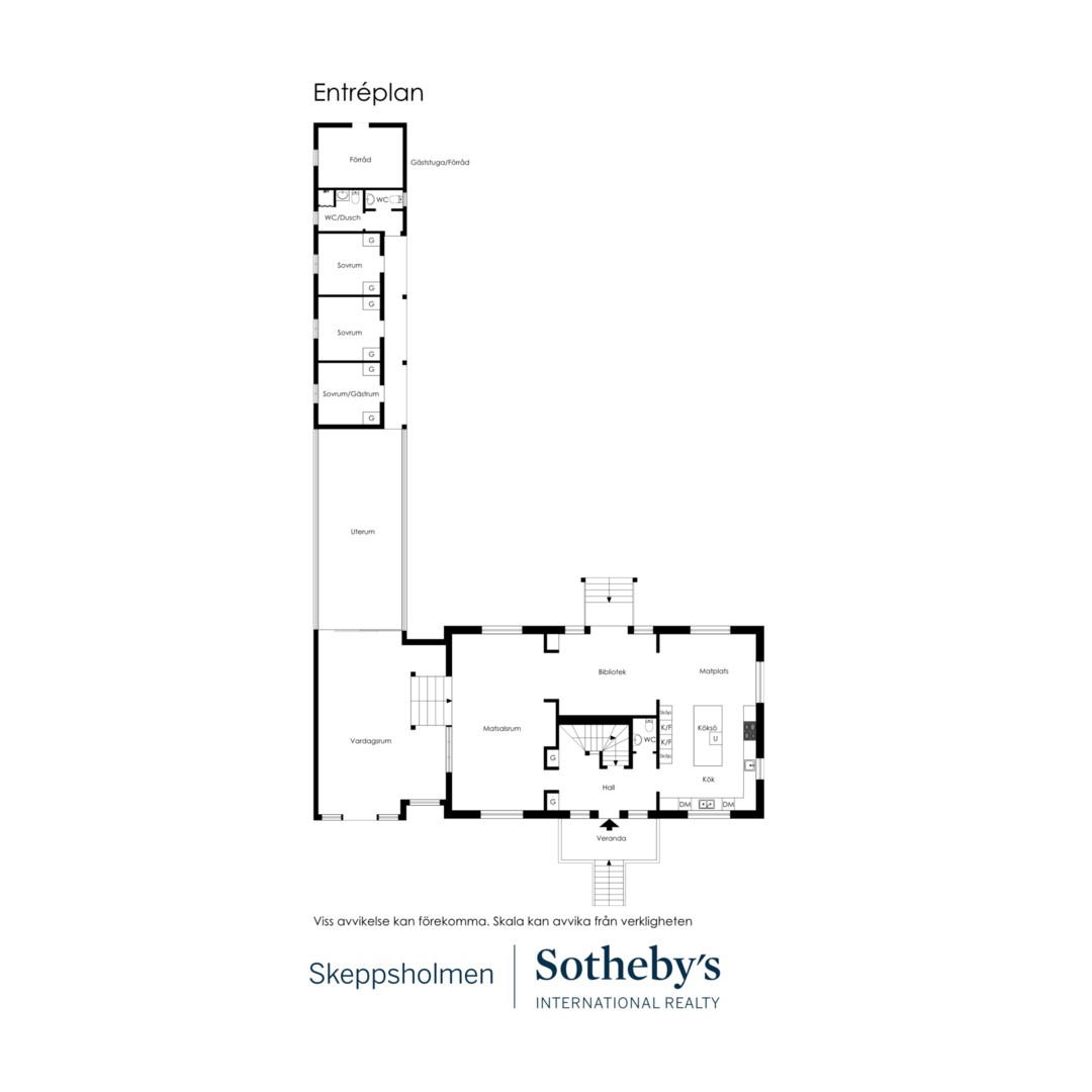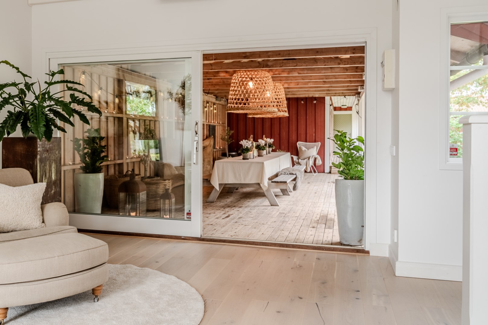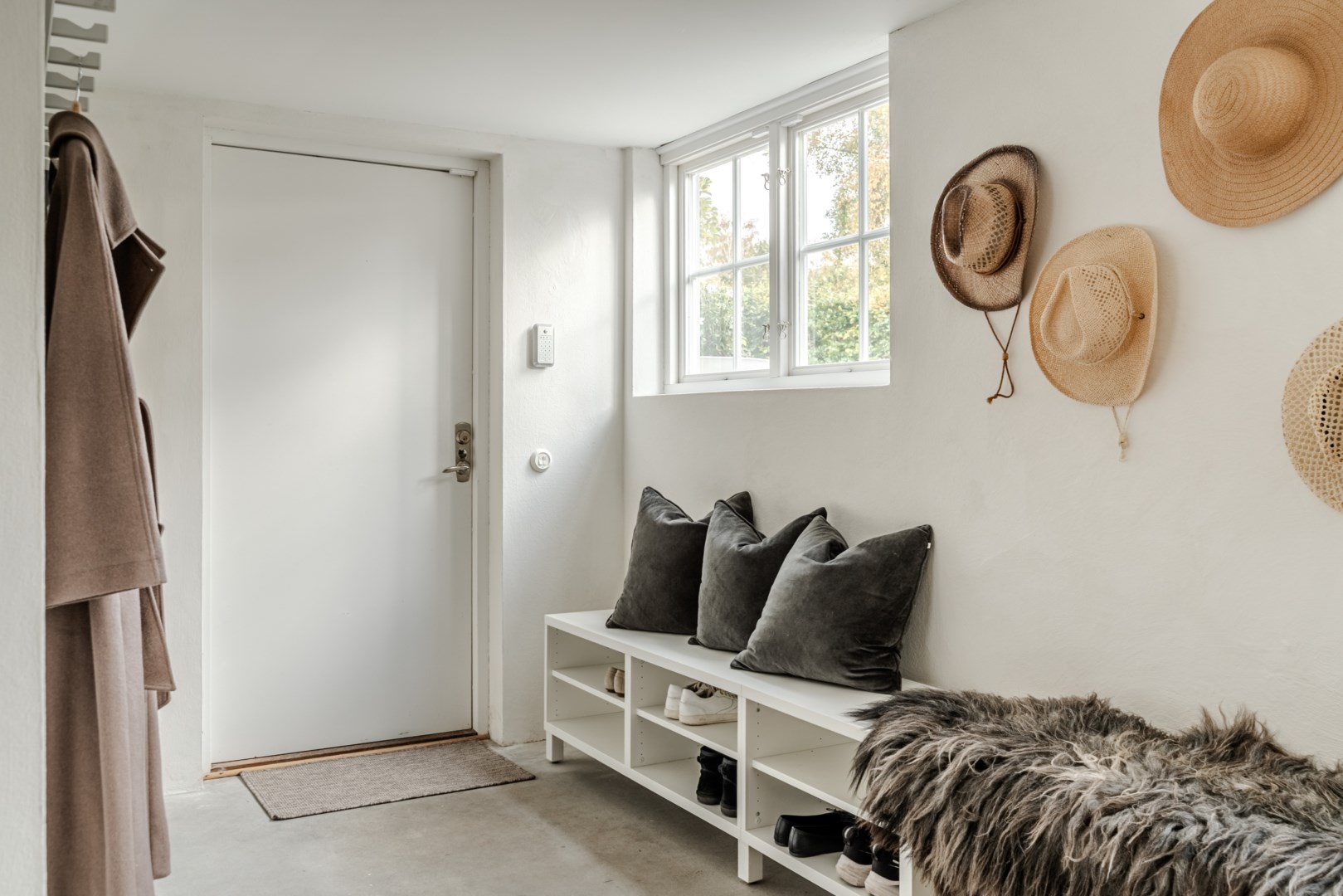 Entrén nås via en överbyggd veranda med platsbyggda bänkar och bord – en inbjudande plats för morgonkaffet eller middag i kvällssolen. Den ljusa hallen välkomnar med gråmålad pärlspont och två platsbyggda garderober infällda i väggen. Från hallen leder den platsbyggda trappan vidare både till övervåningen och till källarplanet.