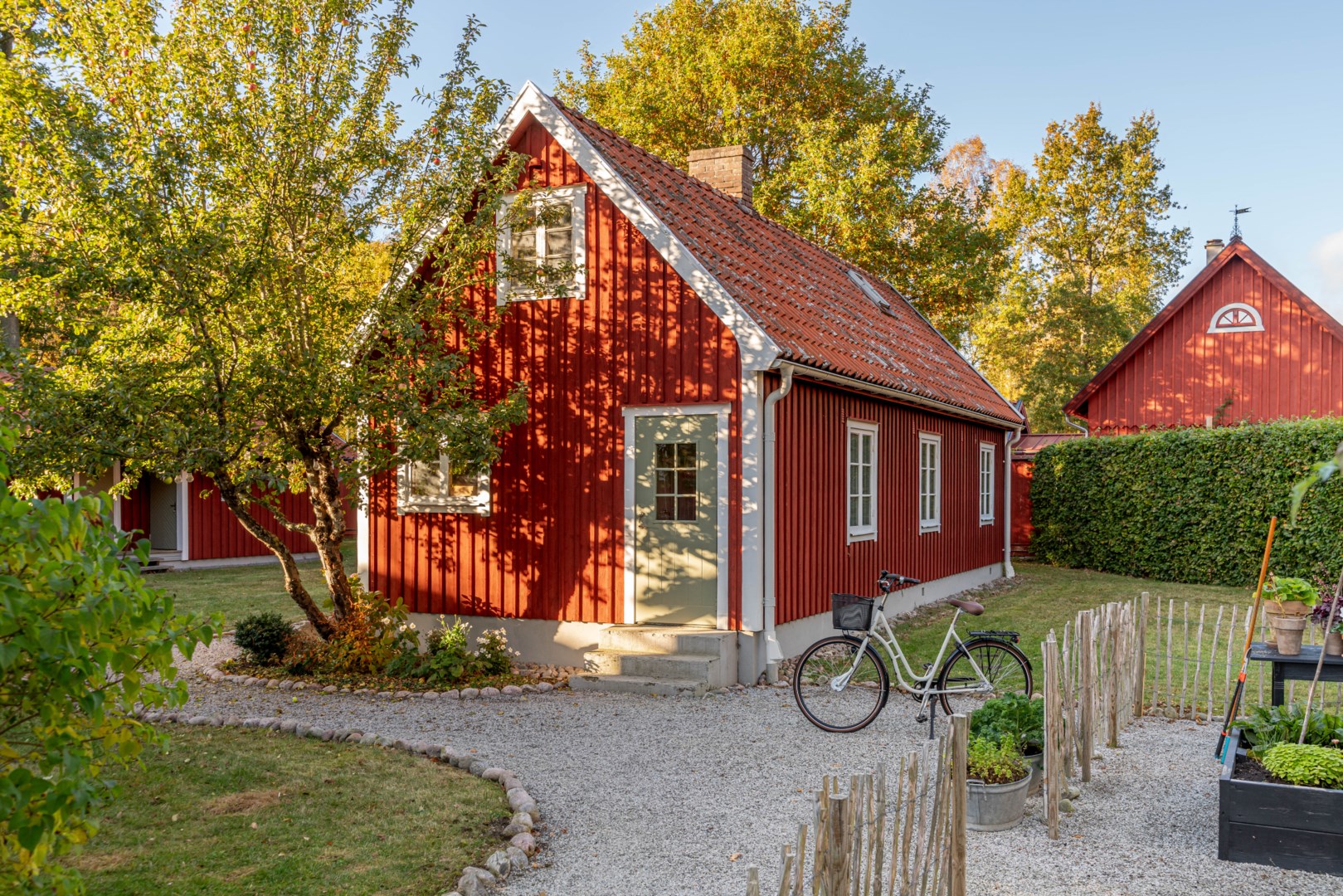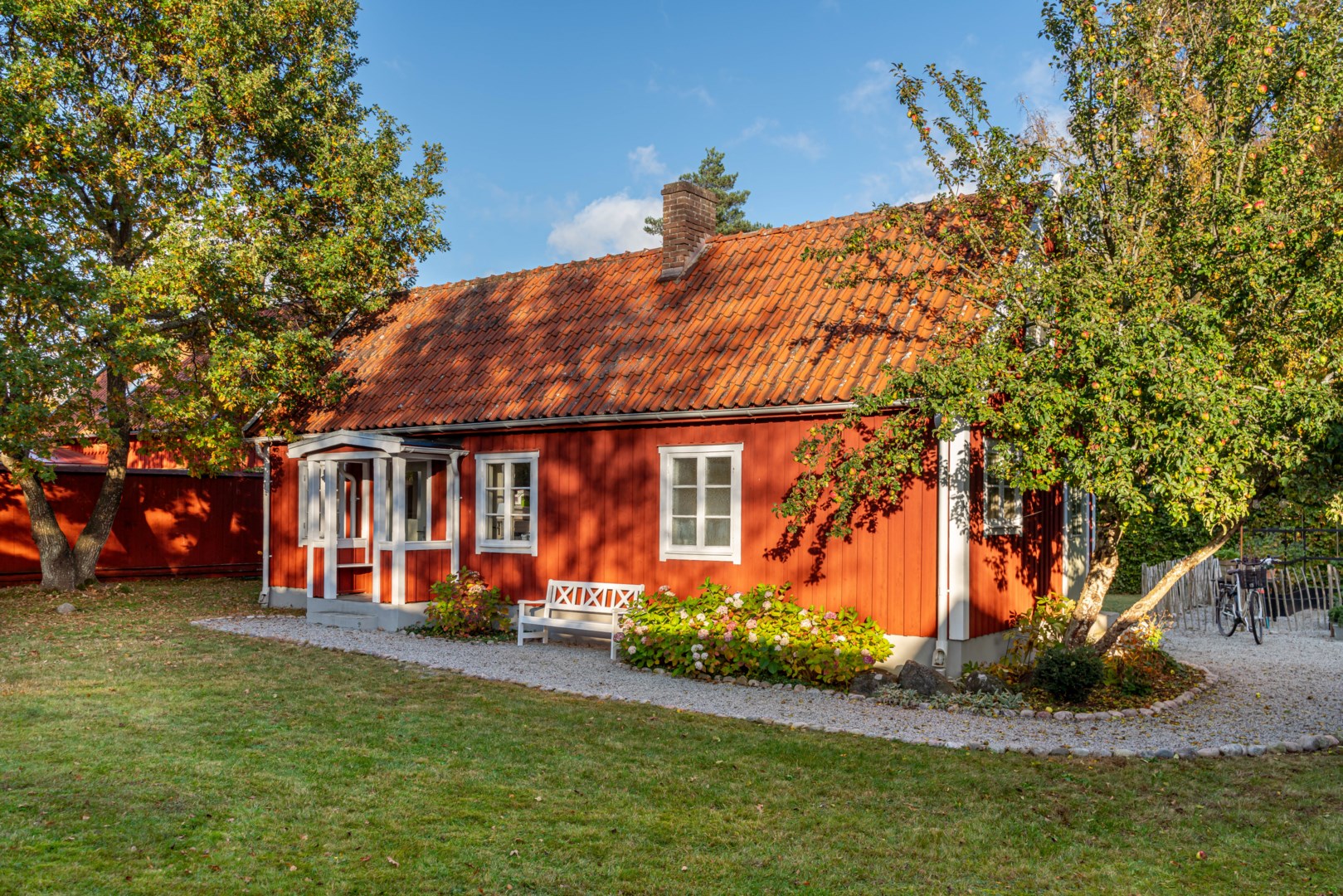 Det fristående gästhuset välkomnar med veranda och fasta bänkar. Invändigt finns hall och två sovrum med fönster i två väderstreck samt infällda garderober. En separat del med ingång från gaveln, rymmer badrum och tidigare tvättstuga. Vind med inrett rum. Huset är förberett för anslutning till jordvärme, vatten och el via kulvert från huvudbyggnaden.