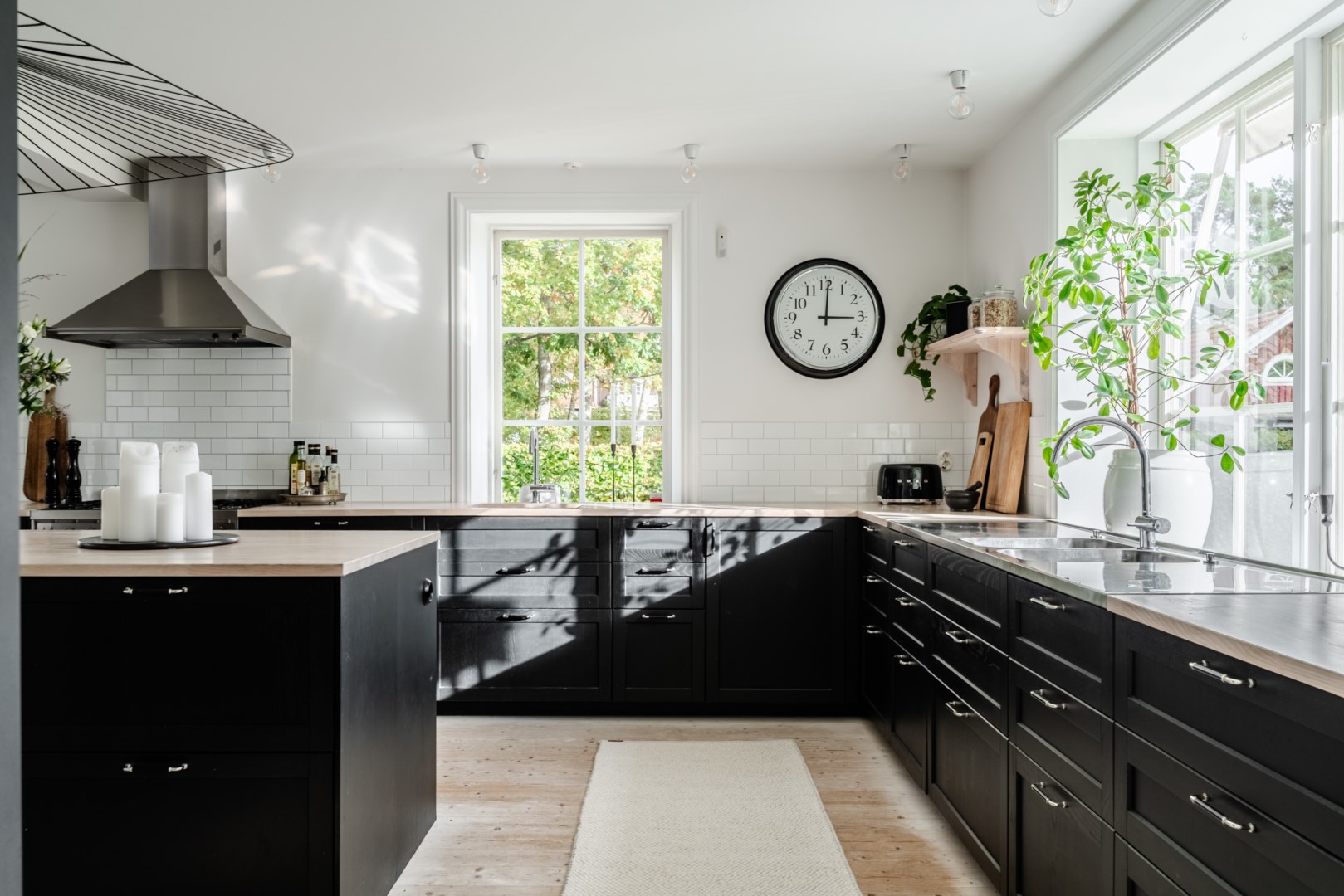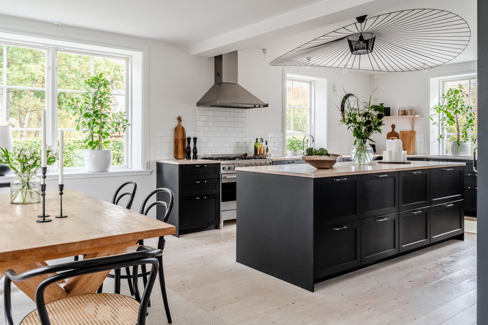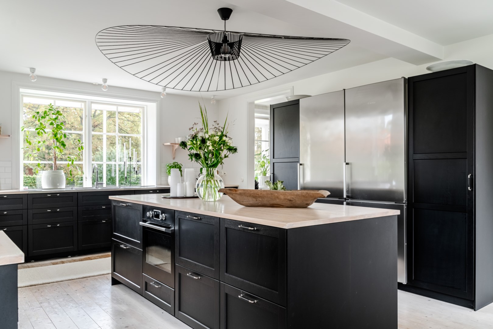 Svart köksinredning med vitvaxade bänkskivor i ask, hel diskbänk och två vaskar. Stora spröjsade fönster i tre väderstreck skapar ett vackert ljusspel under dagen. El är framdragen för vinkyl både i högskåp och köksö. För den som önskar sittplatser vid köksön går det utmärkt att ta bort underskåpen närmast kylen för att ge plats åt pallar.
