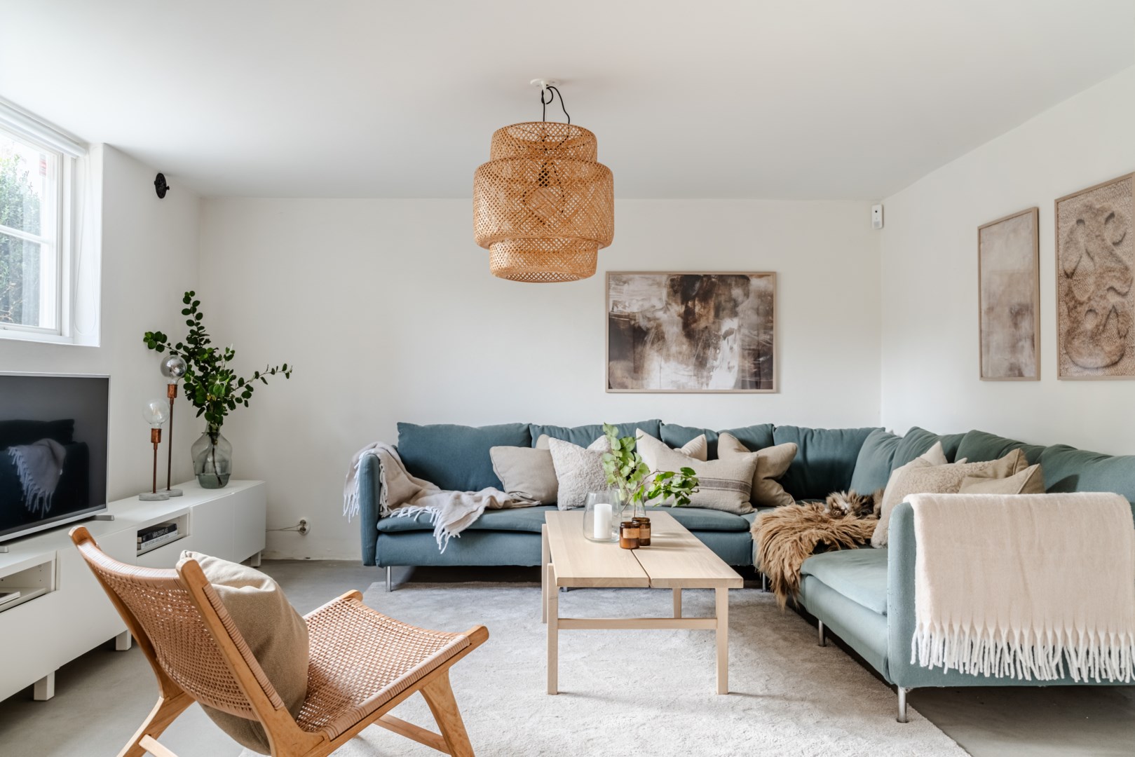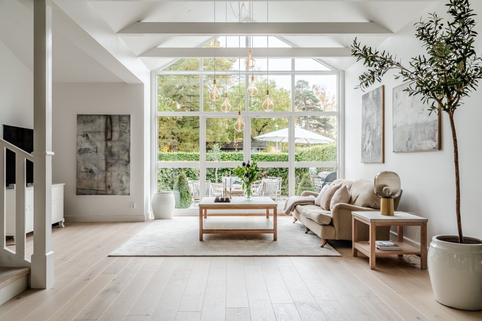 Vardagsrummet ligger ett etage ned och bjuder på imponerande takhöjd med öppet upp i nock. De stora fönsterpartierna och glasade dubbeldörrarna öppnar mot en solig, häckomgärdad uteplats i söderläge, medan motsatt sida leder ut till ett överbyggt uterum mot innergården. Golvet är lagt i vitpigmenterad enstavs ekparkett. Här finns även luft/luftvärmepump med AC-funktion.