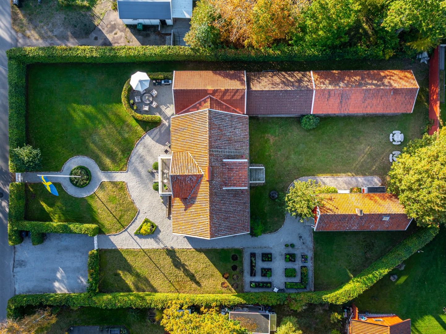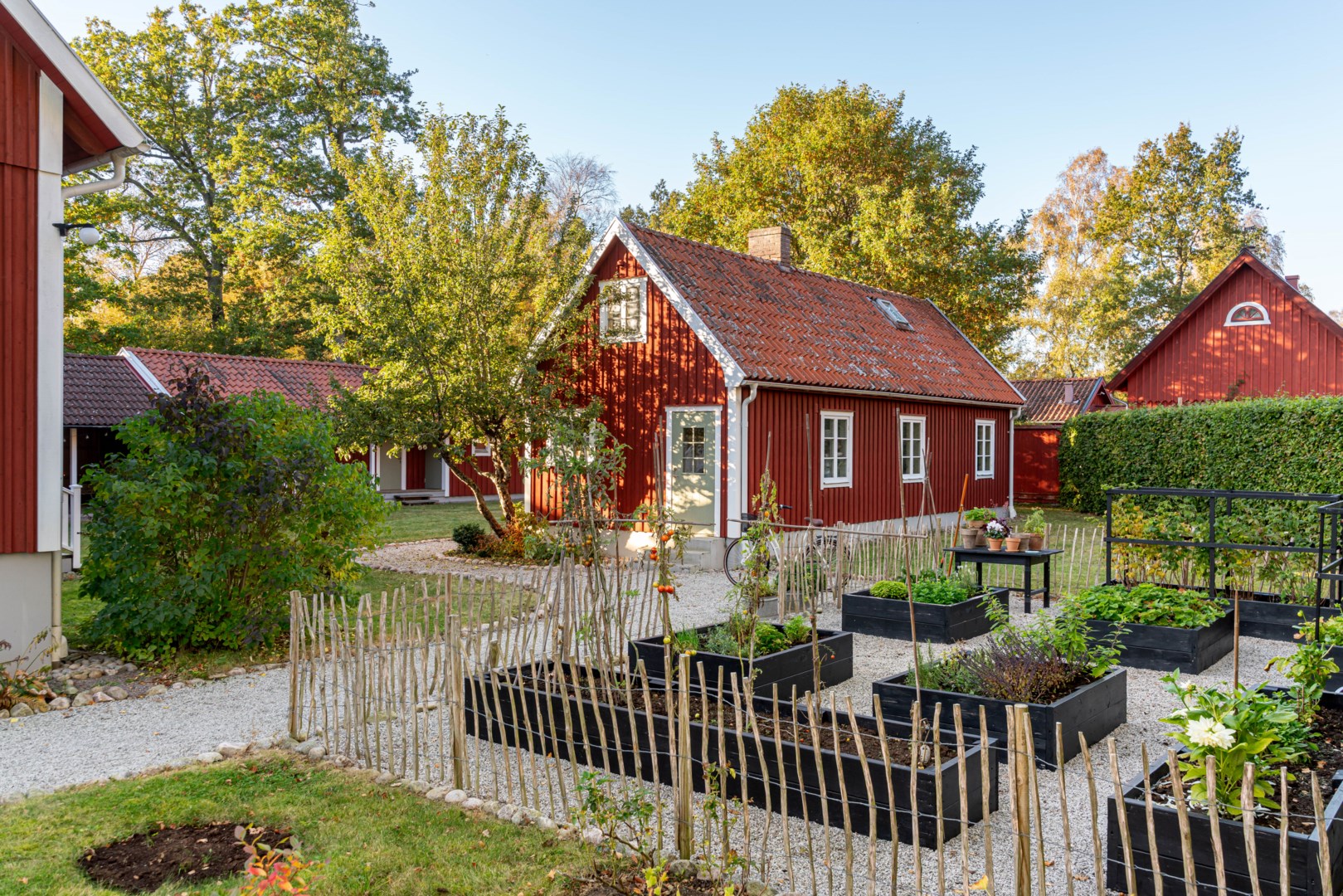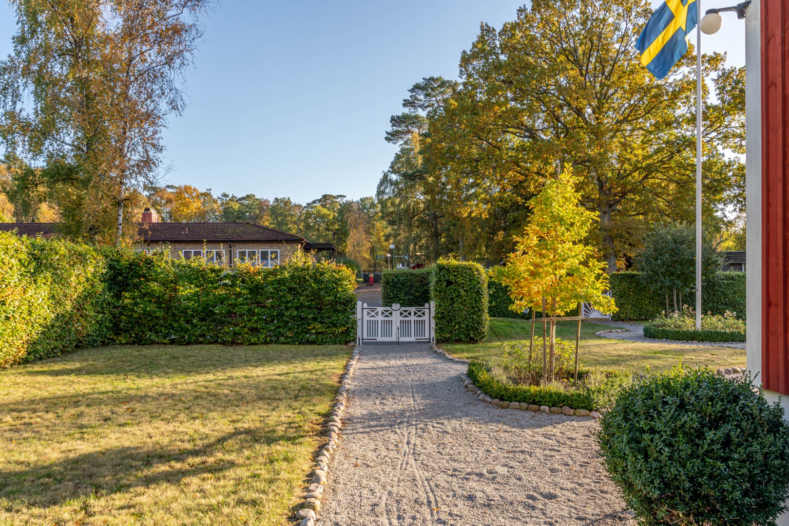 Trädgården är en privat, insynsskyddad omgiven av höga bokhäckar. Även den klassisk i sitt formspråk med knastrande grusgångar, rundel framför huset med flaggstång, vackra solgrindar, klättrande rosor och en stor köksträdgård. Olika trädgårdsrum som erbjuder både sol och skugga. Utöver huvudbyggnaden finns en charmig gästlänga med tre sovrum och ett badrum samt ett fristående gästhus som väntar på nästa ägares vision.