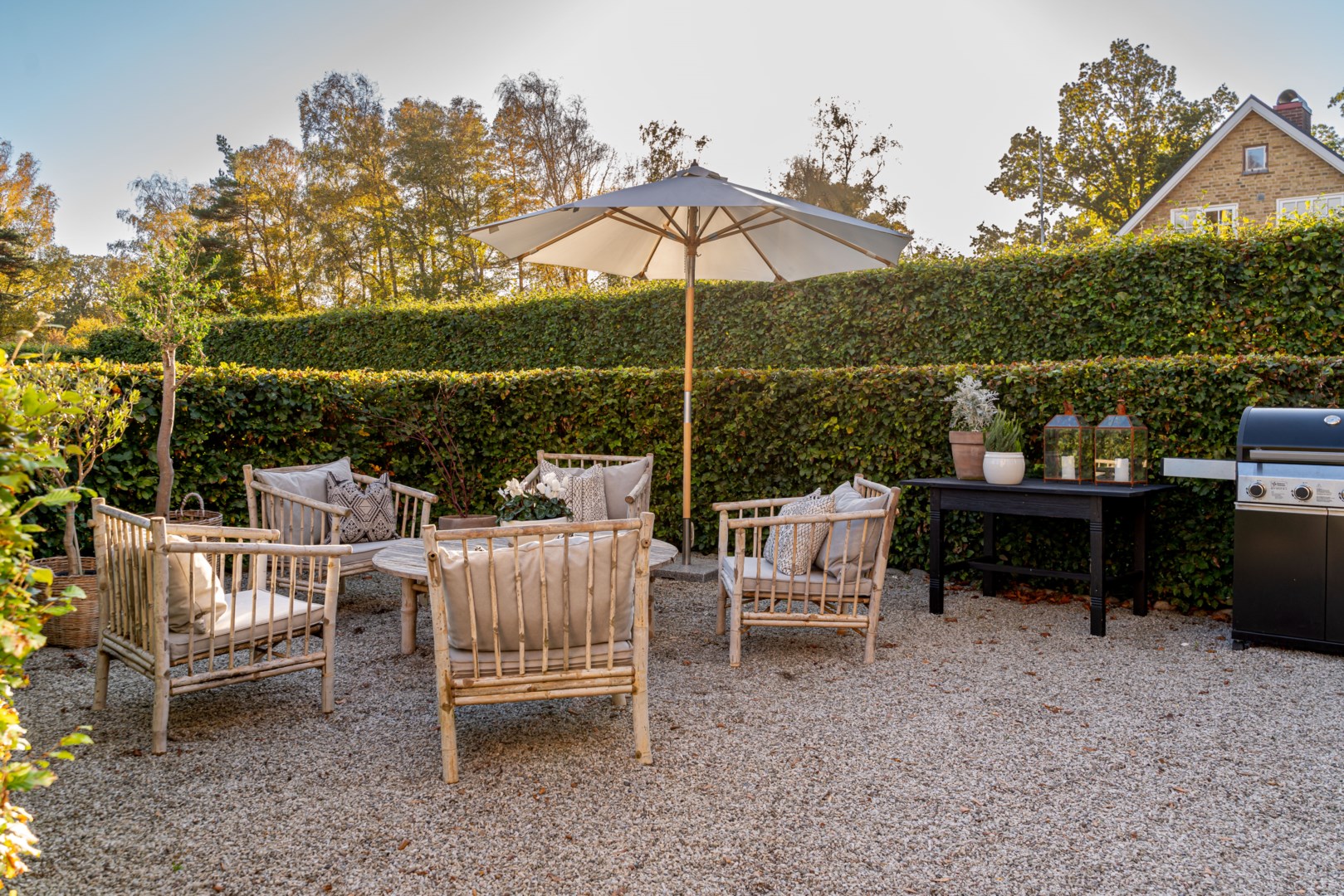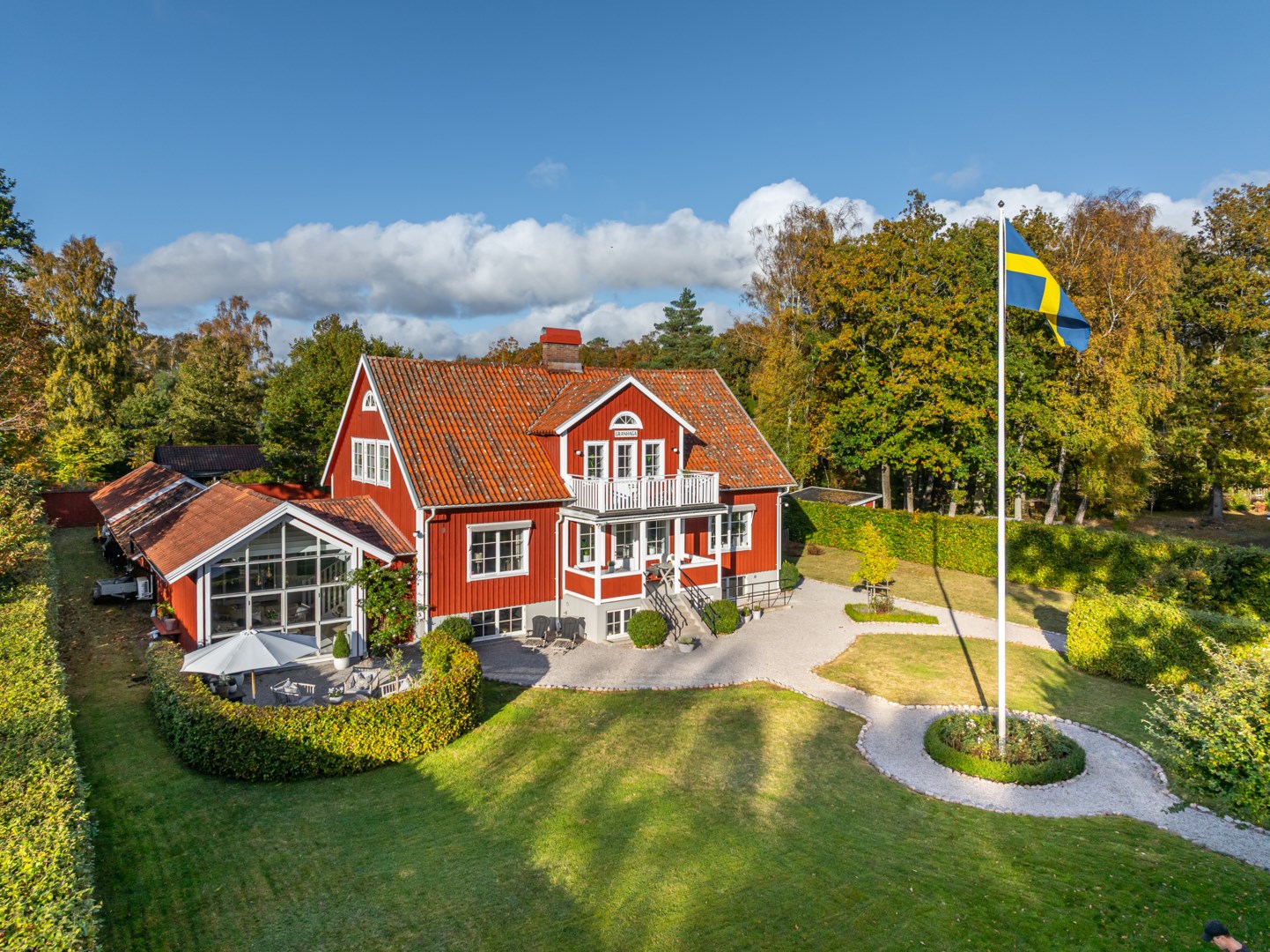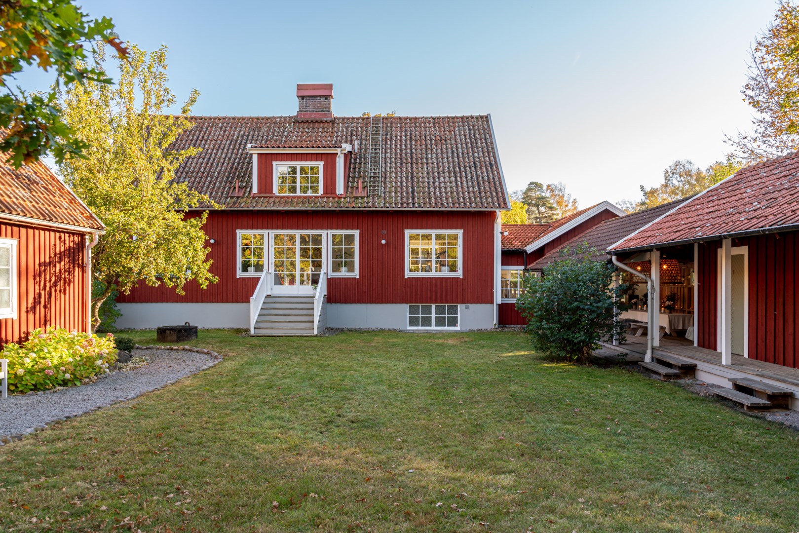 Trädgården är en privat, insynsskyddad omgiven av höga bokhäckar. Även den klassisk i sitt formspråk med knastrande grusgångar, rundel framför huset med flaggstång, vackra solgrindar, klättrande rosor och en stor köksträdgård. Olika trädgårdsrum som erbjuder både sol och skugga. Utöver huvudbyggnaden finns en charmig gästlänga med tre sovrum och ett badrum samt ett fristående gästhus som väntar på nästa ägares vision.