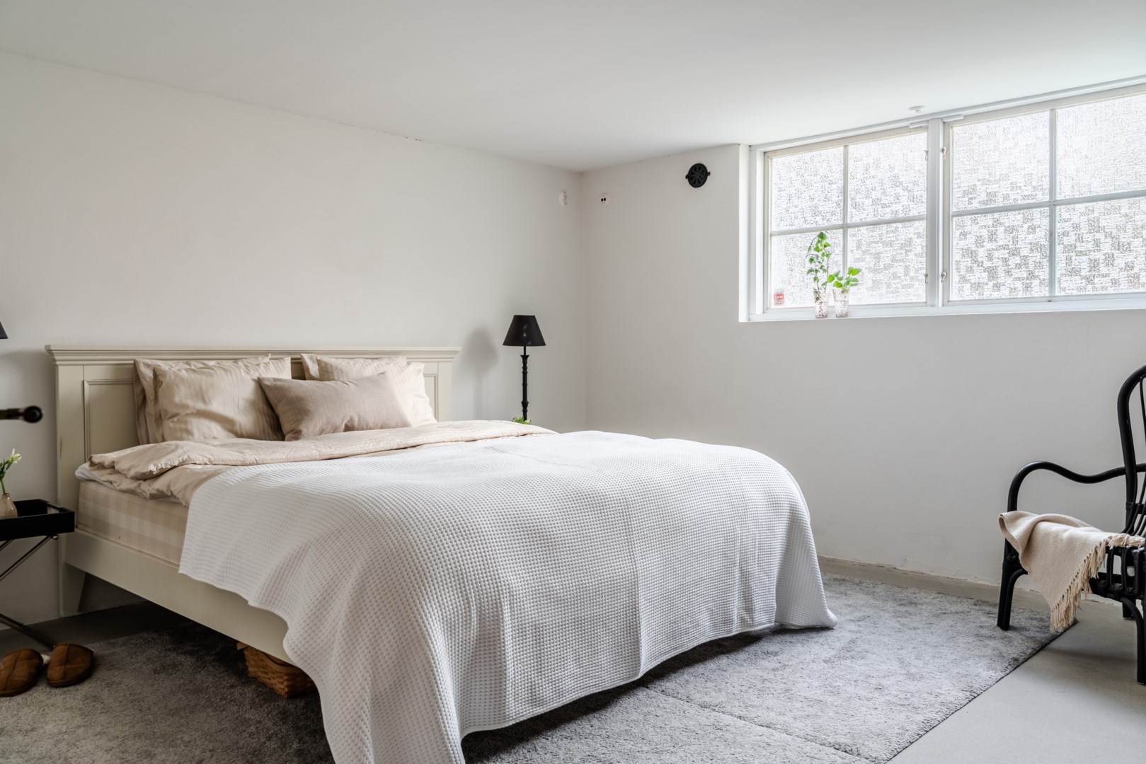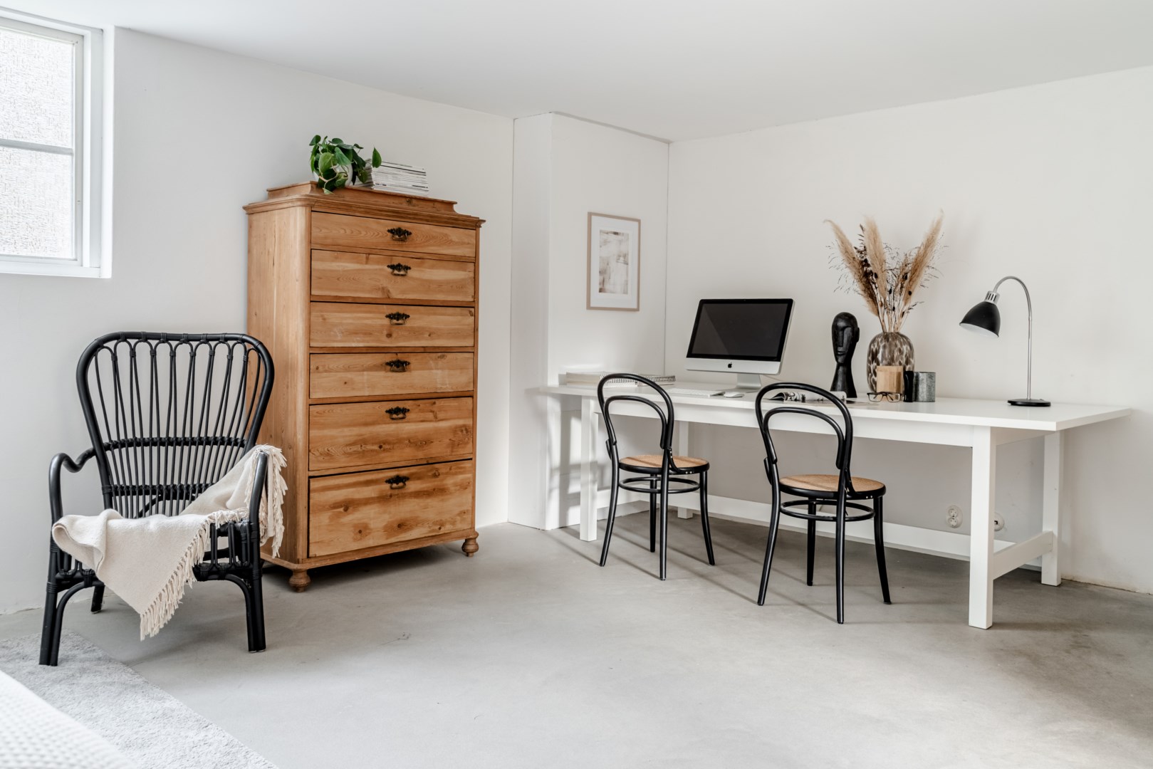 Källarplanet har golv i slipad betong med vattenburen golvvärme (nygjuten och isolerad bottenplatta), och en stilren, genomgående känsla av funktion och kvalitet. De stora spröjsade källarfönsterna ger ett härligt ljus i rummen.