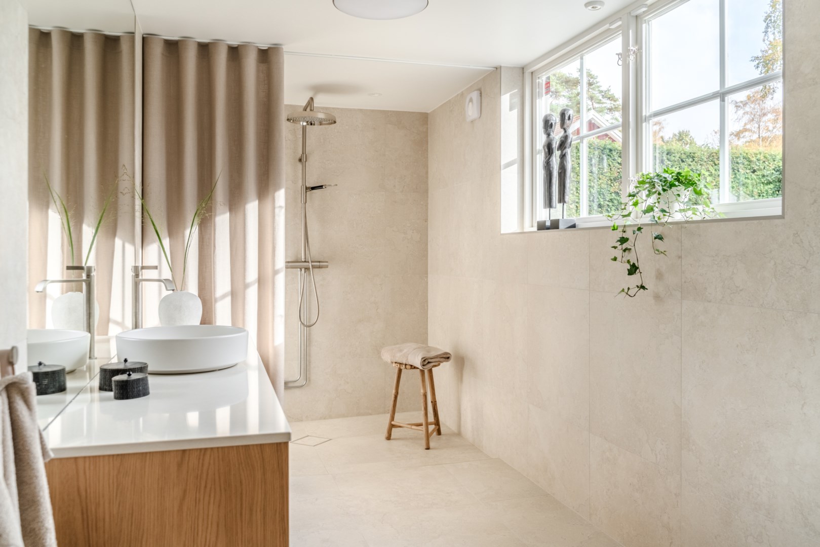 Det nybyggda badrummet (2025) är helkaklat i stora sandfärgade kakelplattor och utrustat med stor dusch, tvättställskommod i ek, bänkskiva i ljus stenkomposit, porslinshandfat, blandare från Tapwell och toalett från IFÖ. Fönster mot söder.