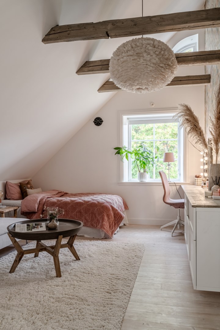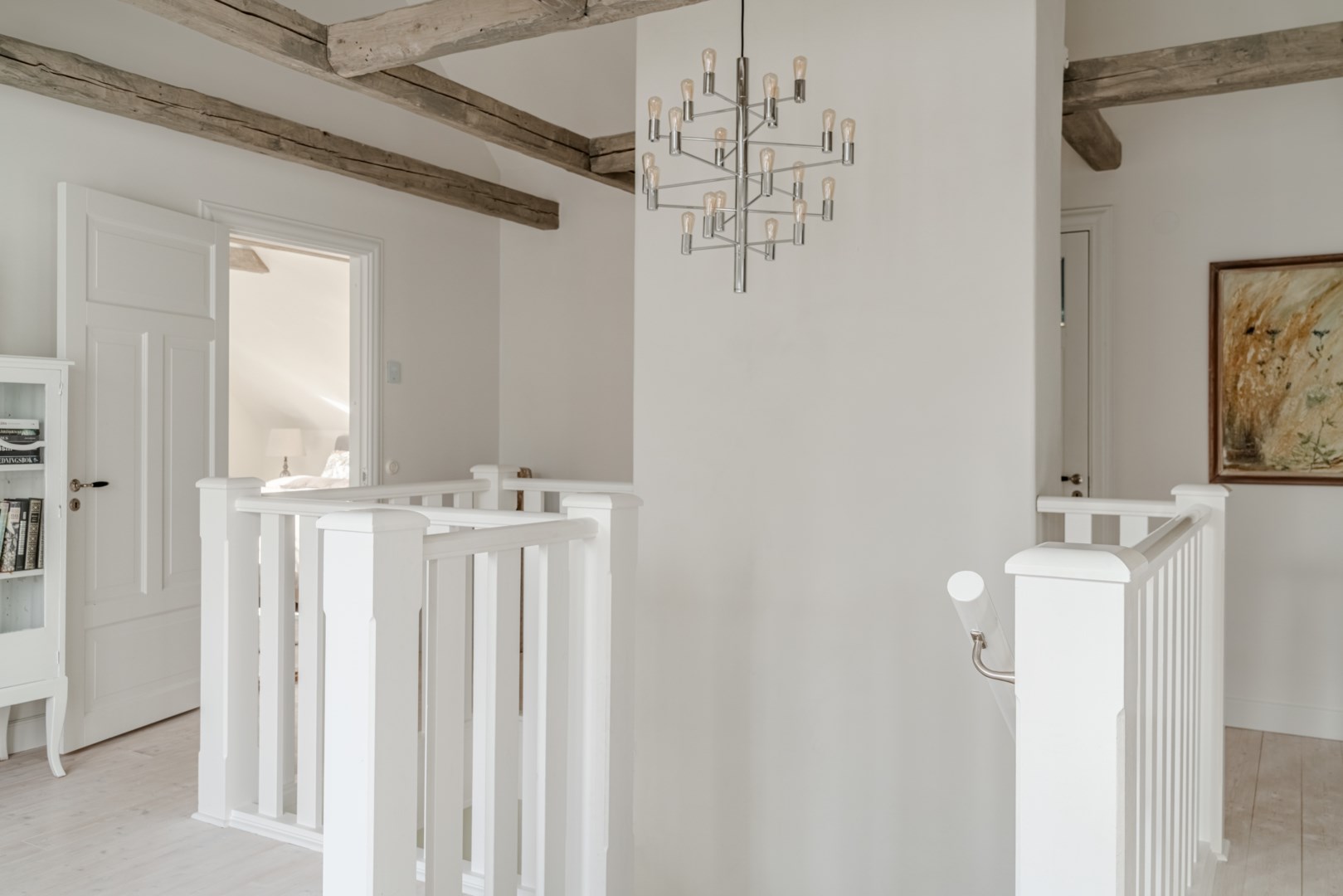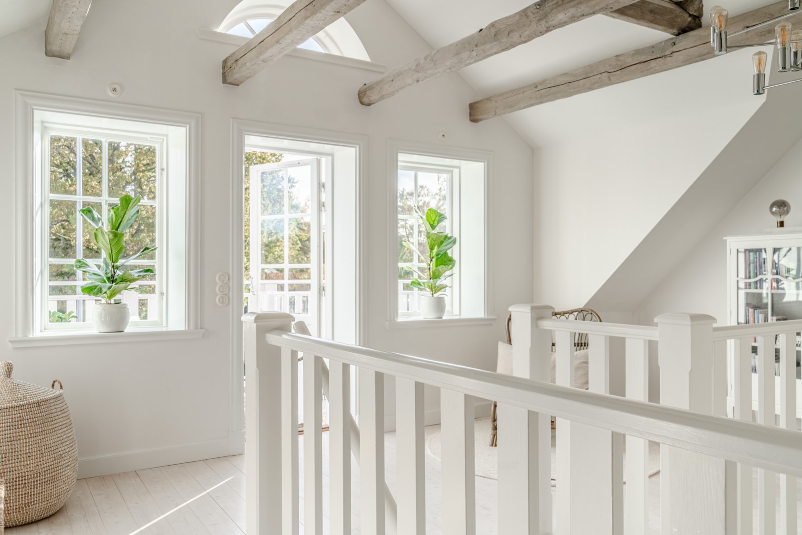 En platsbyggd trappa leder upp till ovanvåningen där samtliga rum har öppet upp i nock med frilagda takbjälkar (alla bjälkar har framdragen el för uplight-belysning).