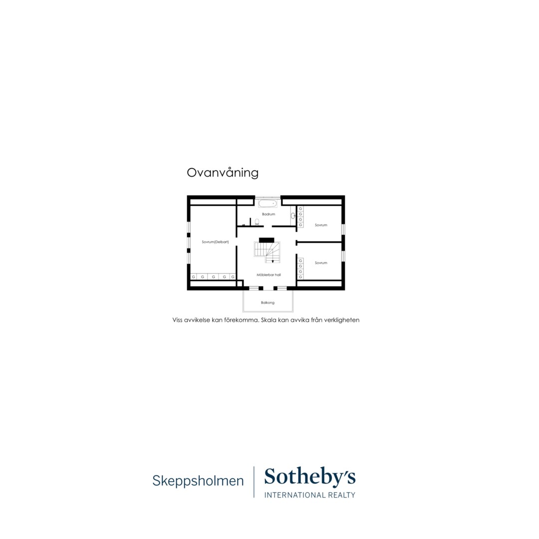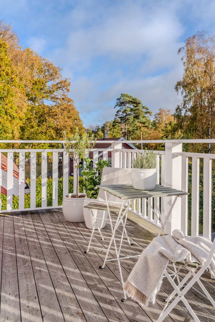 Övre plan har öppet upp i nock med frilagda takbjälkar. Här ligger tre sovrum som alla har platsbyggda garderober. En ljus möblerbar hall med anslutning till en takterrass i söderläge. En detalj som förstärker husets klassiska silhuett och tillför en fin kontakt med trädgården även uppifrån. Badrum i klassisk stil med golv i carrara marmor, kakel från Sekelskifte och inredning från bl.a. Engelska Burlington.