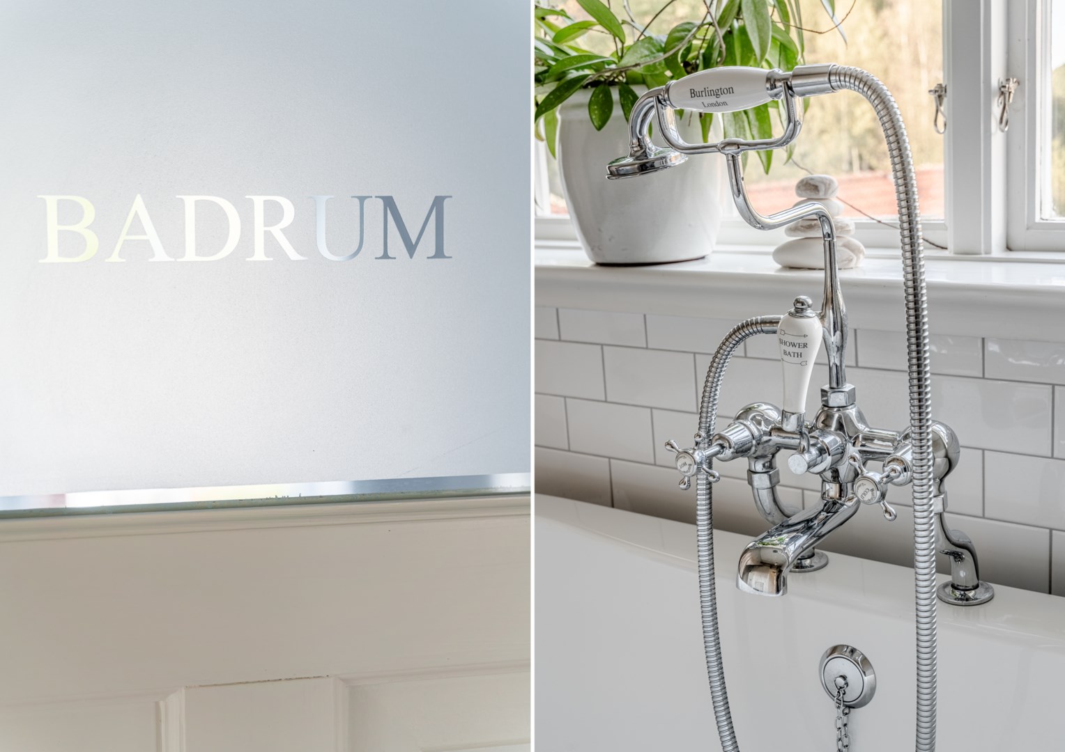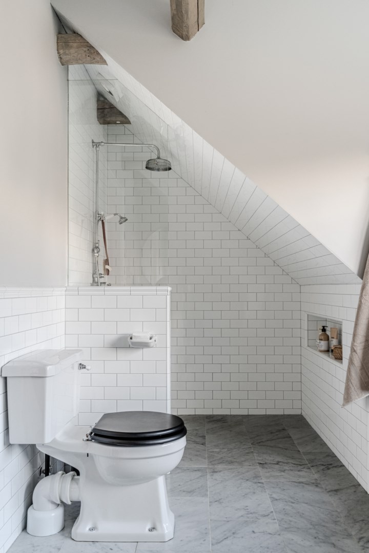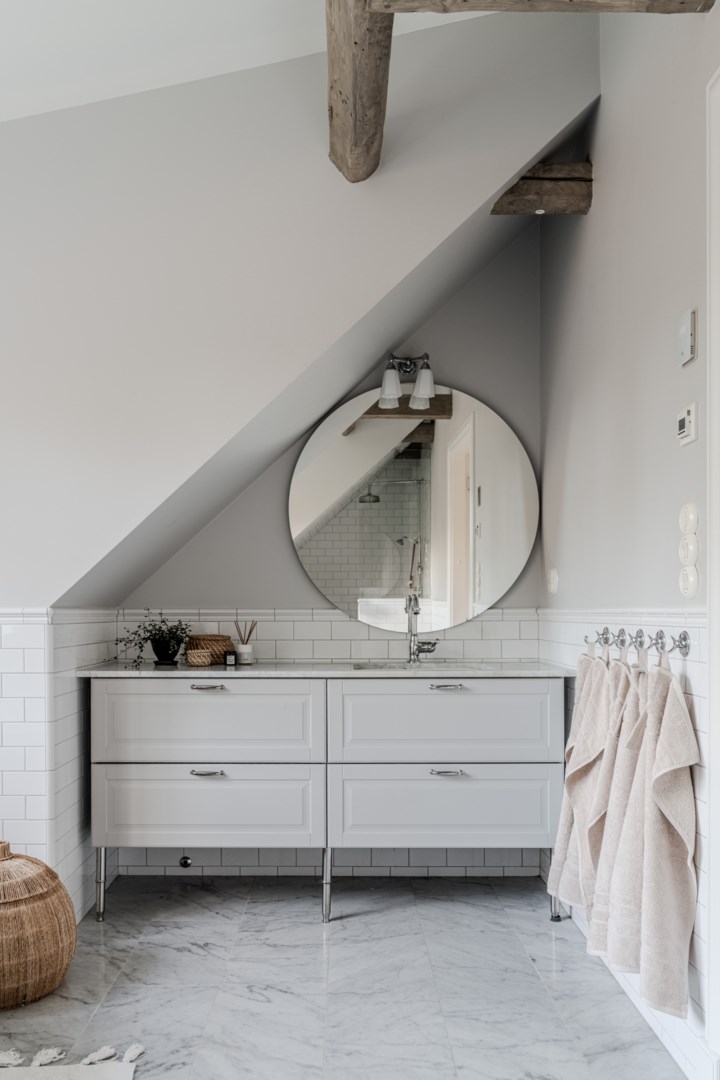 Badrummet är klätt i carraramarmor och kakel från Sekelskifte. Engelskt badkar på tassar, tvättställskommod med bänkskiva i carraramarmor och underlimmad vask från Duravit. Toalett och blandare från Burlington. Två fönster i kupa ger härligt ljusinsläpp och frilagda takbjälkar med infälld belysning ramar in rummet. För extra komfort finns både vattenburen golvvärme. Badrumsbelysning från Sekelskifte.