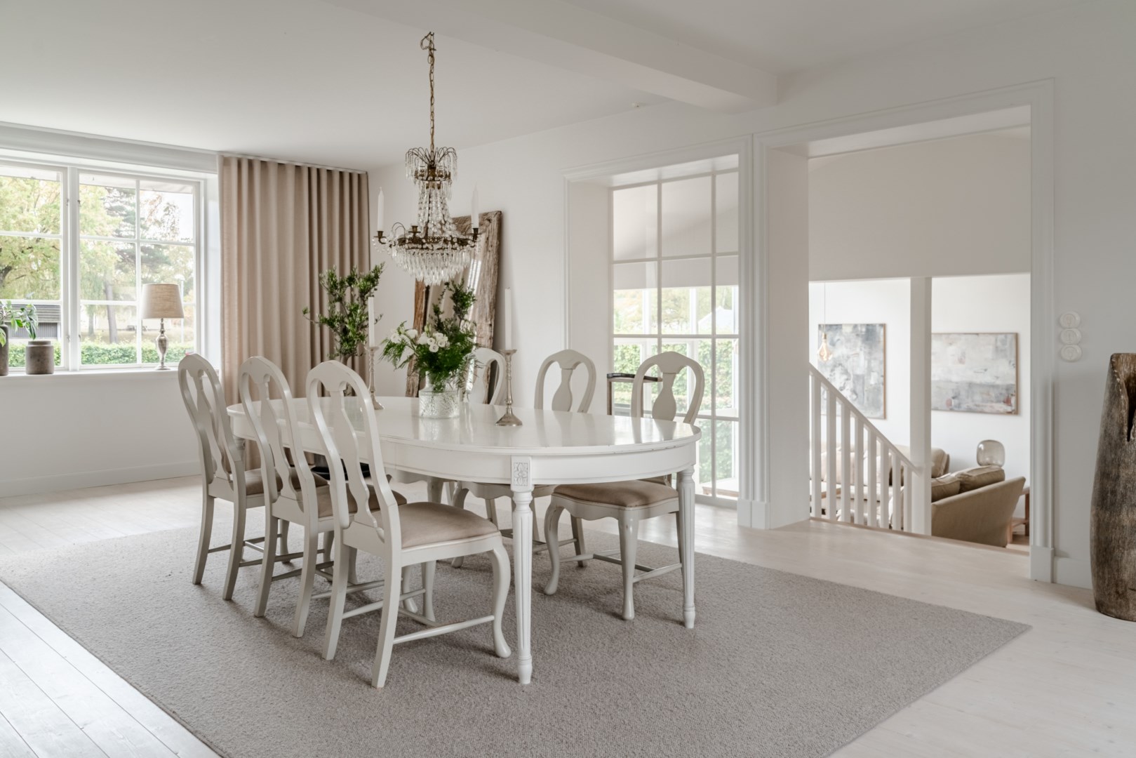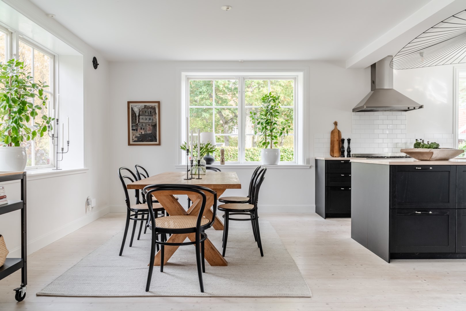 Matsalen, med fönster i både norr och söder, erbjuder gott om plats för stora middagar. Ett invändigt spröjsat fönsterparti och den vackra trappan förbinder rummet med vardagsrummet.