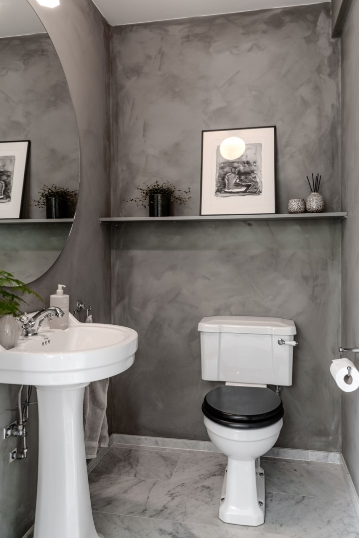 Gästtoaletten är elegant klädd i carraramarmor med väggar målade i kalkfärg. Porslin och armaturer kommer från engelska Burlington.