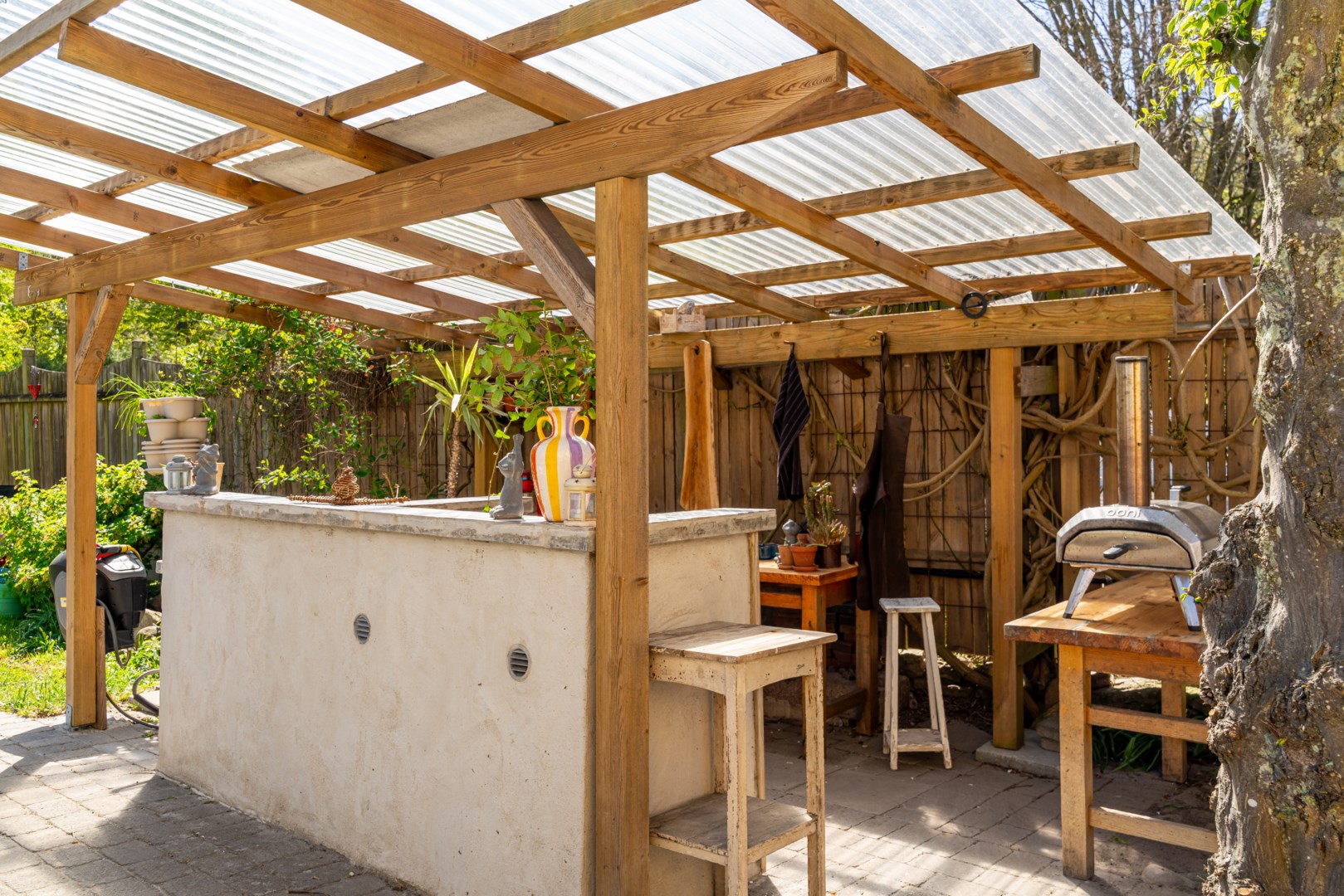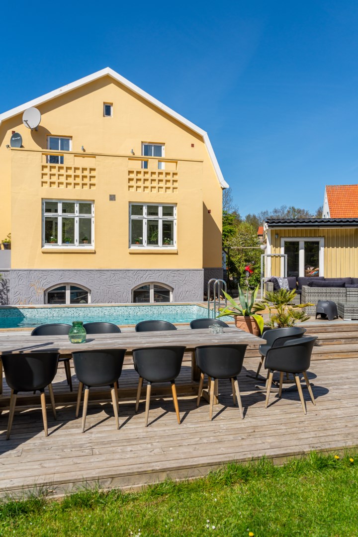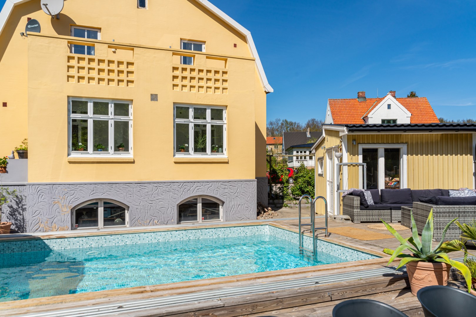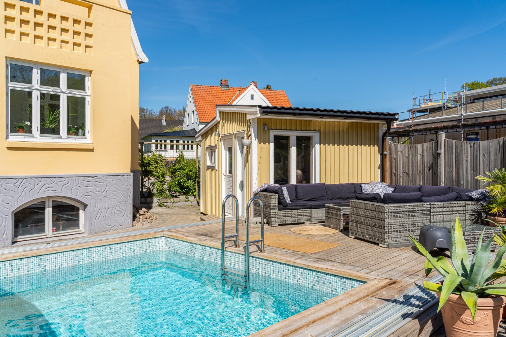 Tomten erbjuder ett uppskattat poolområde med intilliggande byggnad som passar utmärkt för kontor eller extra rum. Runt poolen finns plats för både solstolar, matbord och en sittvänlig loungedel där sommardagar och kvällar får ta sin tid. Det platsbyggda uteköket skapar en tydlig mittpunkt för samvaro och måltider under bar himmel. Trädgården är lummig och inramad av grönska, vilket ger platsen en avskild och rofylld karaktär.