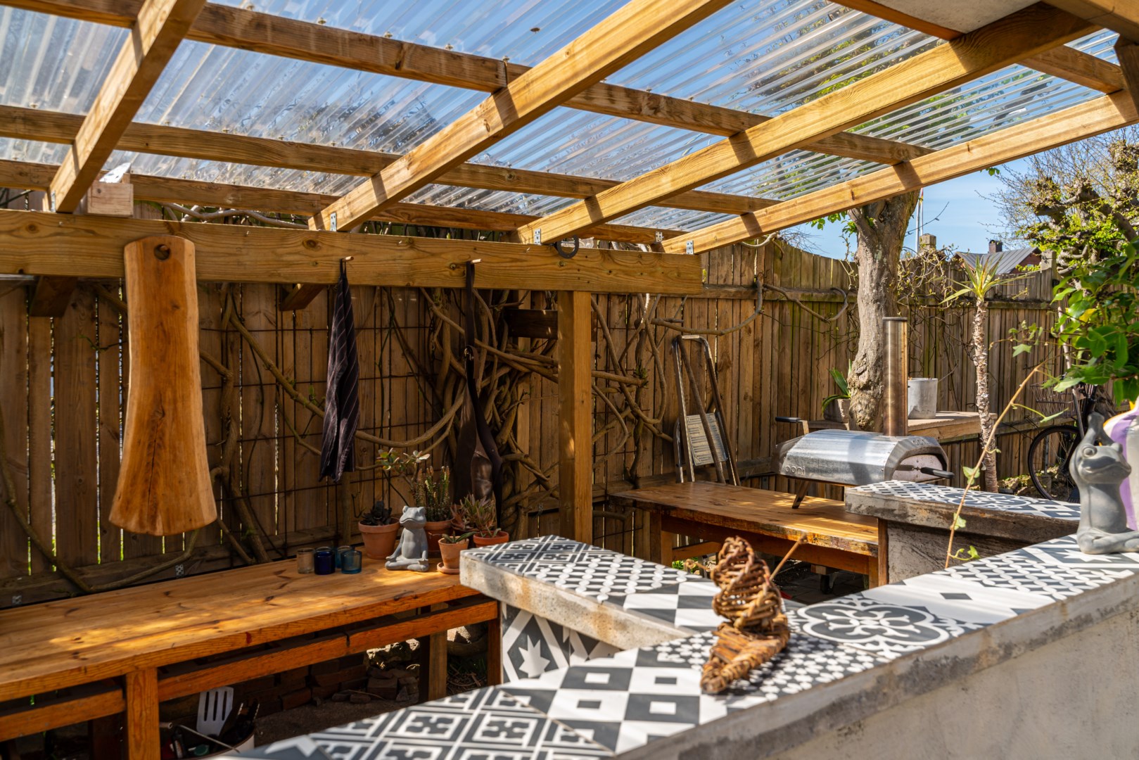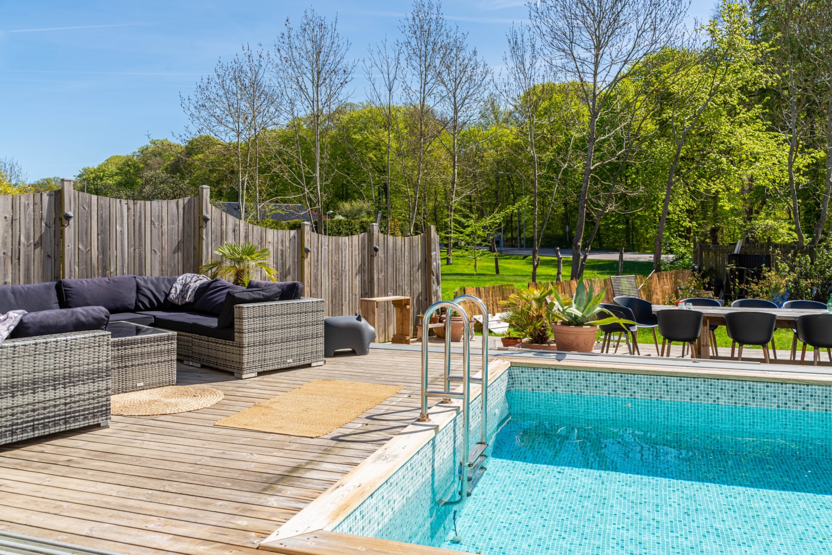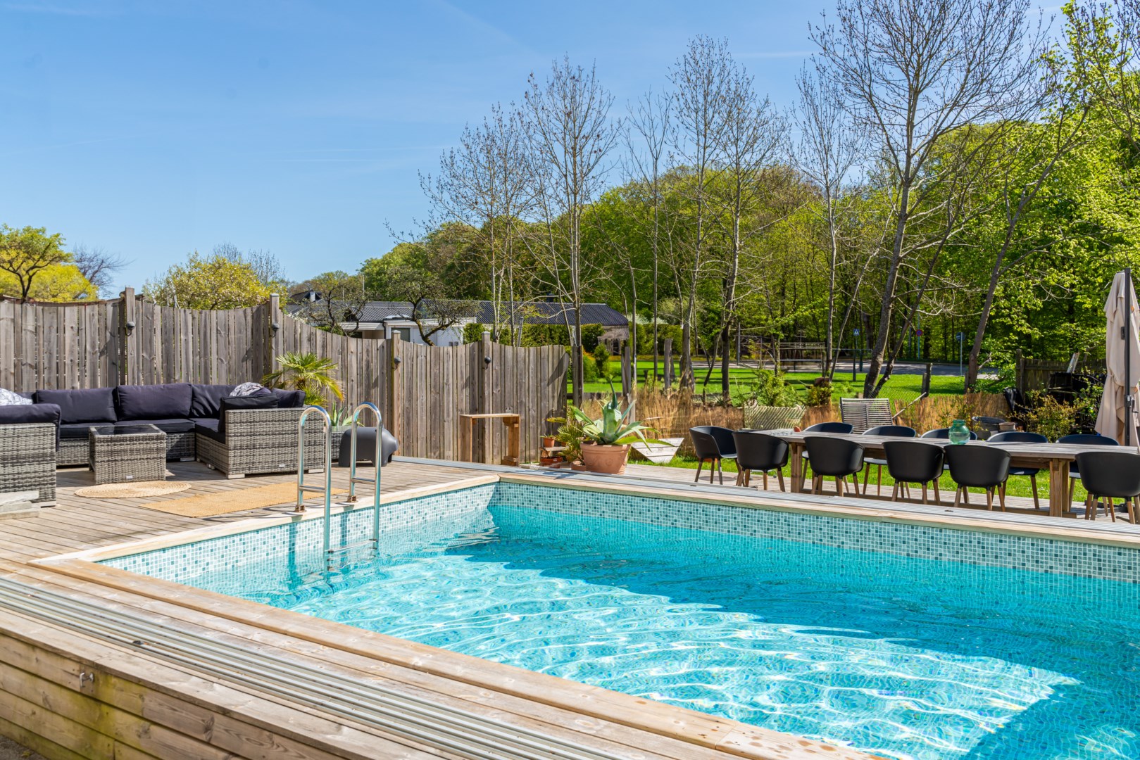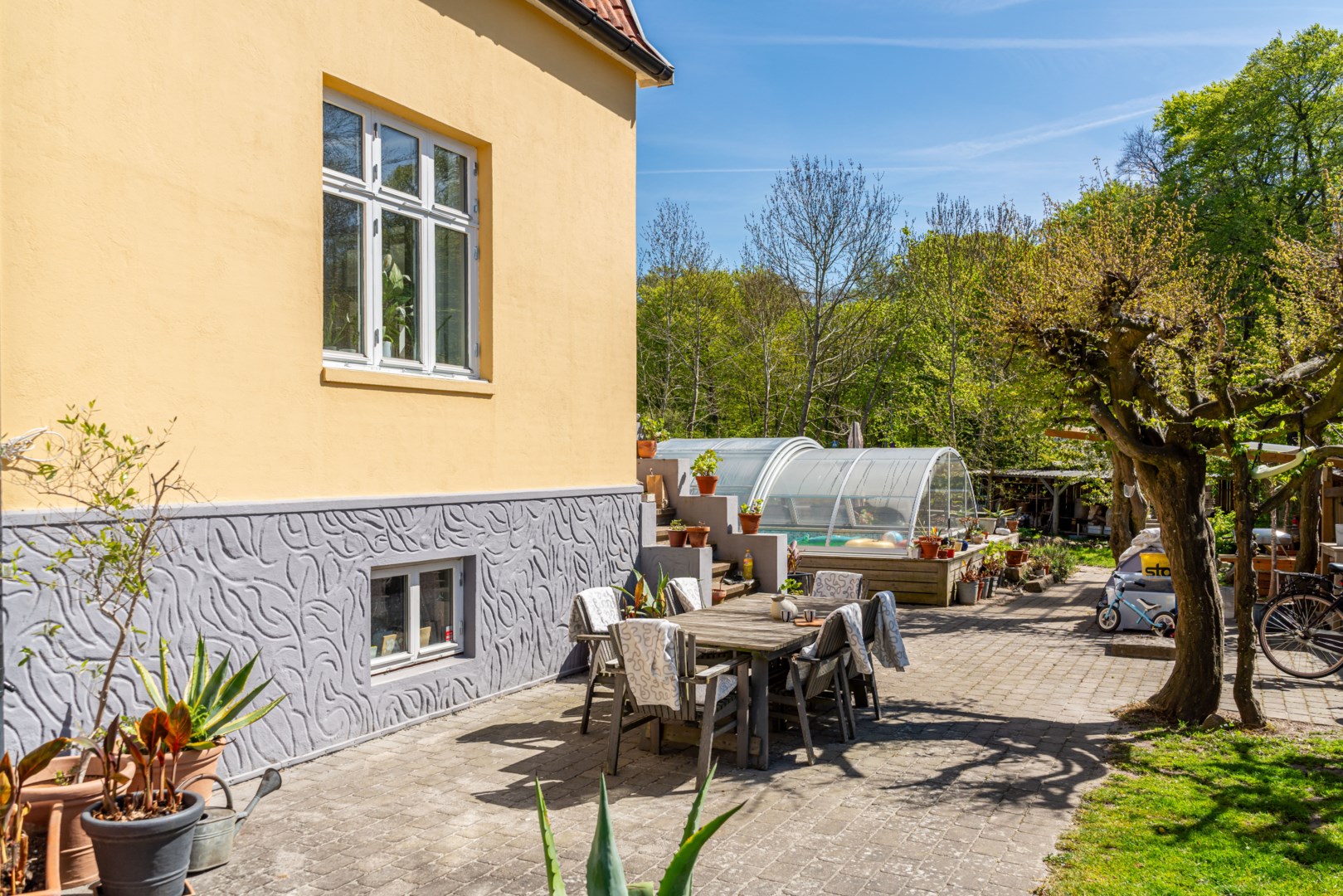 Tomten erbjuder ett uppskattat poolområde med intilliggande byggnad som passar utmärkt för kontor eller extra rum. Runt poolen finns plats för både solstolar, matbord och en sittvänlig loungedel där sommardagar och kvällar får ta sin tid. Det platsbyggda uteköket skapar en tydlig mittpunkt för samvaro och måltider under bar himmel. Trädgården är lummig och inramad av grönska, vilket ger platsen en avskild och rofylld karaktär.