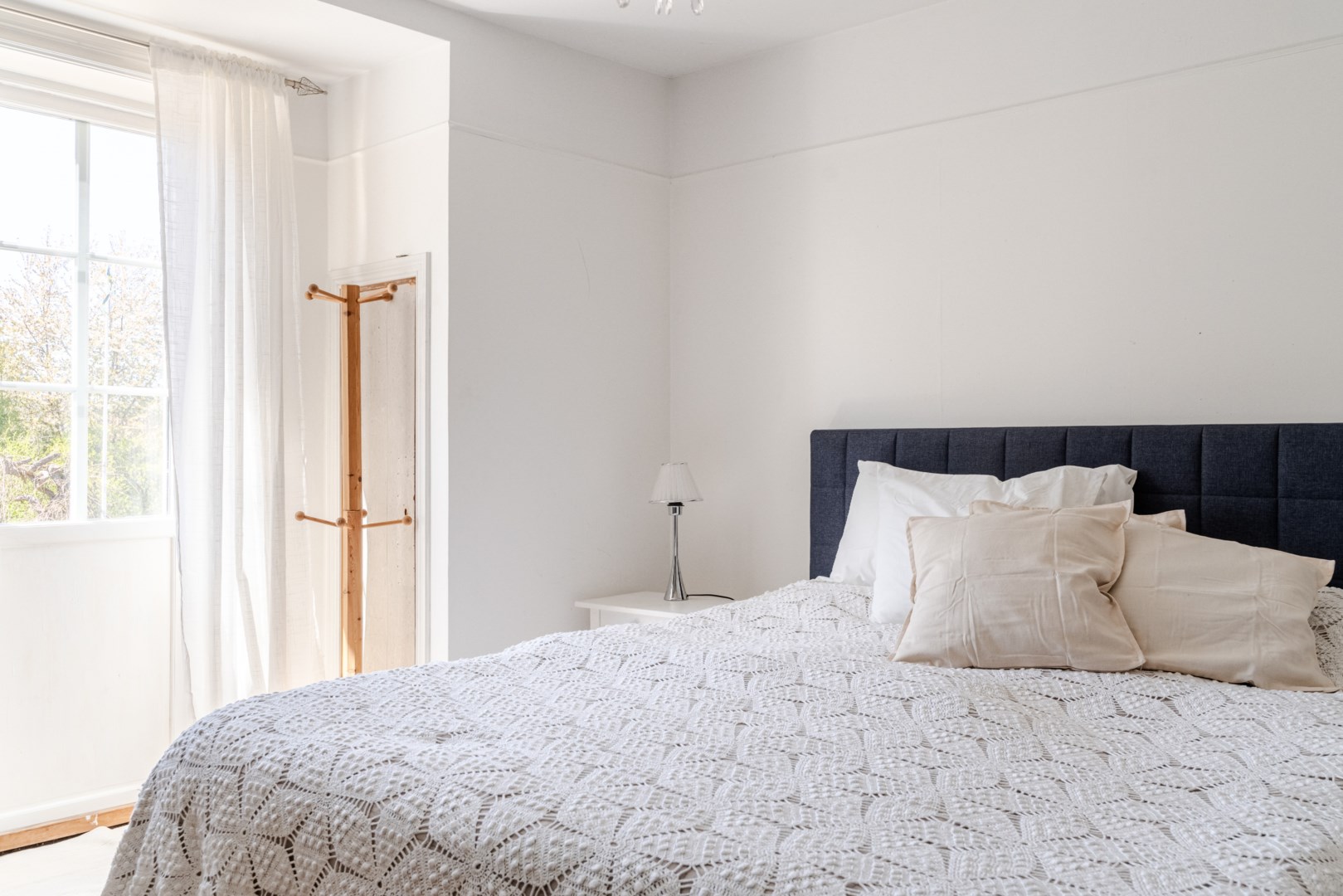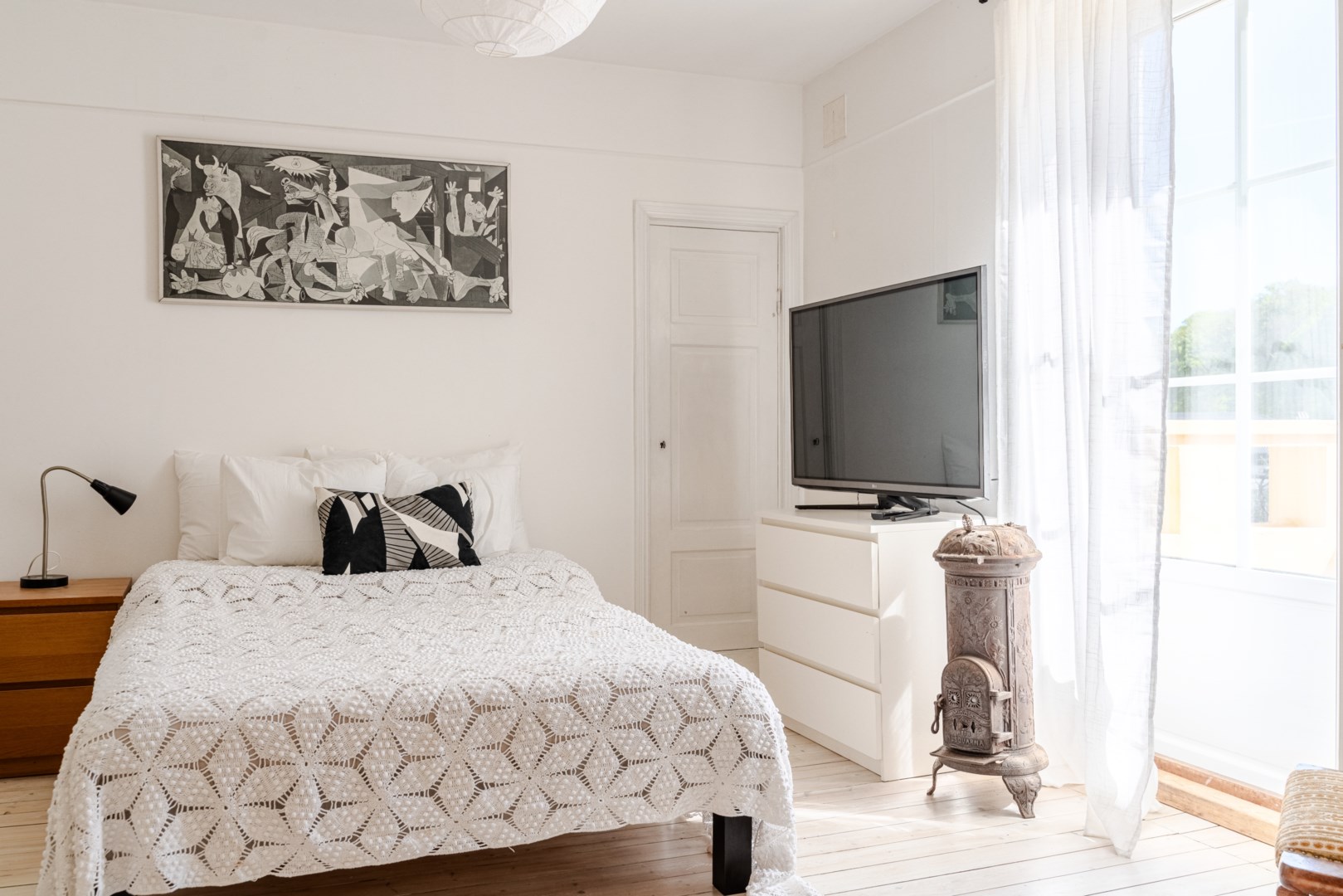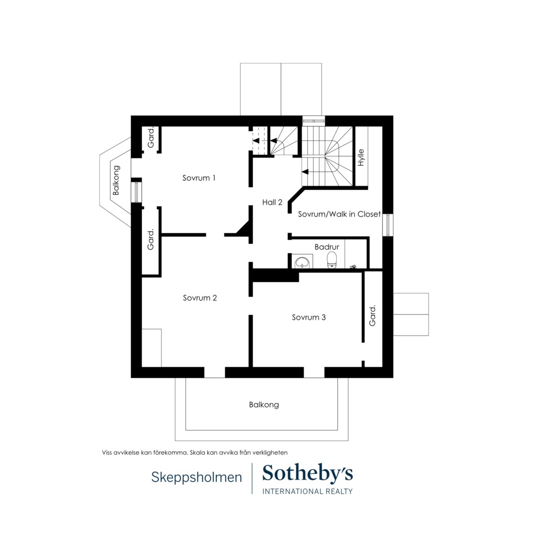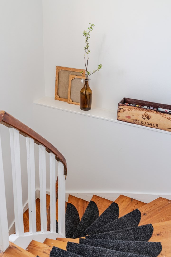 Ovanvåningen bjuder på tre sovrum med fin rymd och smart fördelning. Två av rummen har direkt access till varsin balkong, varav det ena med ovanligt stor yta och fri vy över grönskan, det andra med möjligheten att öppna upp och släppa in naturen, vilket skapar en fin förlängning av rummet. Från ovanvåningen nås även villans råvind via trappa, en extra yta med utvecklingsmöjlighet för den som önskar mer.