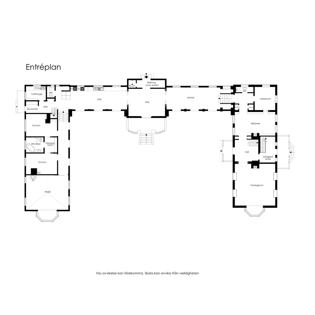 Den inre hallen imponerar med en takhöjd på 5,15 meter och öppnar upp sig mot matsalen och köket. Franska dörrar leder ut till trädgården och havet, med en stenlagd terrass utanför, komplett med eleganta fundament och balustrad. En stentrappa leder ned till en grusbelagd gång som tar dig mot vattnet, omgiven av en pittoresk lindallé.
